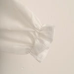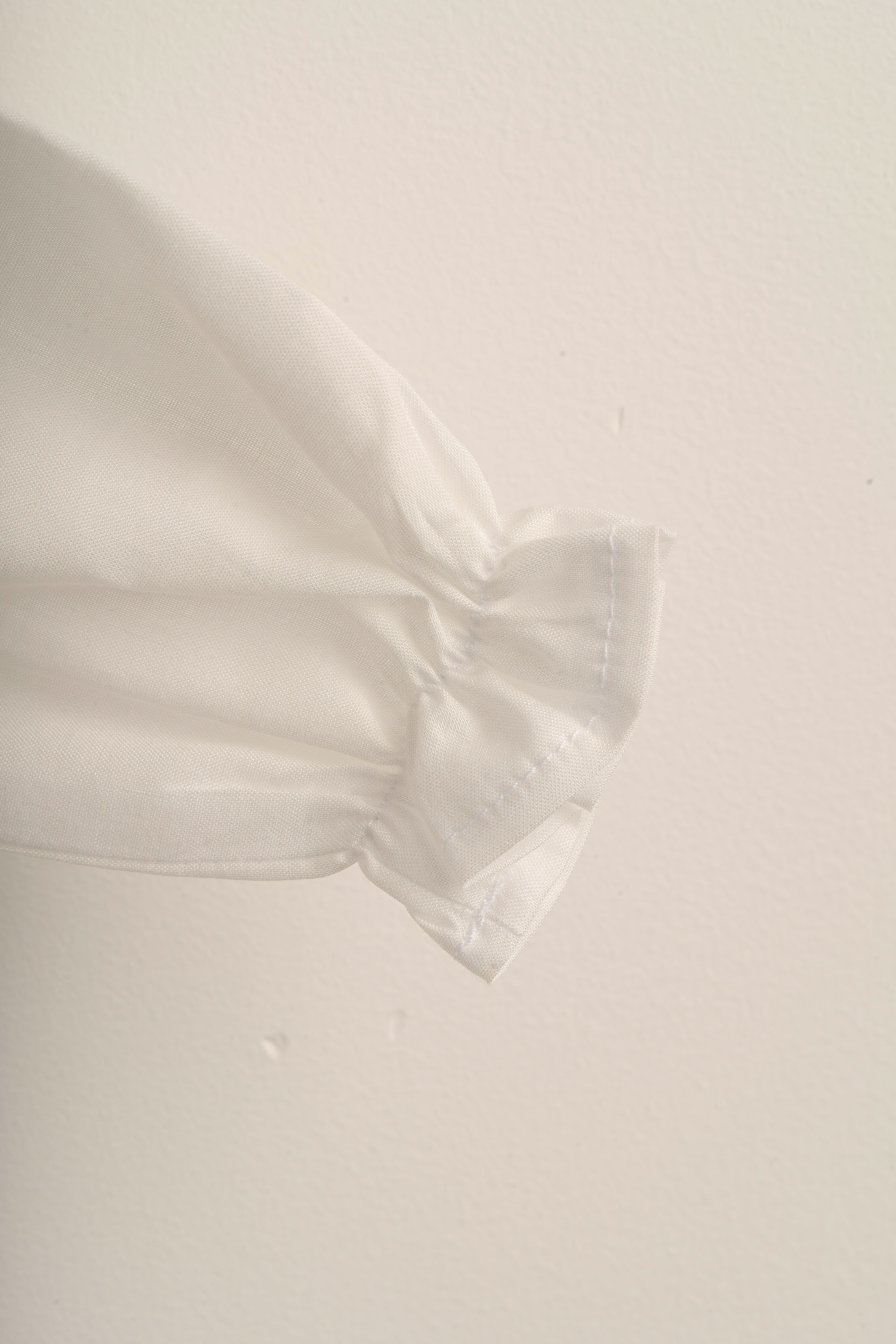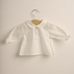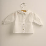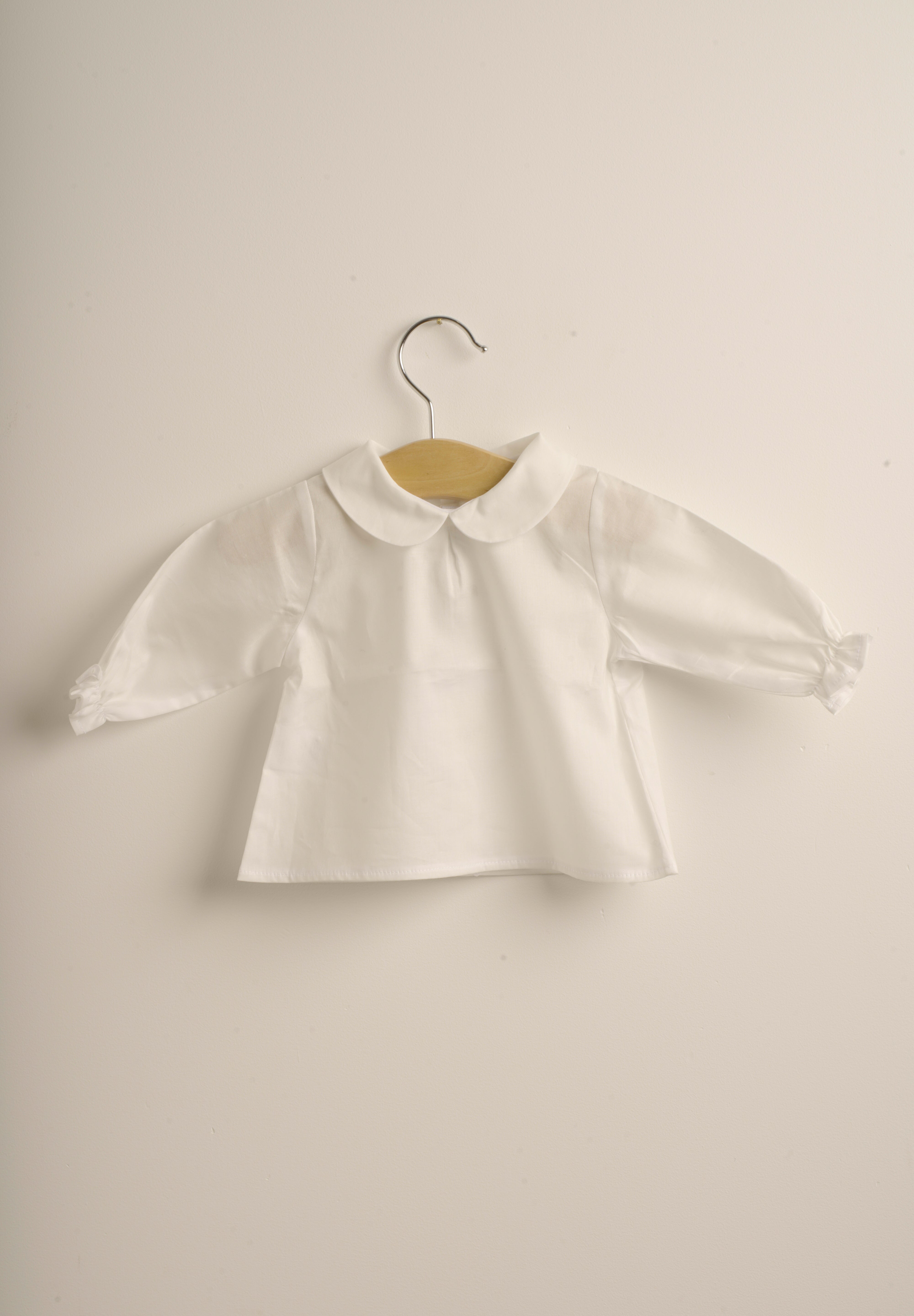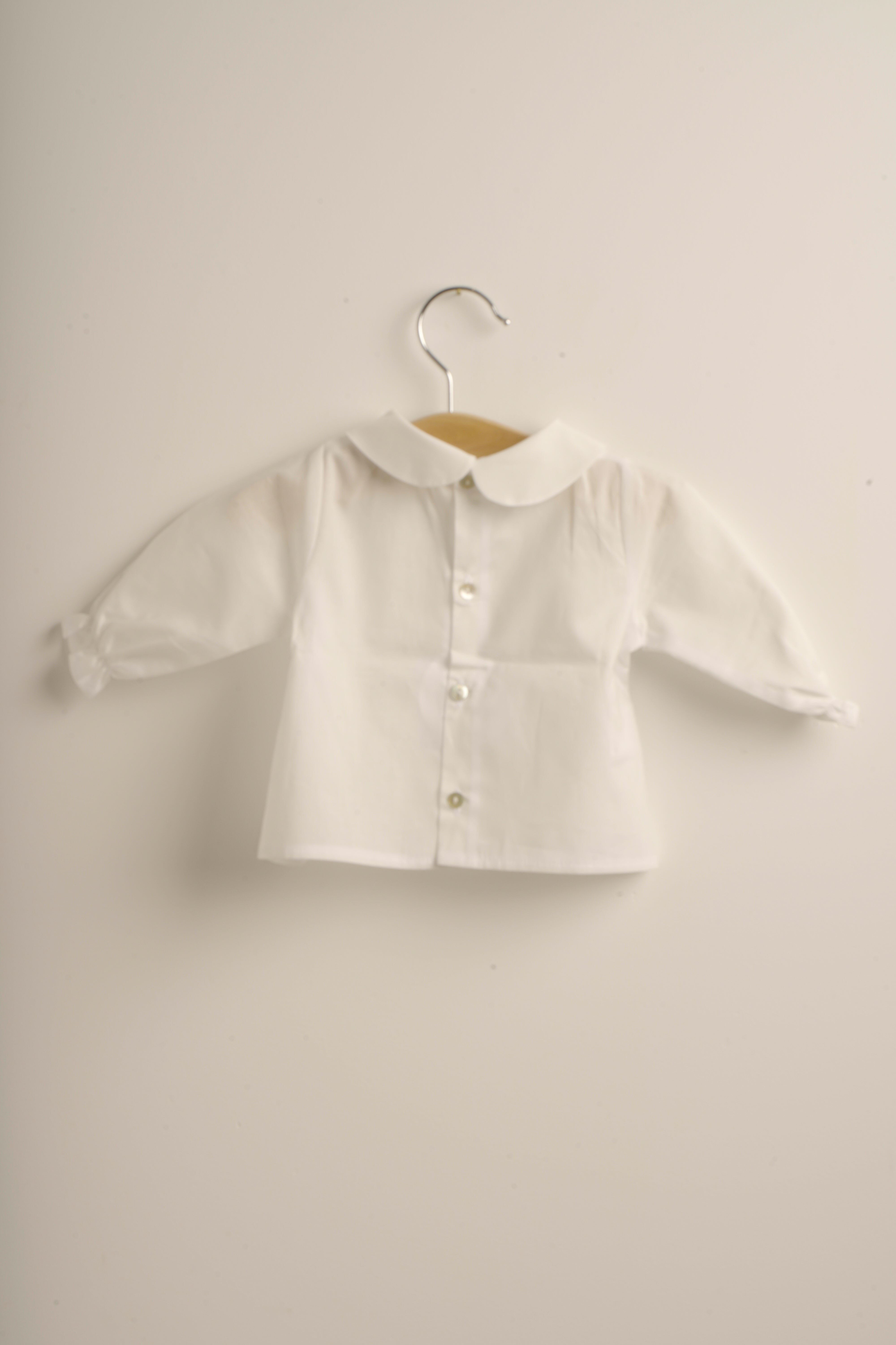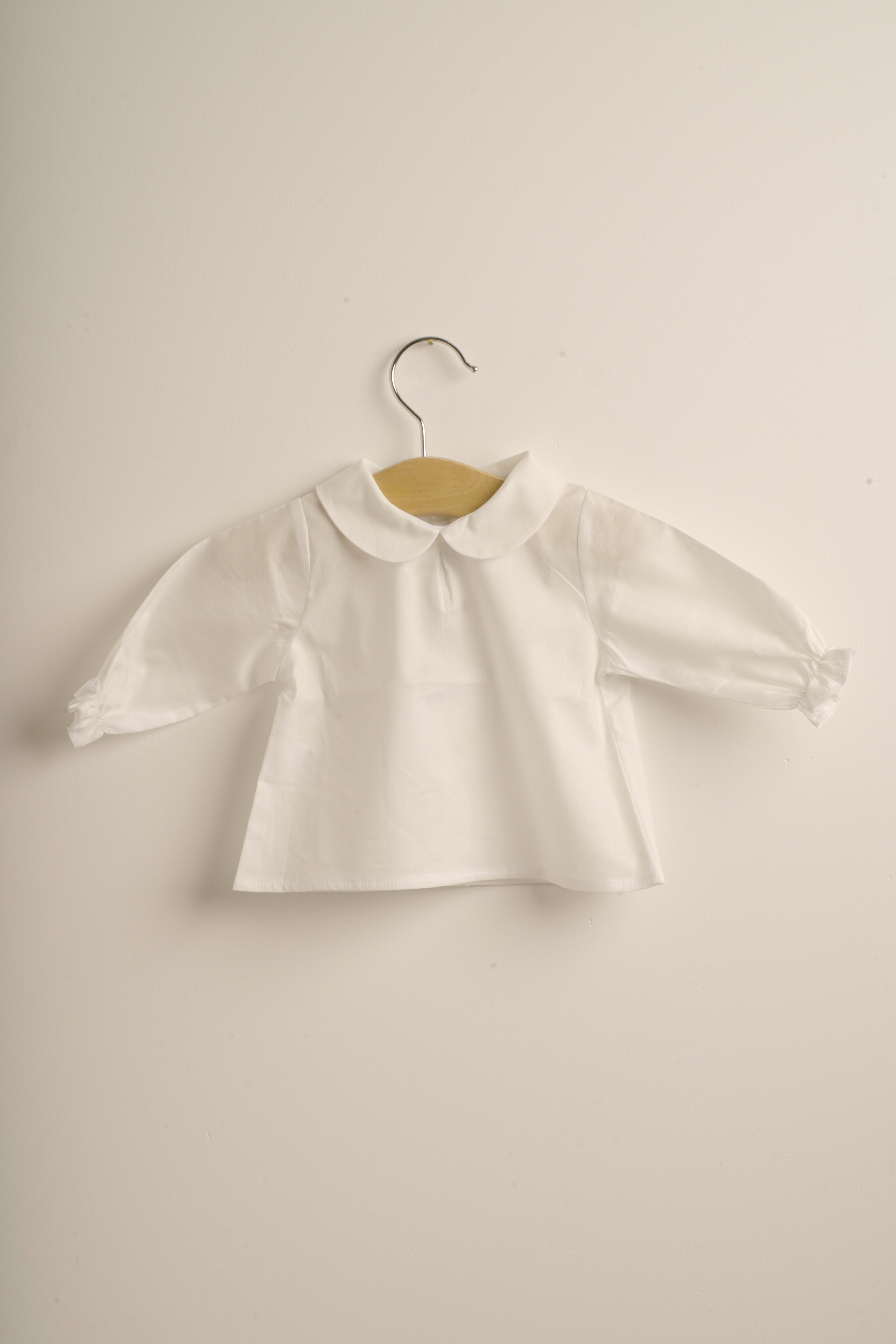 Blusa básica de color blanco, manga larga y con cuello redondo bebé. Lleva botones nácar en la parte atrás.
