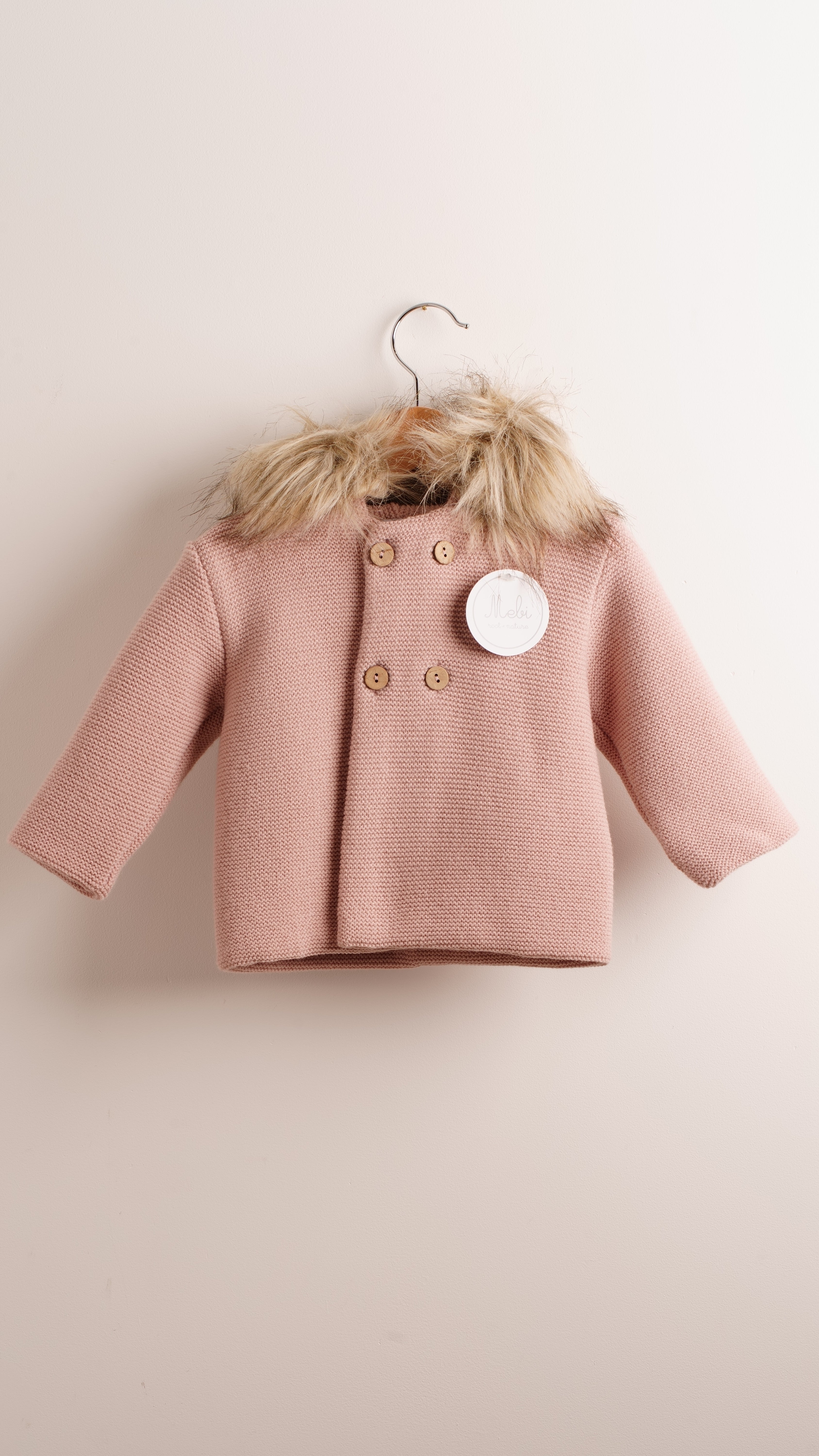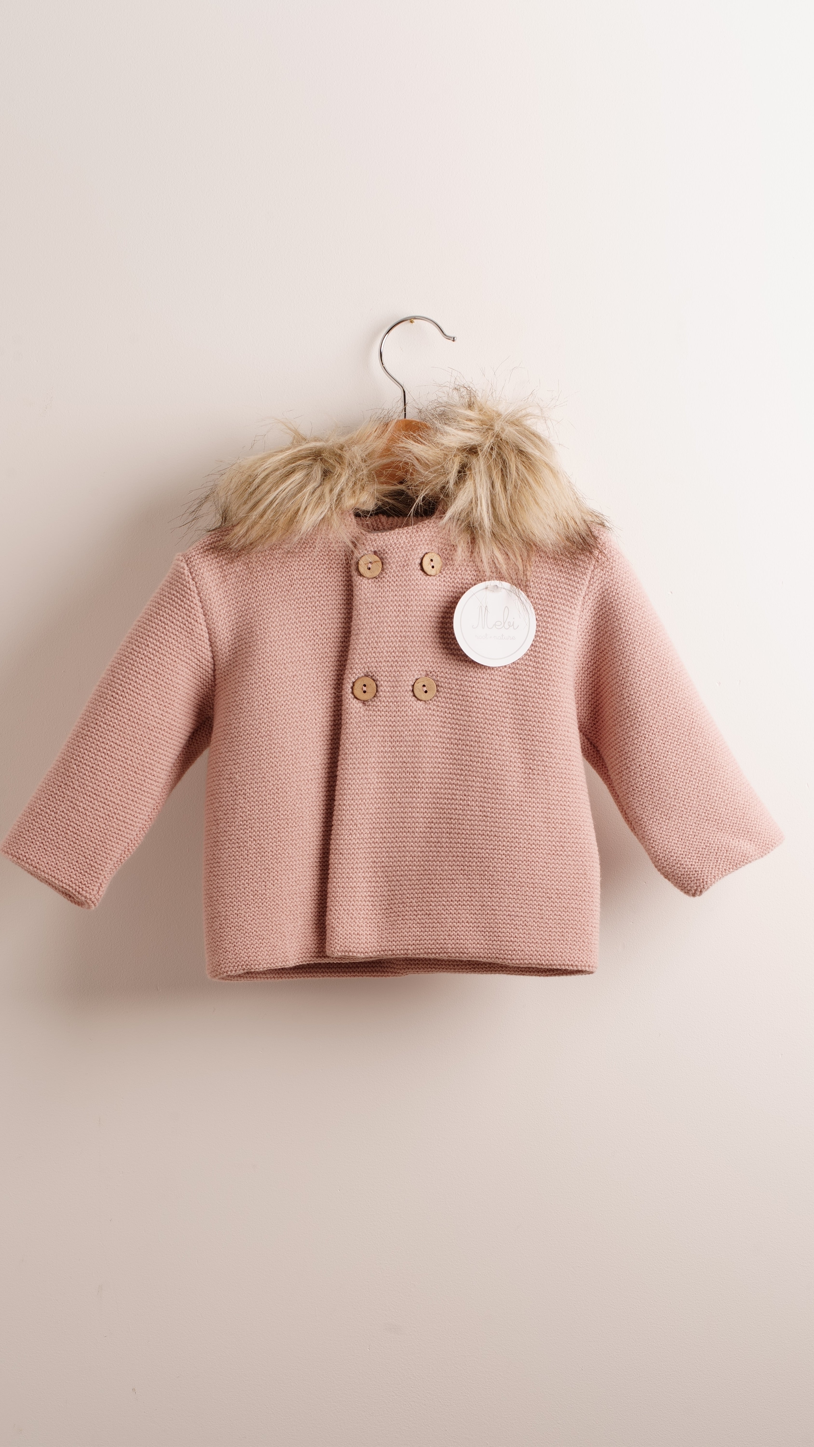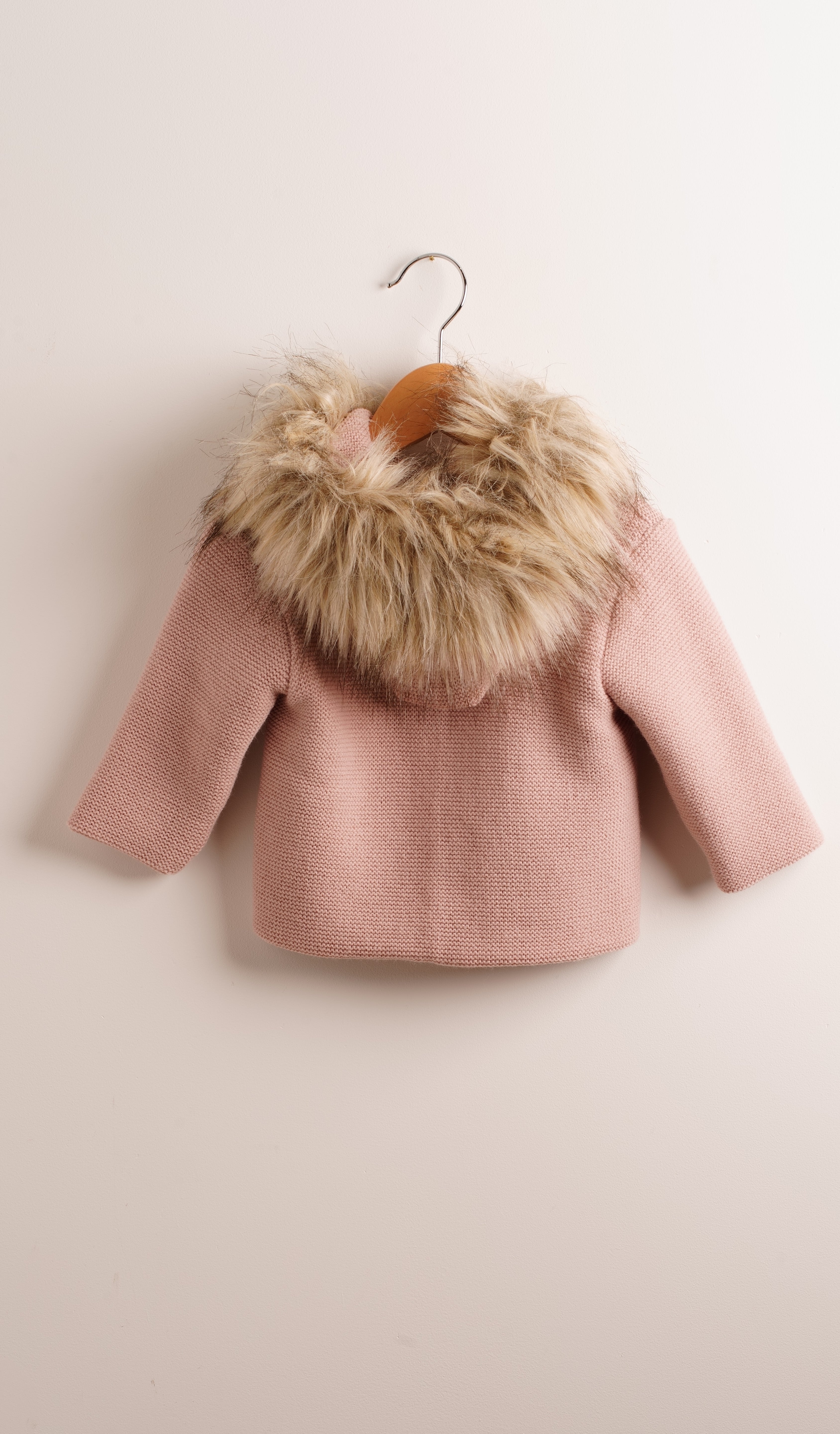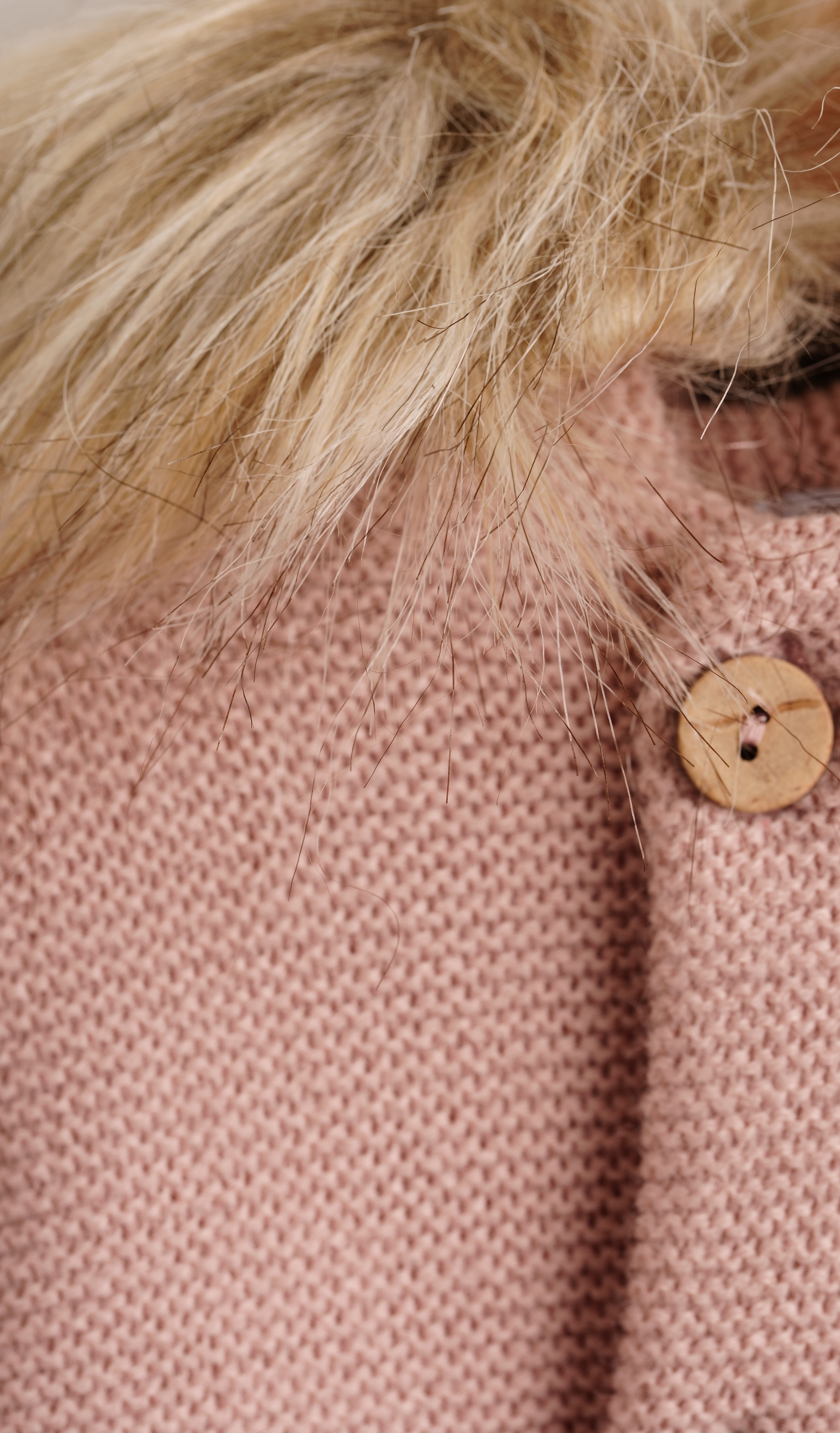 Capucha de doble punto color nude con pelo artificial. El pelo se quita para poder lavar la prenda. Combínalo con nuestros gorros a juego.