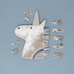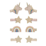 Pack de 8 clips de pelo: dos unicornios, dos arcoíris y cuatro estrellas. Todos son de colores pastel y llevan un toque de brillo. Son ideales para pelo fino, tanto para niñas pequeñas como para mas grandes.
