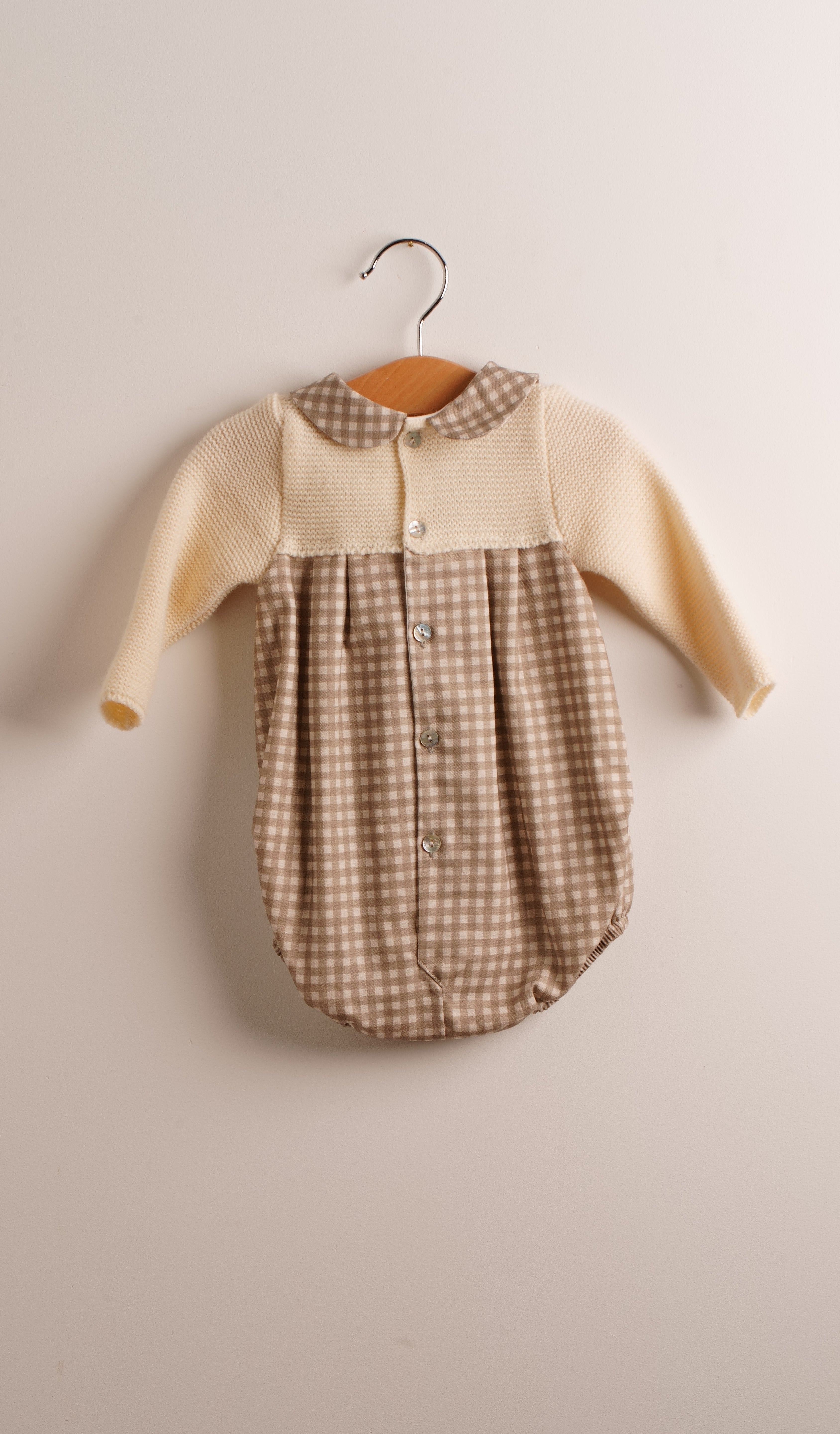 Pelele de punto hueso combinado con tela cuadritos beige y hueso. Lleva botones nácar en la parte atrás y abajo para facilitar el cambio.