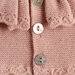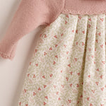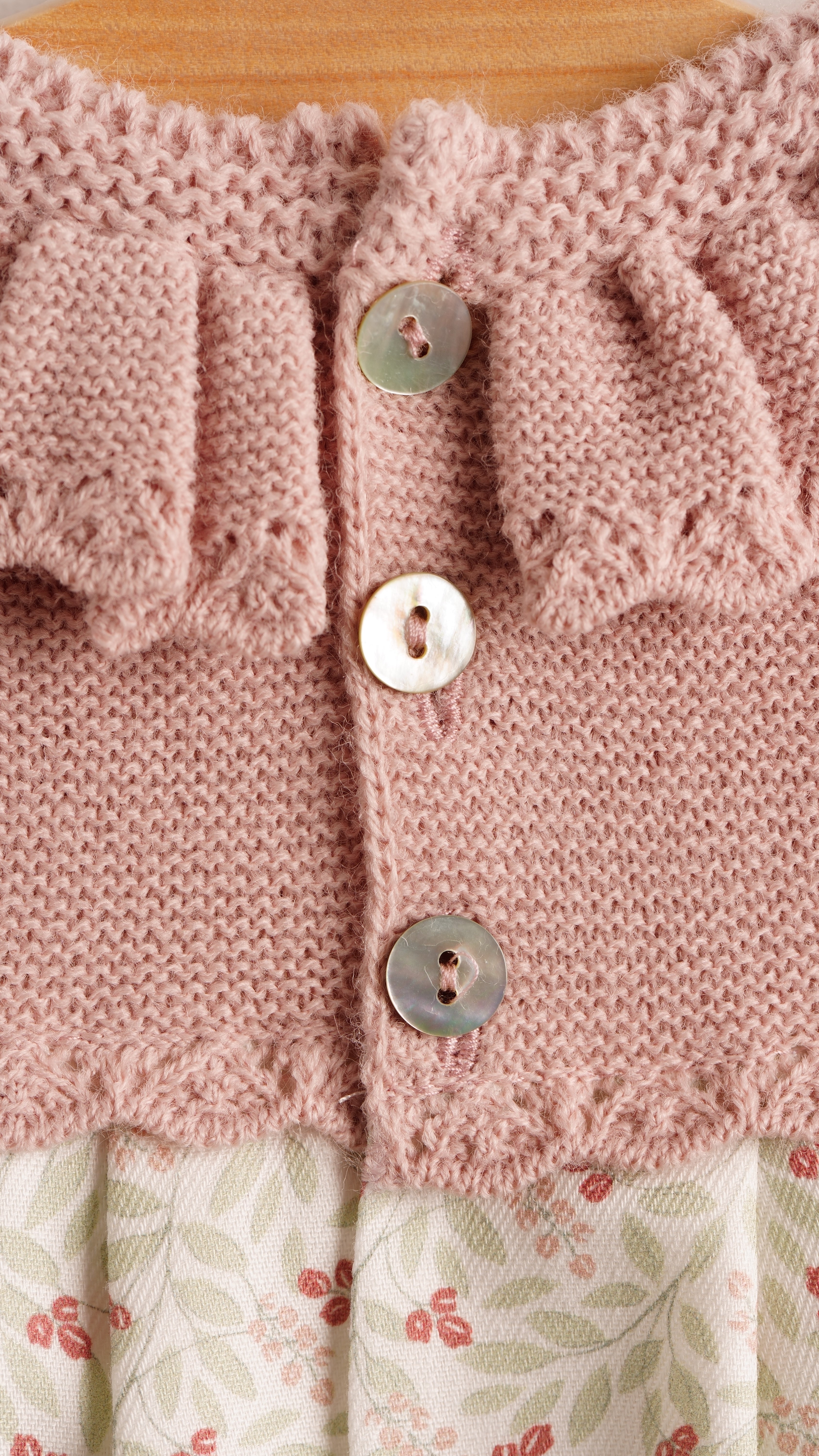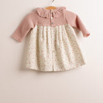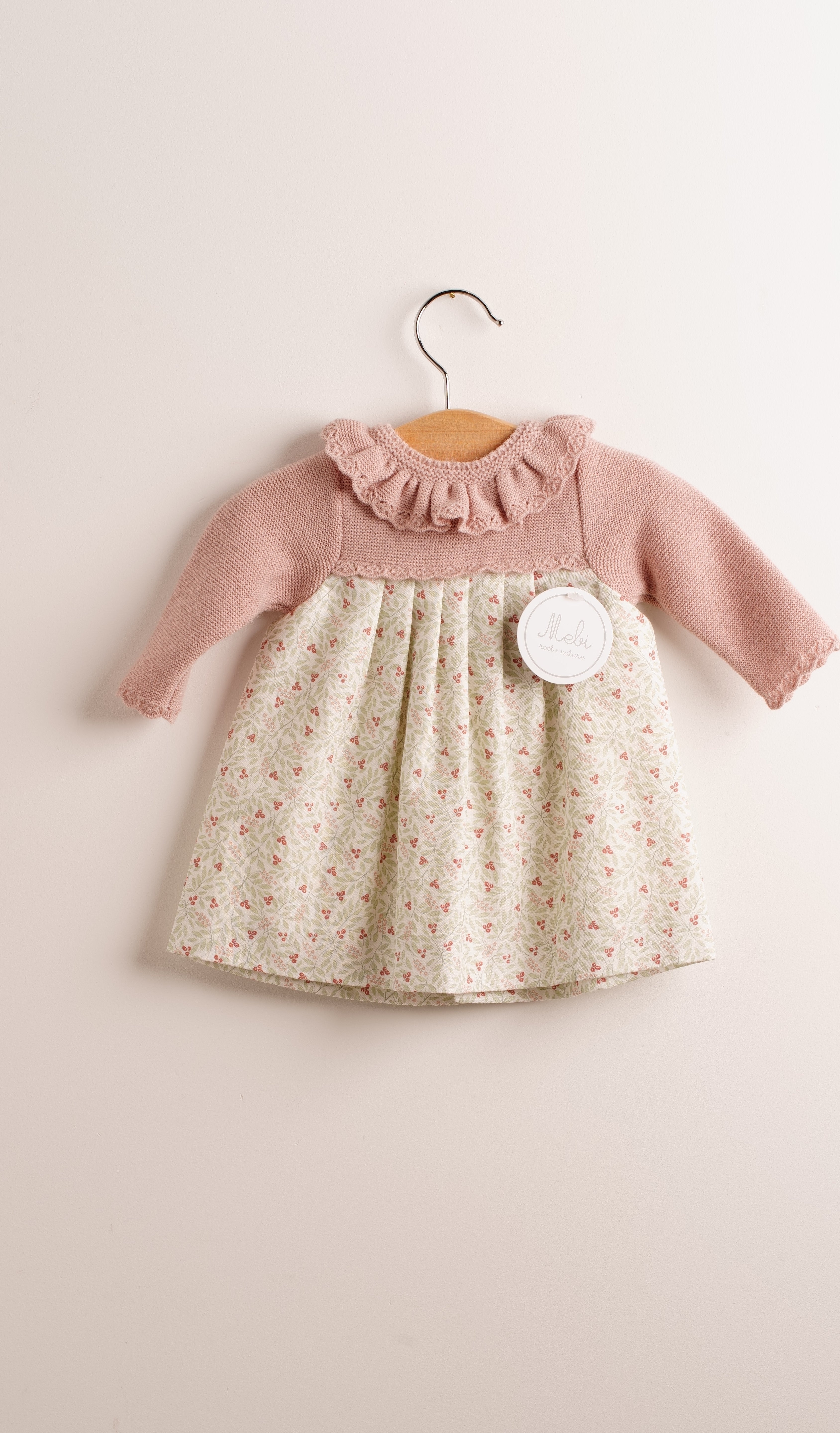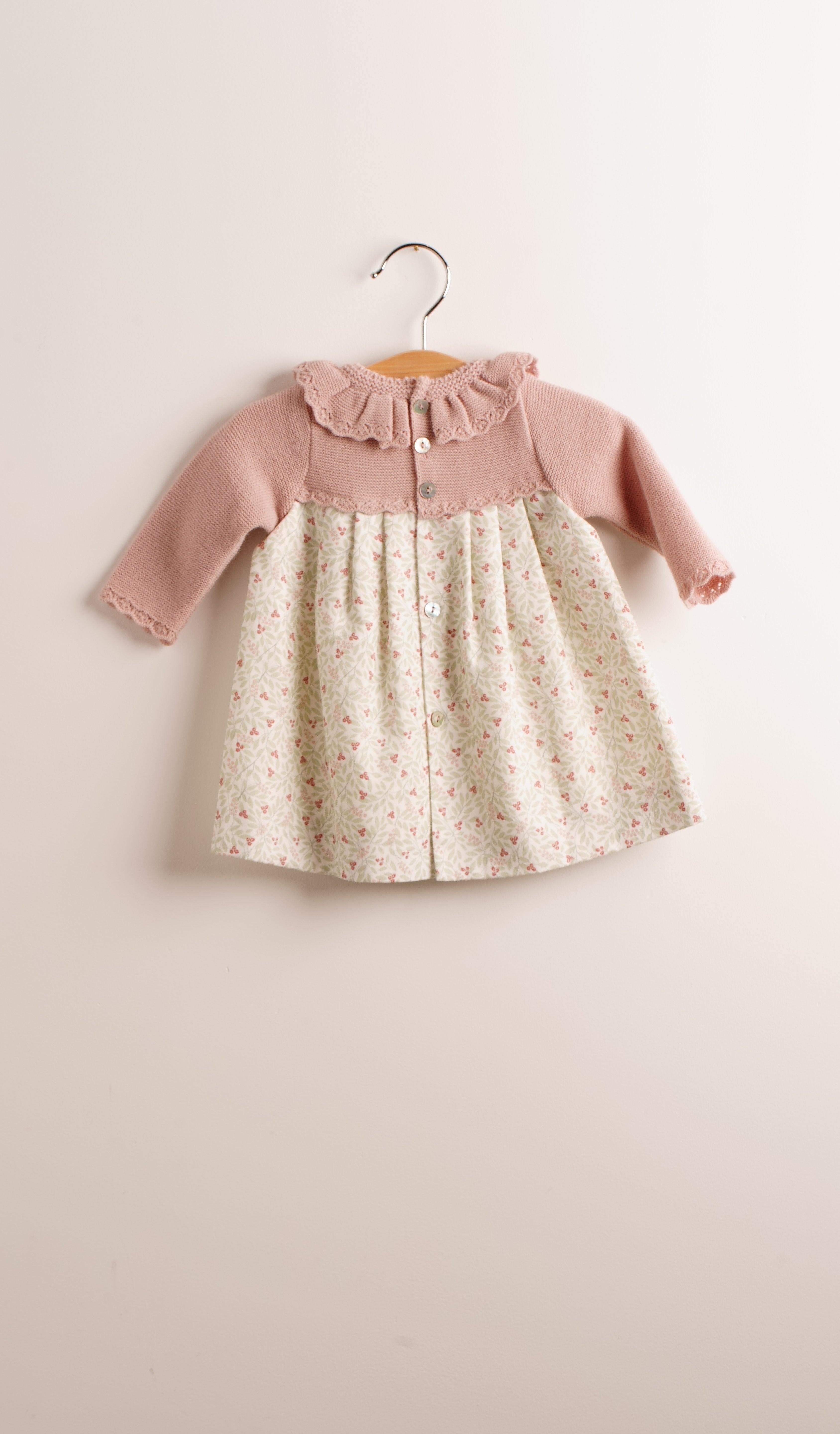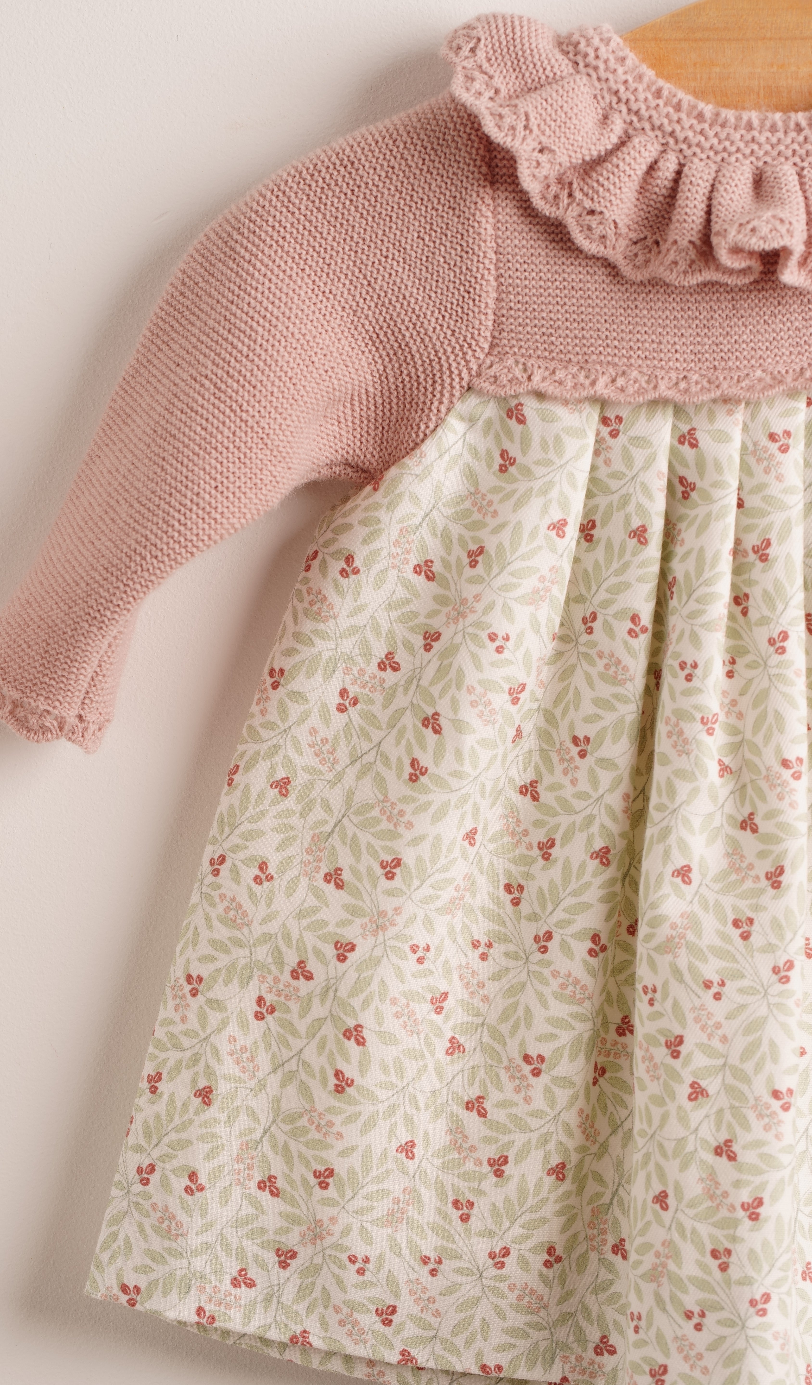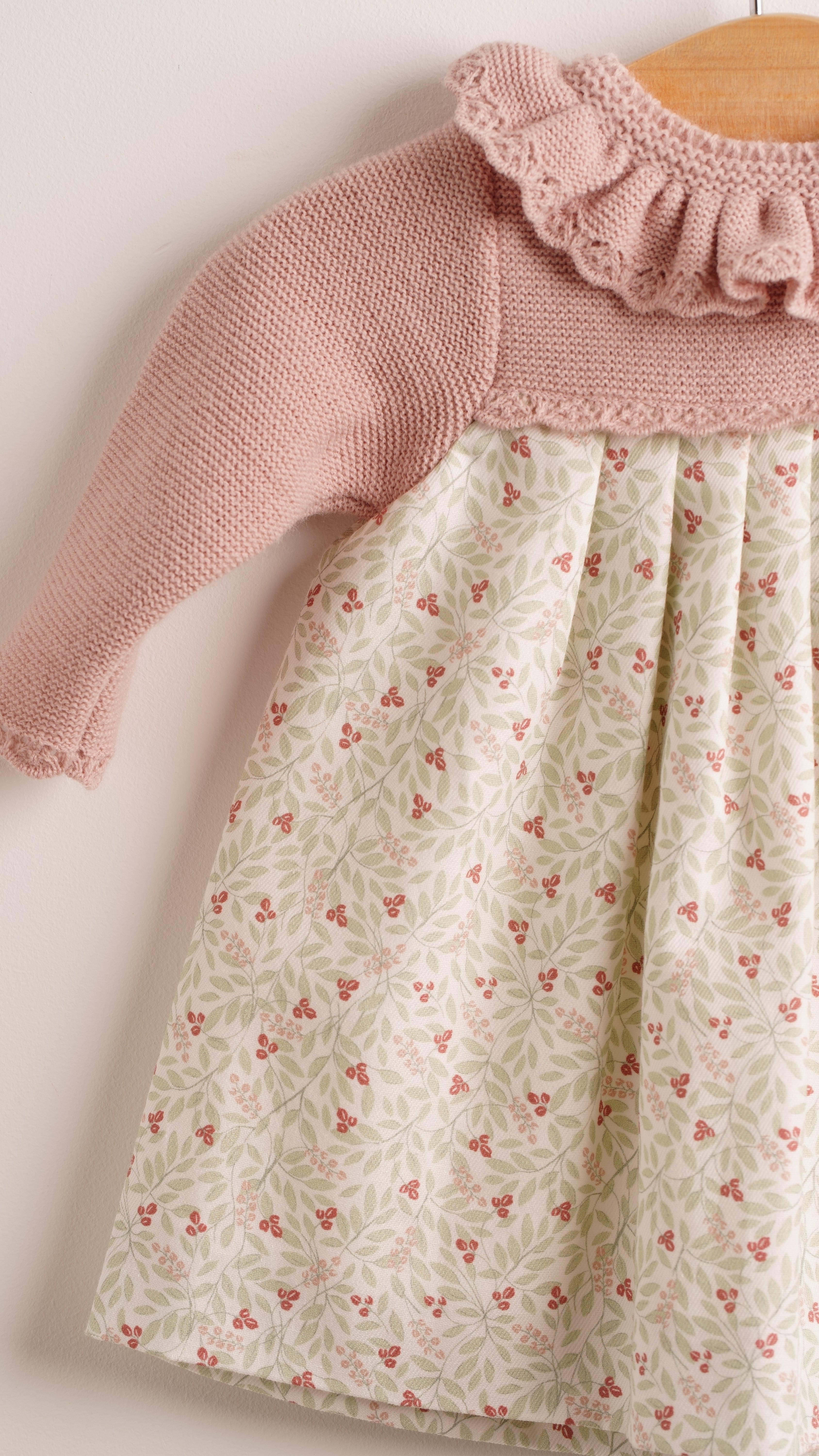 Vestido con el precioso estampado de arándanos. Lleva punto color rose nude en la parte de arriba con cuello volante. Se cierra con botones nácar en la parte de atrás.