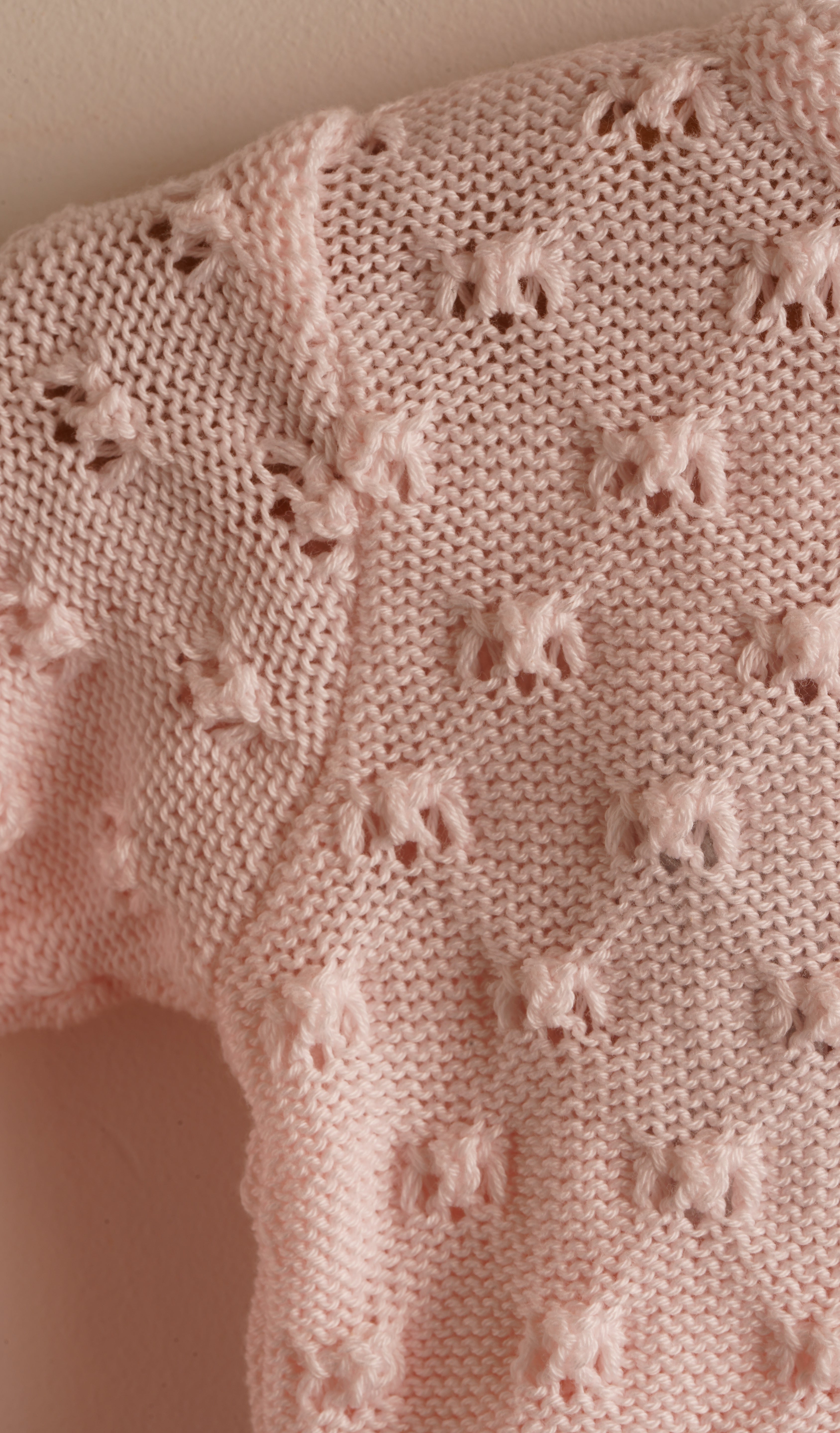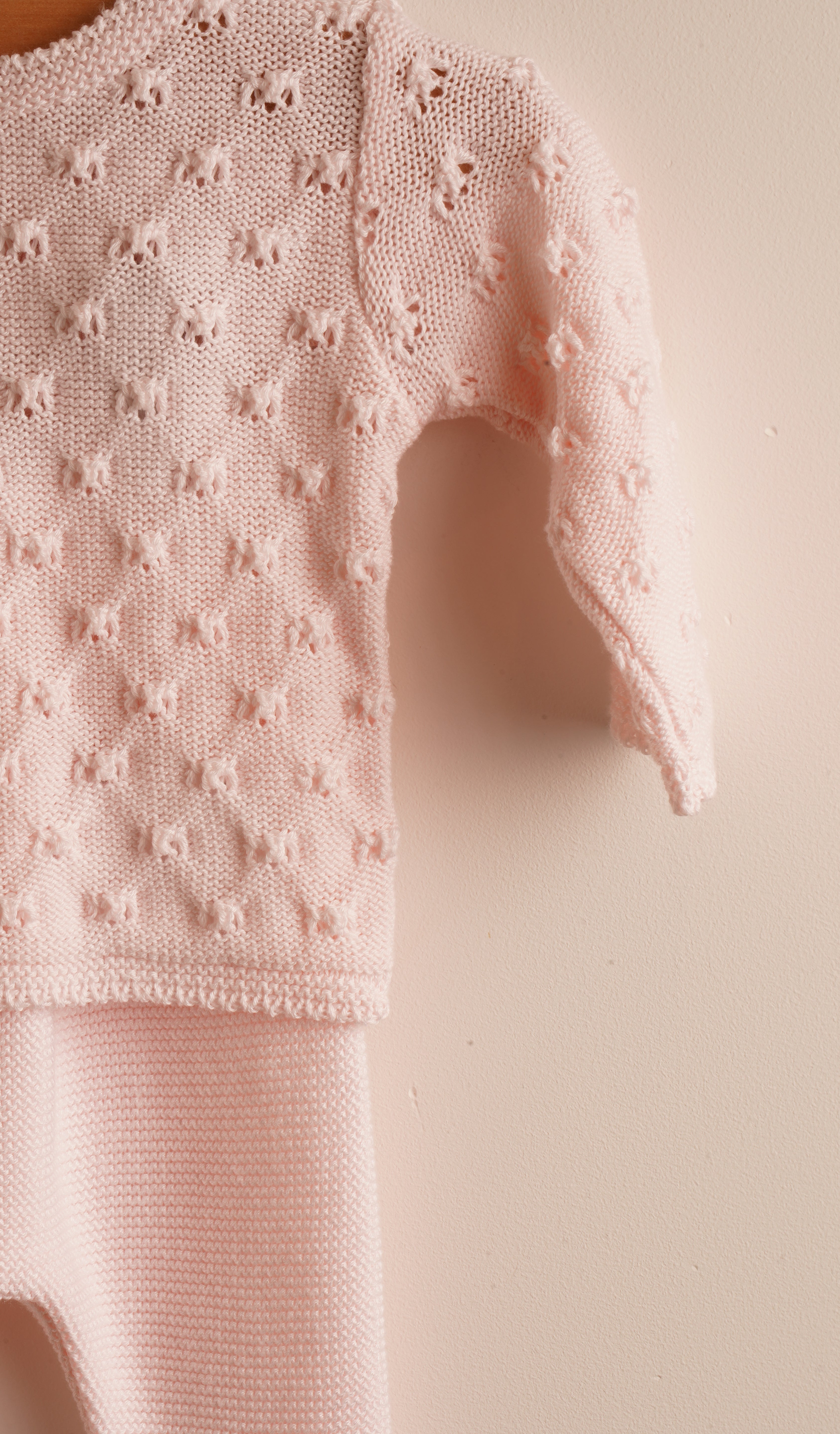 Este conjunto de punto rosa es ideal para salir del hospital o para vestir a tu bebé hasta que cumpla un añito. Está compuesto de un jersey con botones nácar en la parte atrás y una polaina a juego. Hecho de hilo algodón, por lo cual es perfecto para primavera verano. Combínalo con la capota y la mantita a juego.