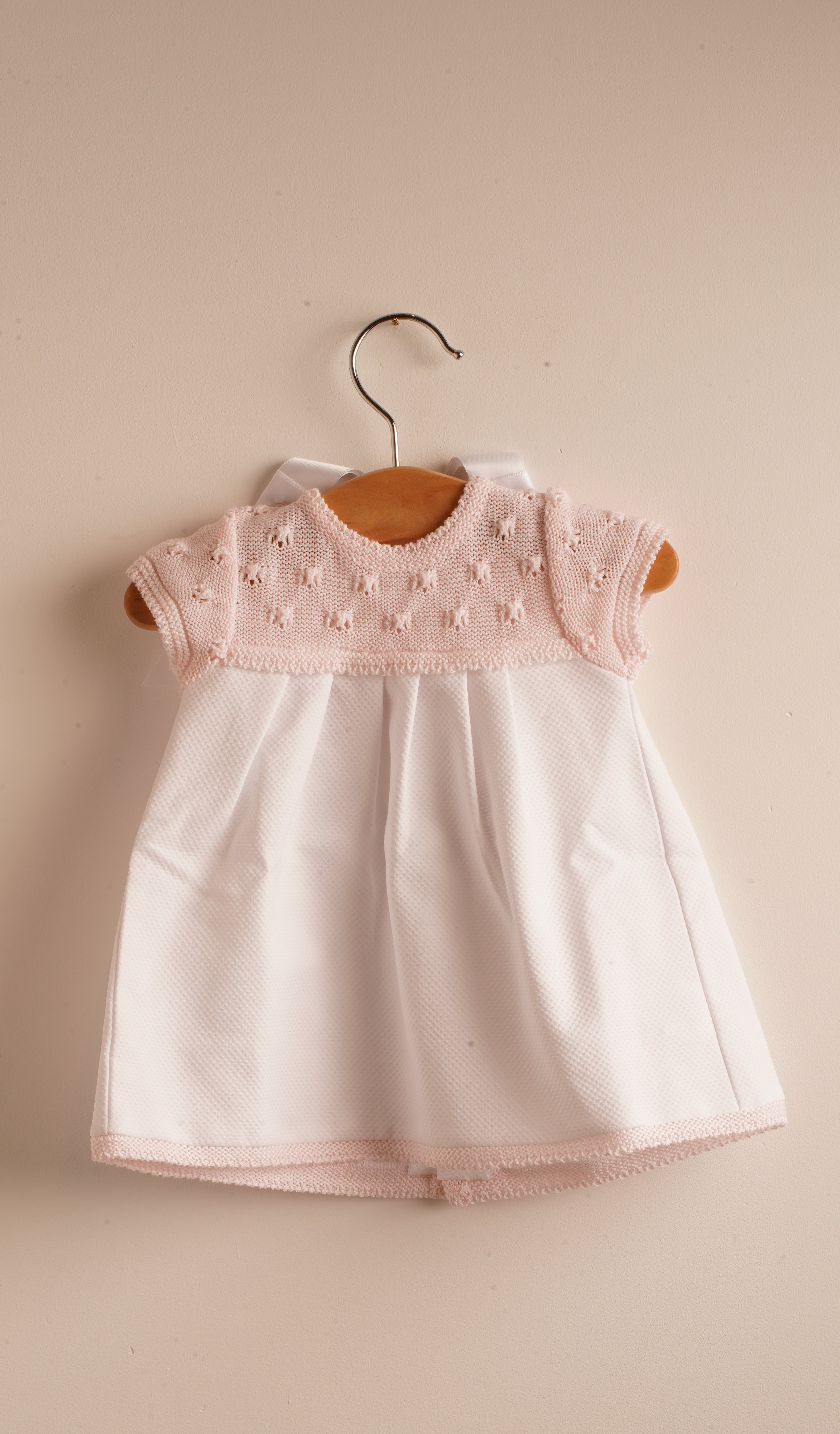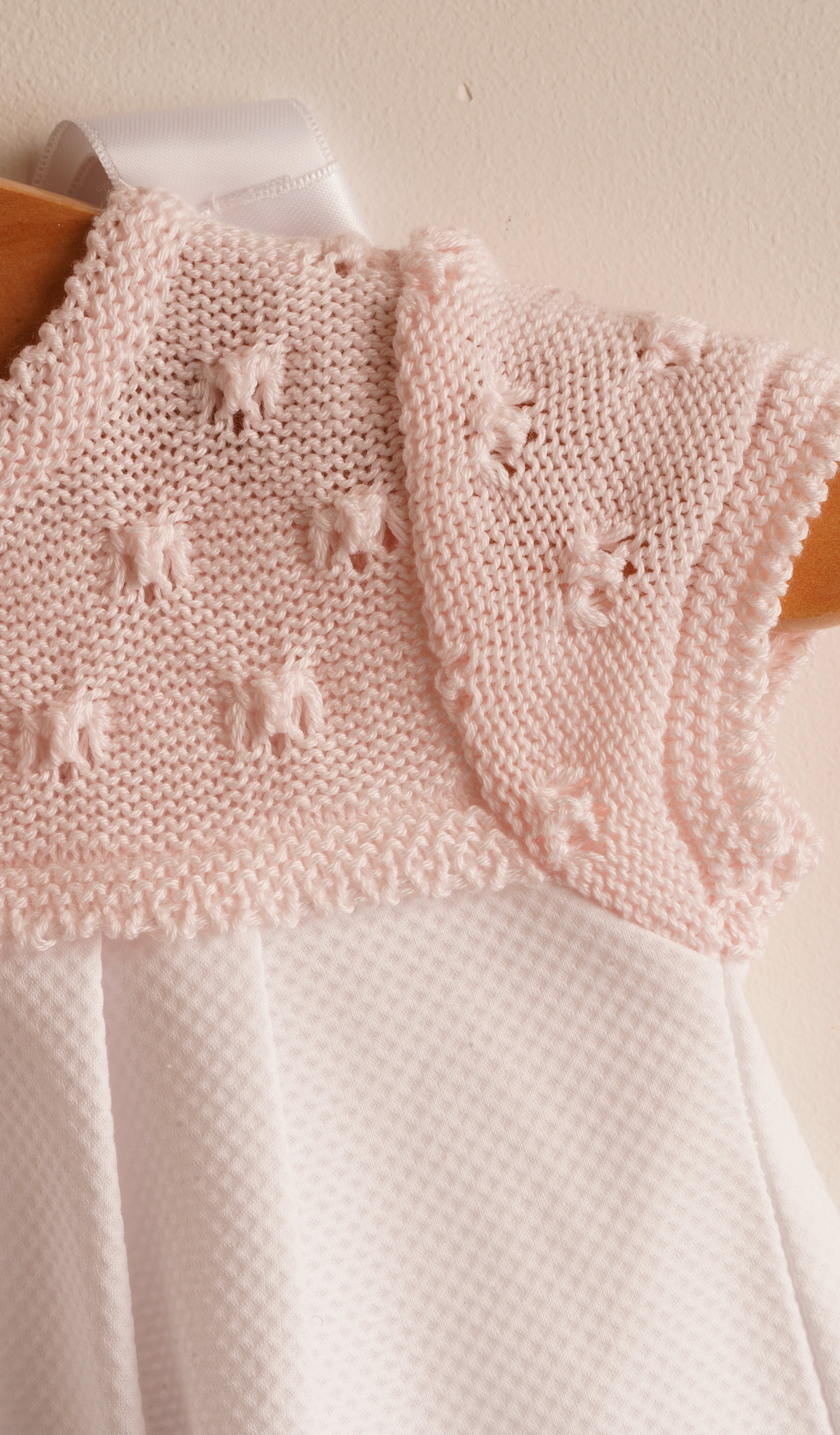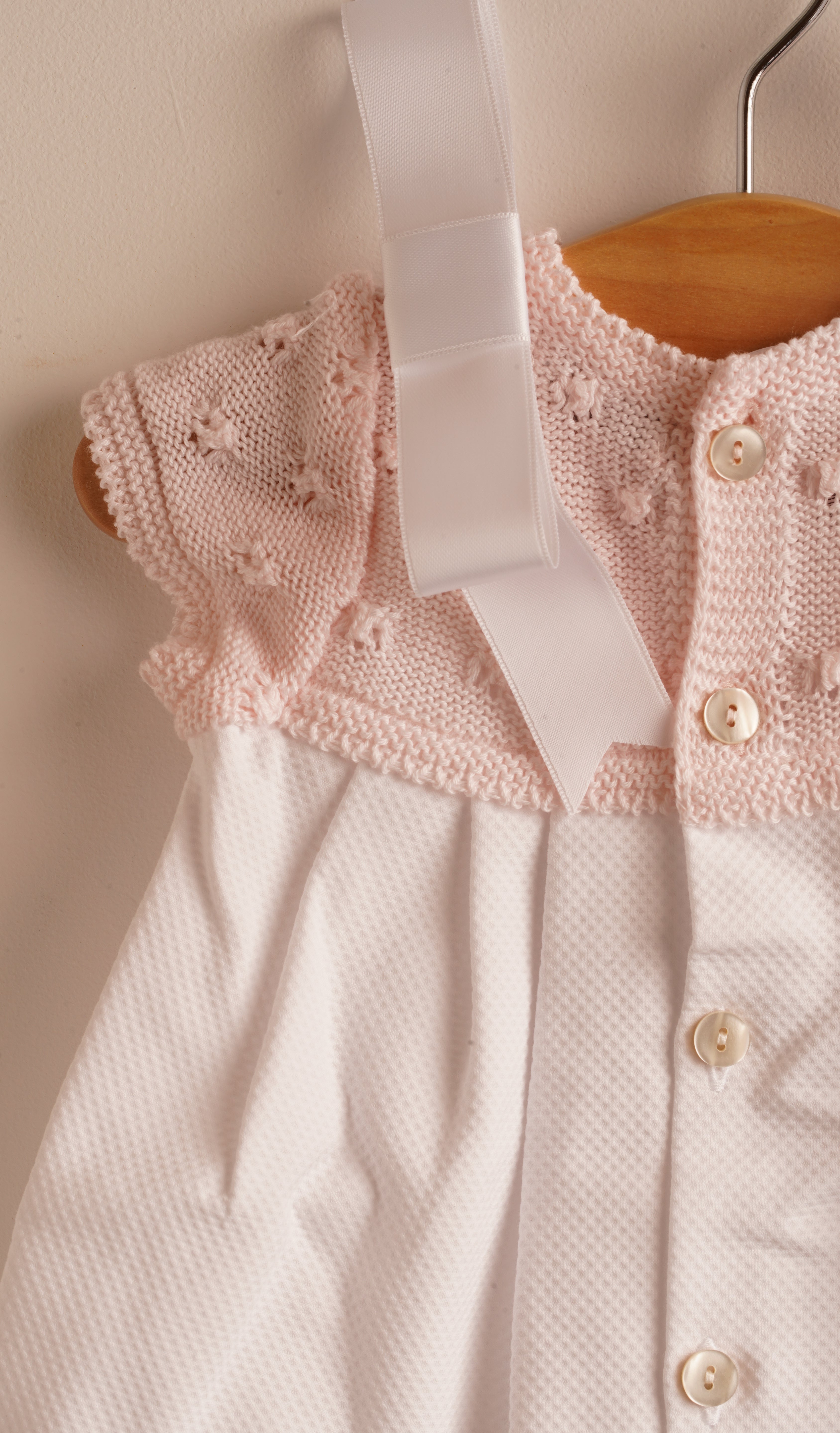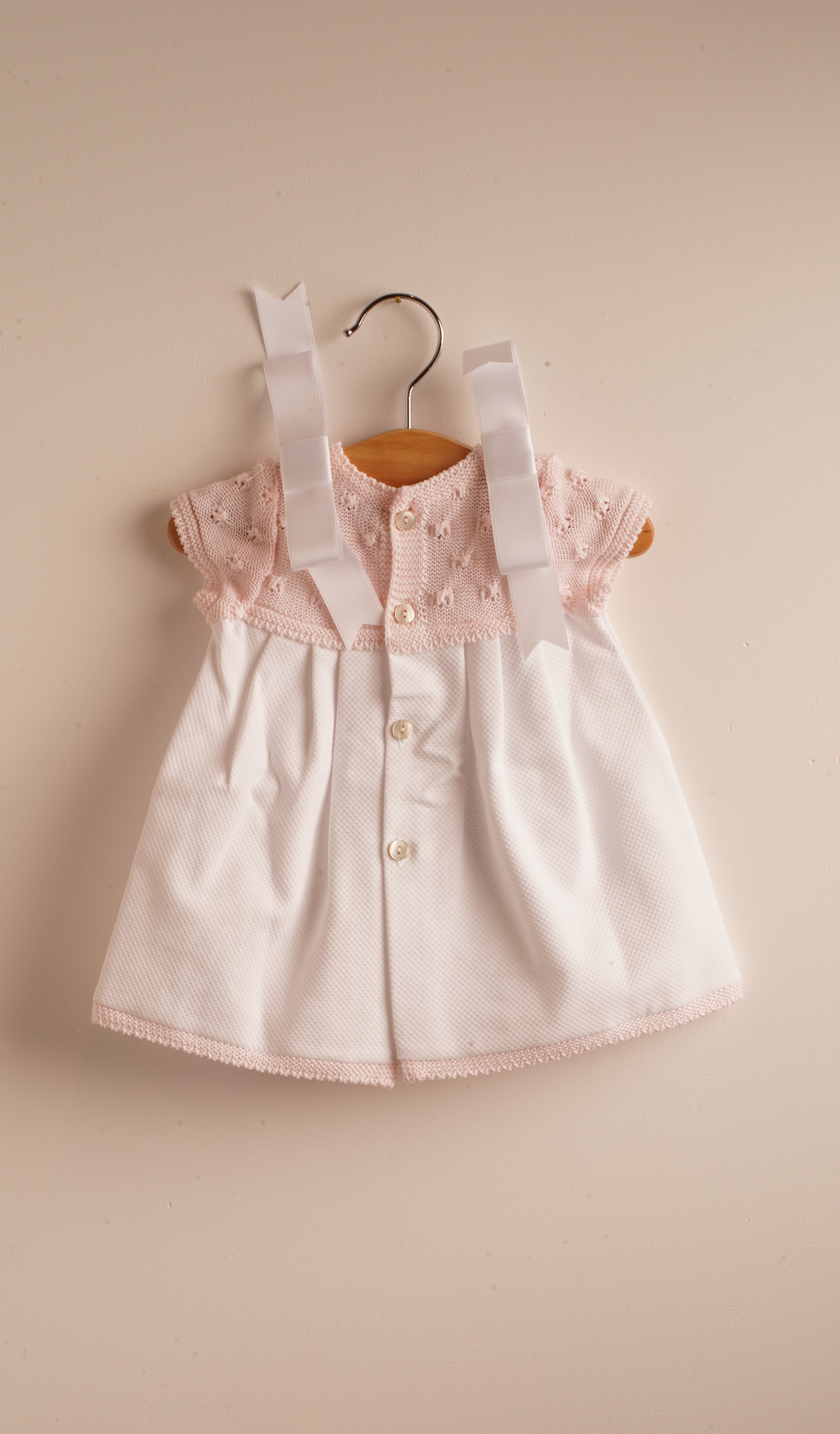 Vestido clásico de tela piqué con punto rosa y lazos blancos en los hombros. Lleva botones nácar en la parte de atrás. Combínalo con la braguita piqué y la capota punto rosa a juego.