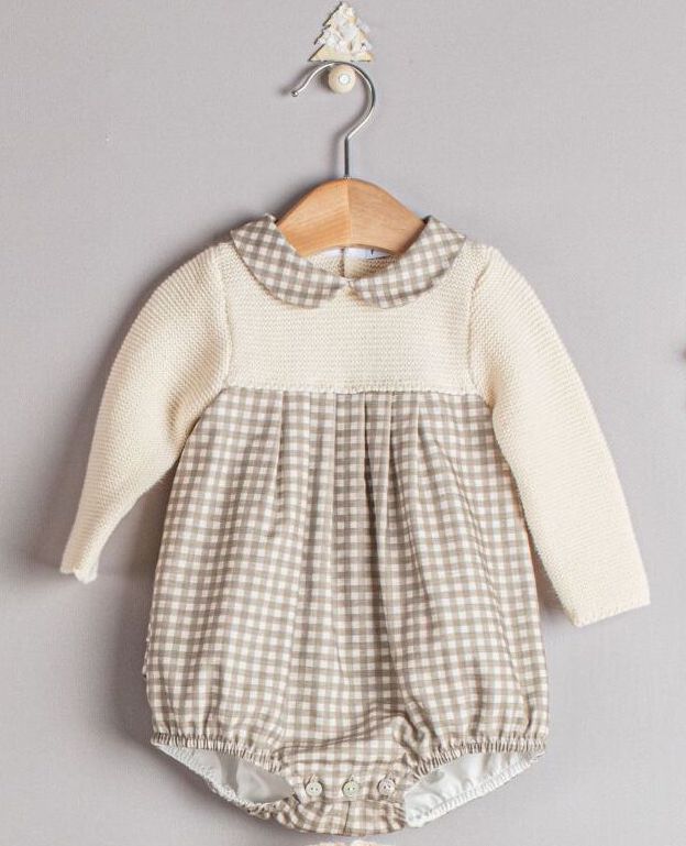 Pelele de punto hueso combinado con tela cuadritos beige y hueso. Lleva botones nácar en la parte atrás y abajo para facilitar el cambio.