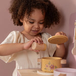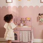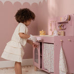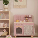 ¡Pequeños chefs, prepárense! Con esta cocina de juguete rosa de madera, podrán sumergirse en el mundo de la cocina y la repostería. El set incluye dos sartenes, utensilios de cocina, tres tazas y tres platos, todos con alegres ilustraciones.