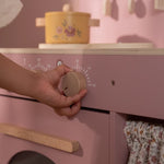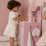 La cortina de tela, el paño de cocina y la manopla de horno están decorados con el suave estampado de flores suaves. ¡Una encantadora cocina de juguete para una diversión sin fin cocinando!