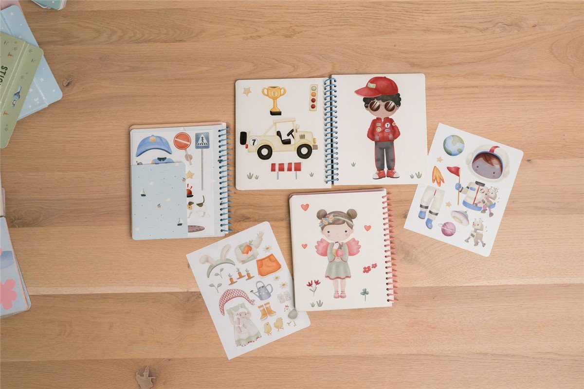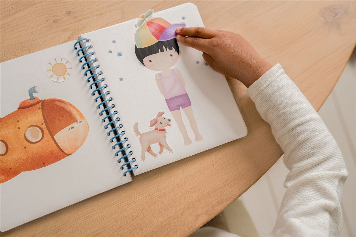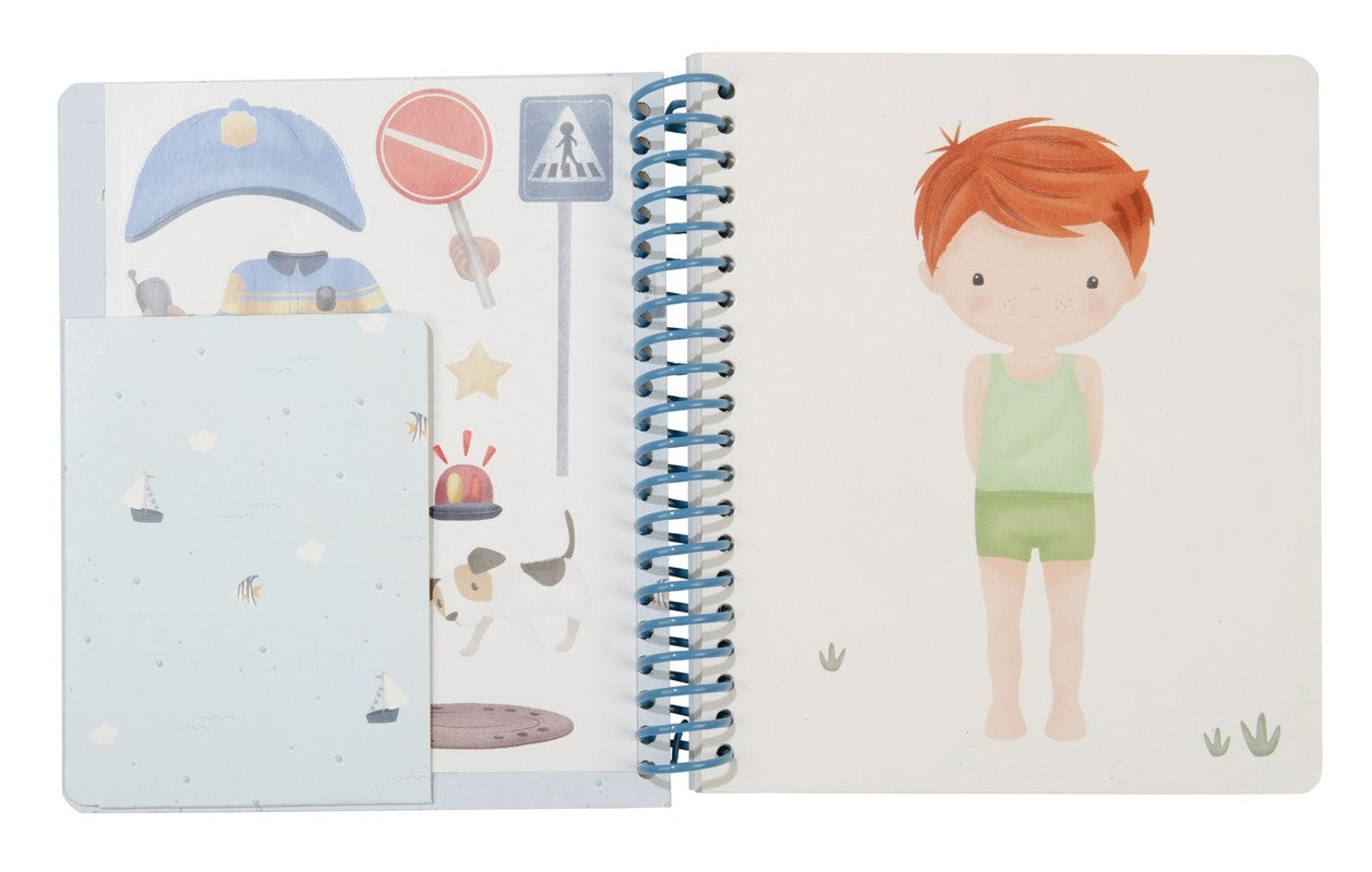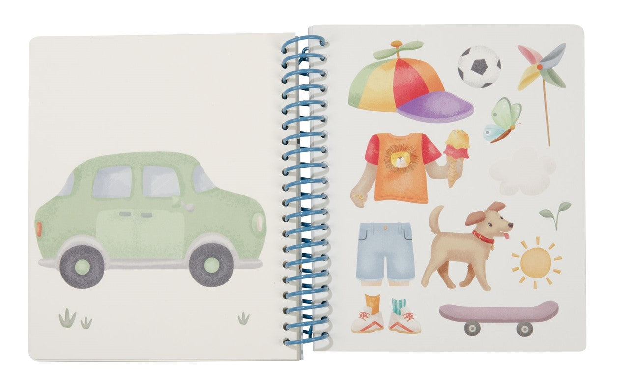 Libro viste a Jim & Friends con anillas. Contiene 24 páginas con modelos y 12 hojas de pegatinas con atuendos y accesorios. Con tapa dura, ideal para jugar en casa y para llevar.