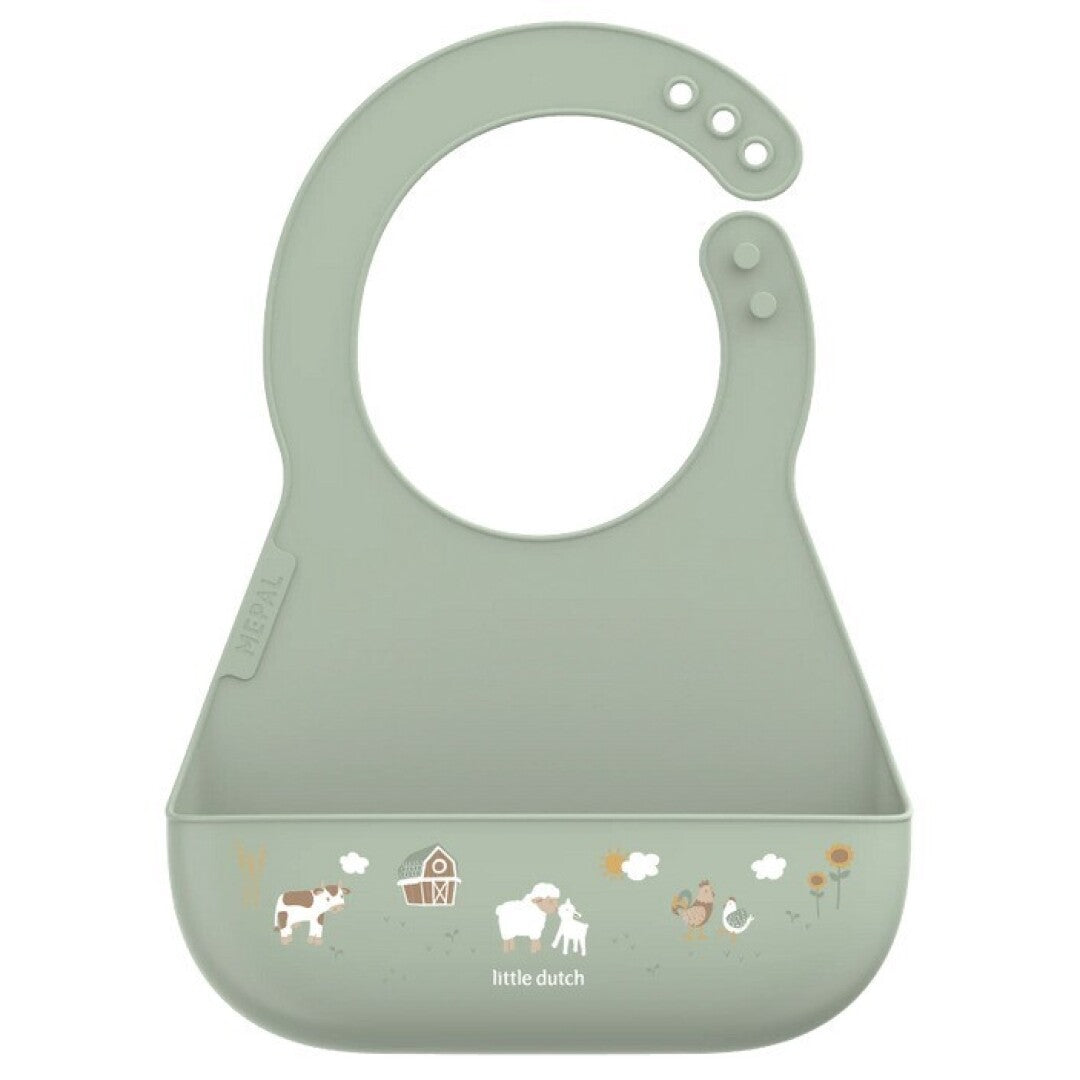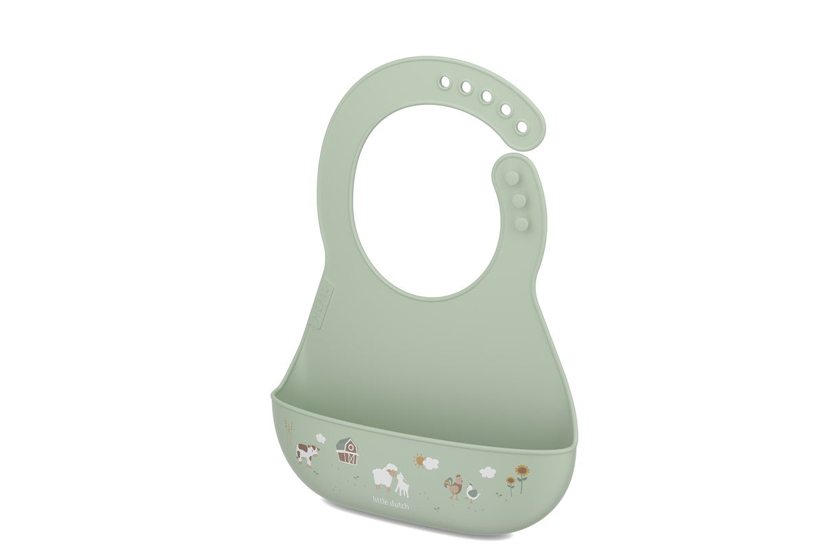 Babero de silicona de la colección Pequeña Granja con cierre ajustable en el cuello y bolsillo profundo para atrapar la comida. Fácil de limpiar y transportar.