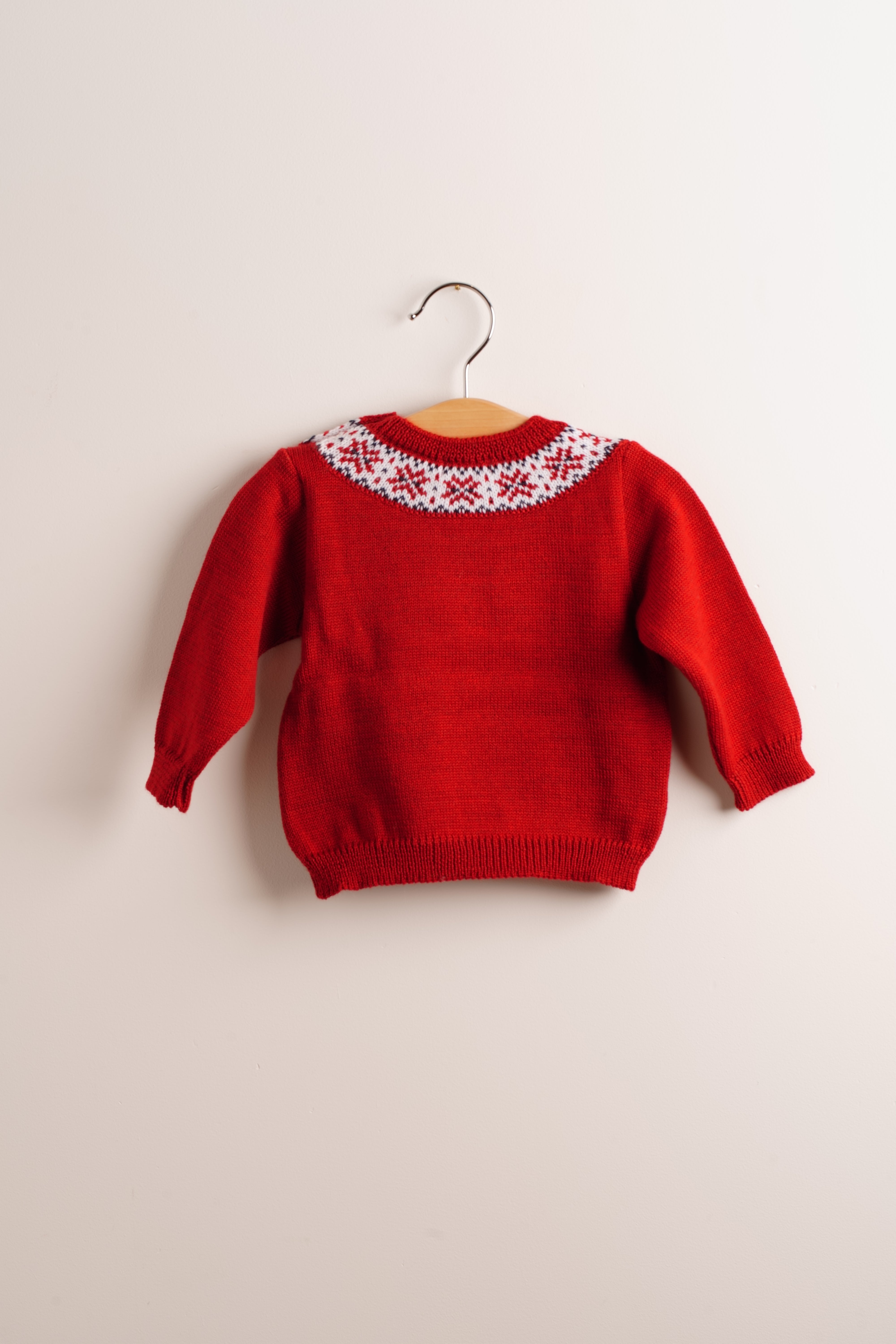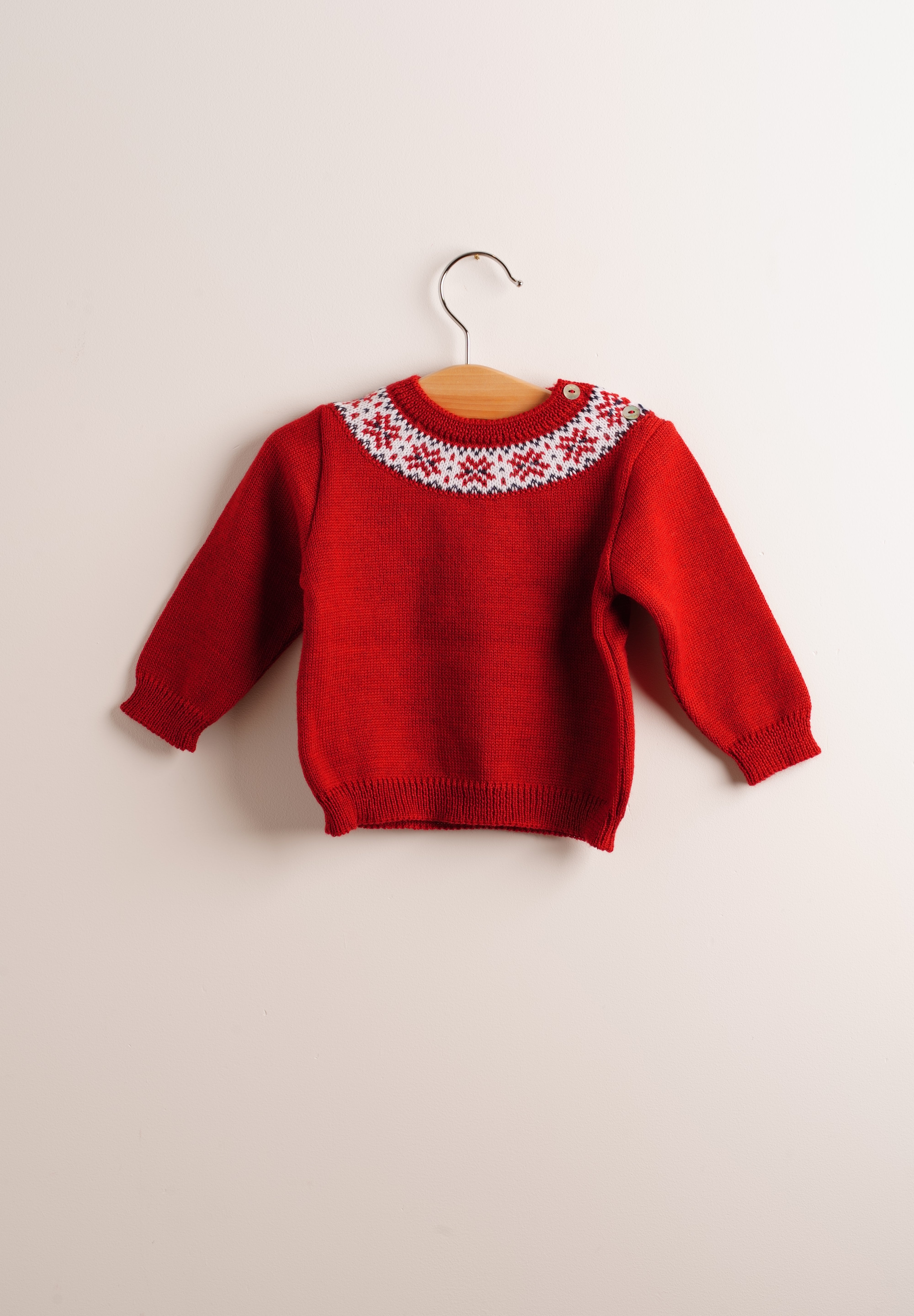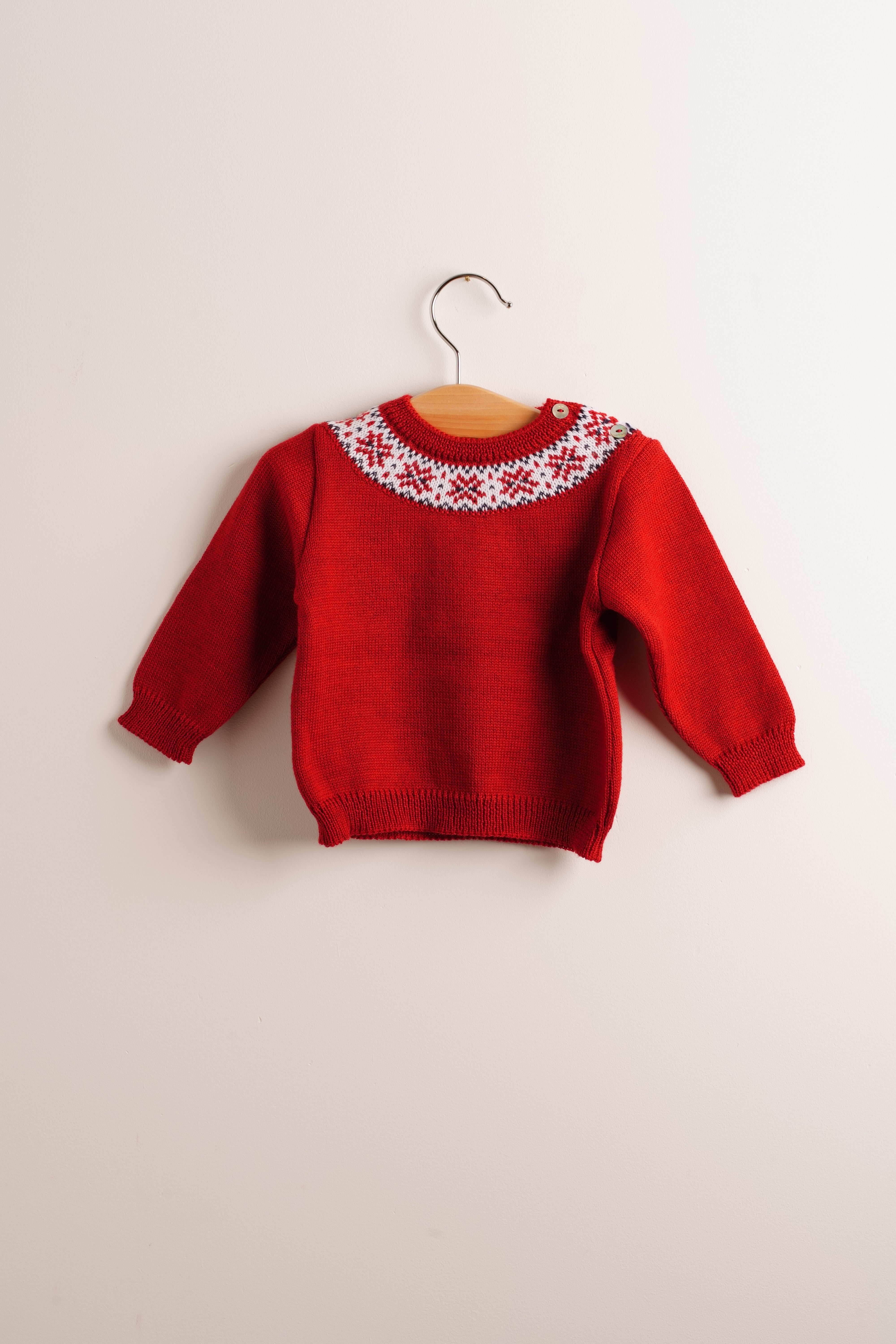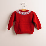 Precioso jersey de niño de lana de merino de color rojo. Ideal para las fiestas. Conjunta a tus peques, porque las tallas llegan de 6 meses a 6 años.