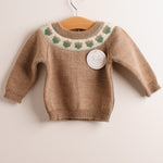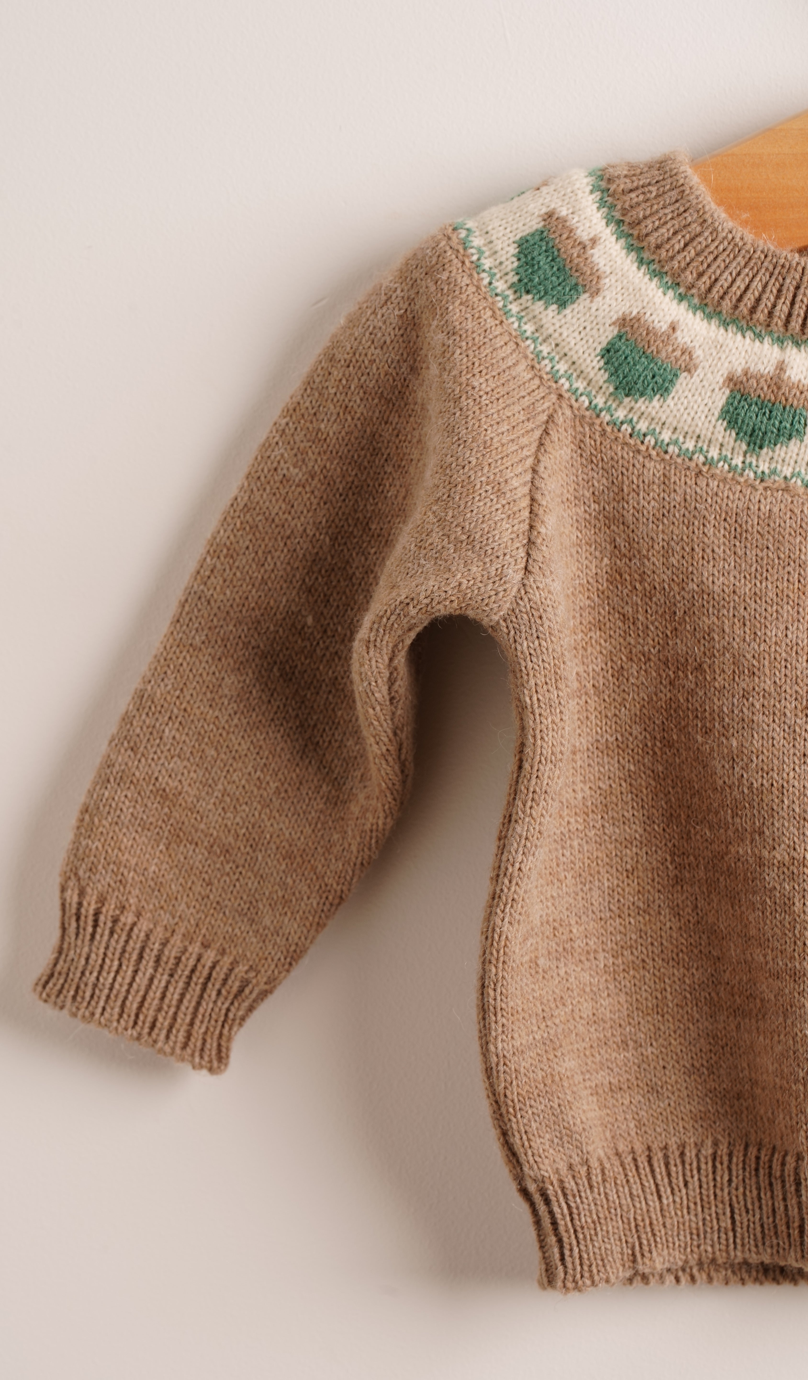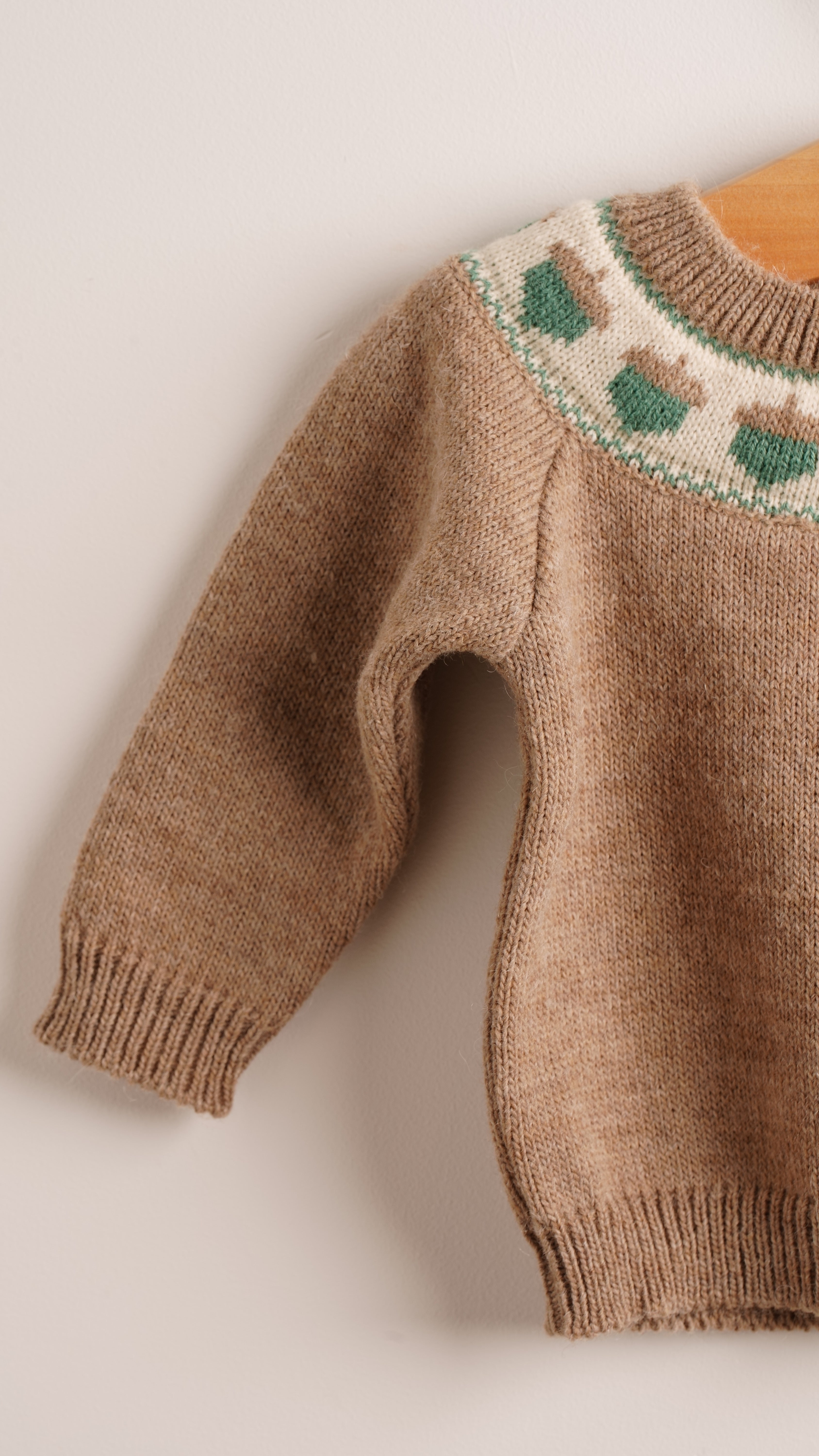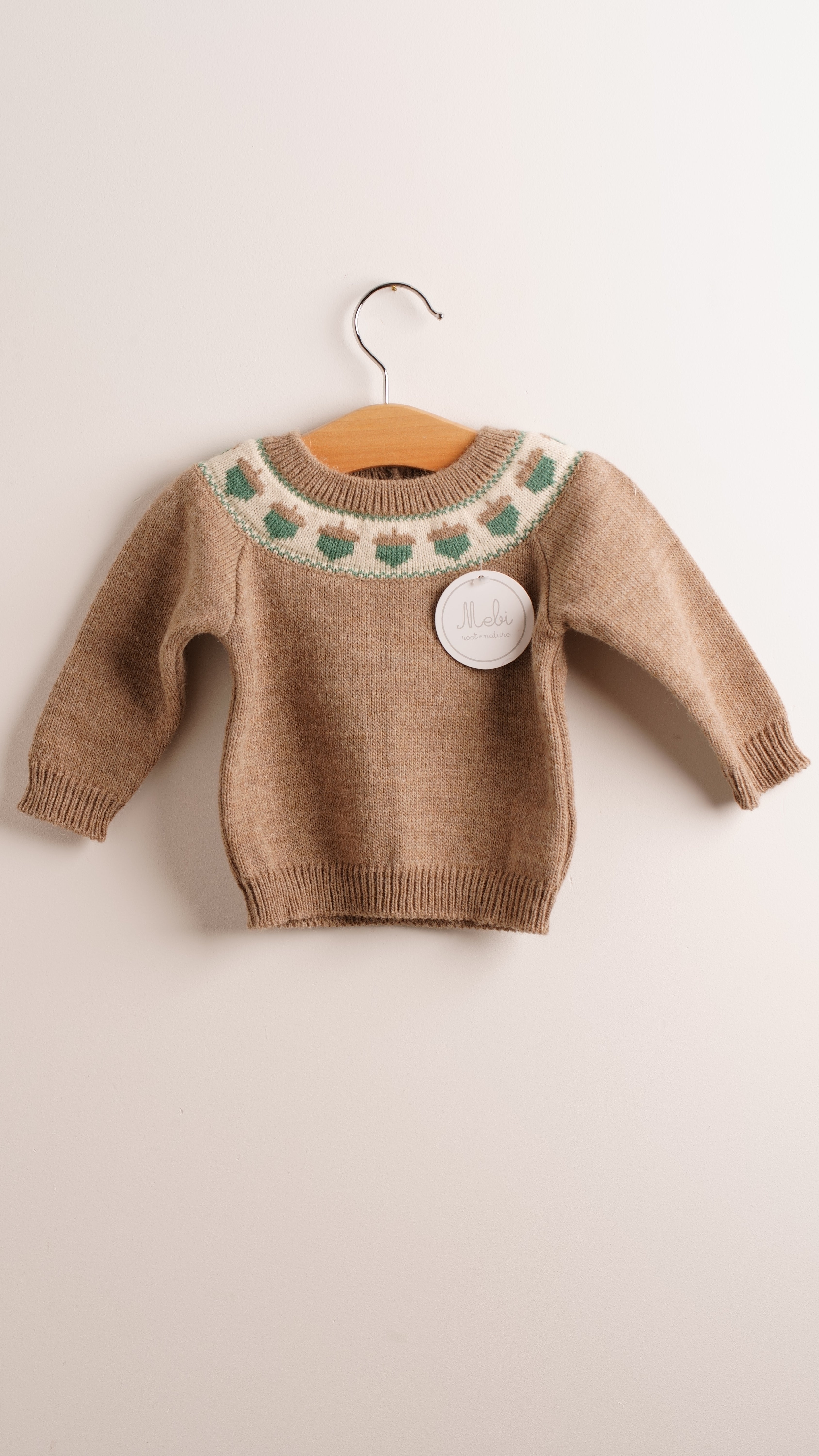 Jersey color marrón con greca de bellota. Muy original, calentito y cómodo.