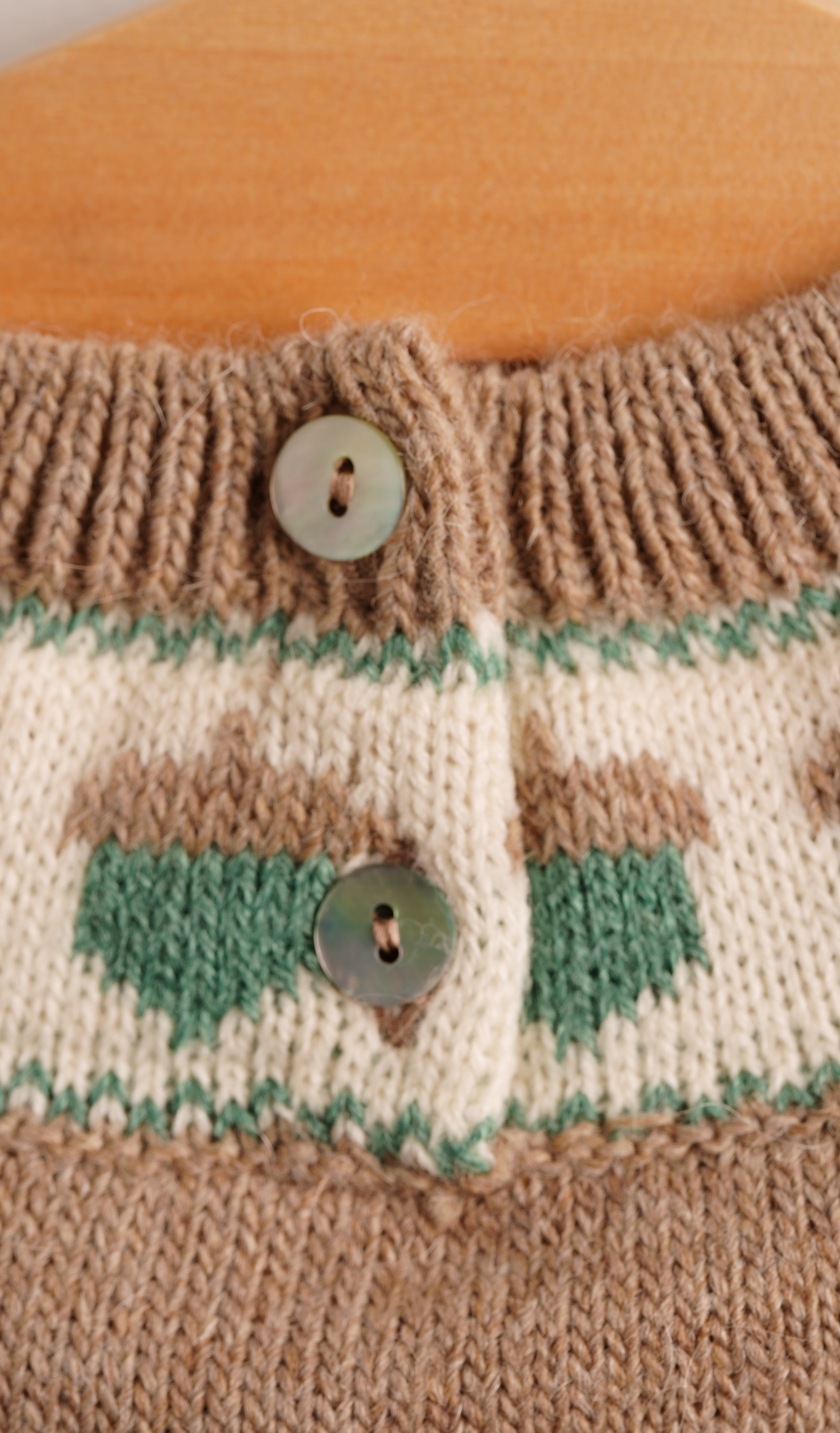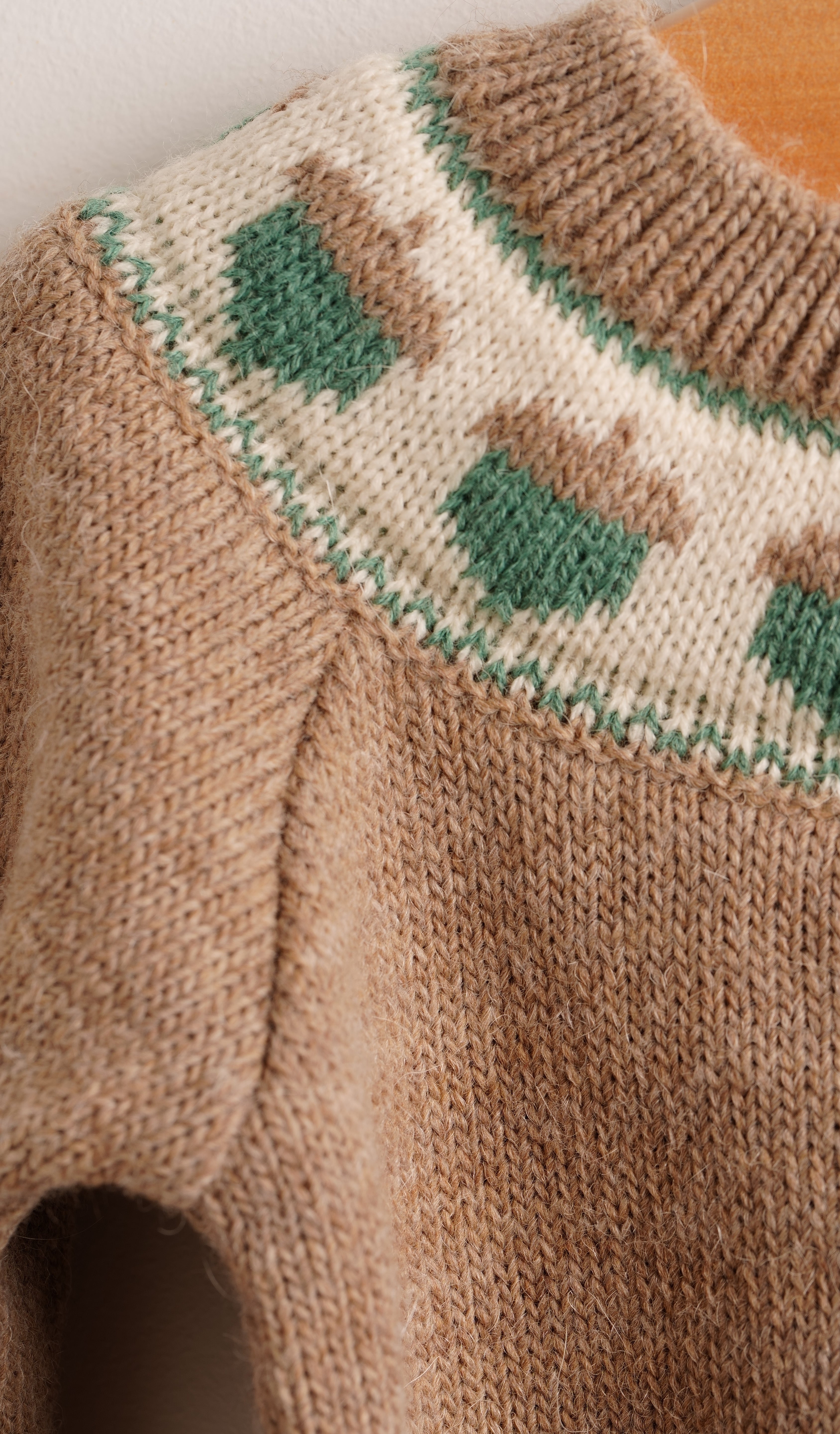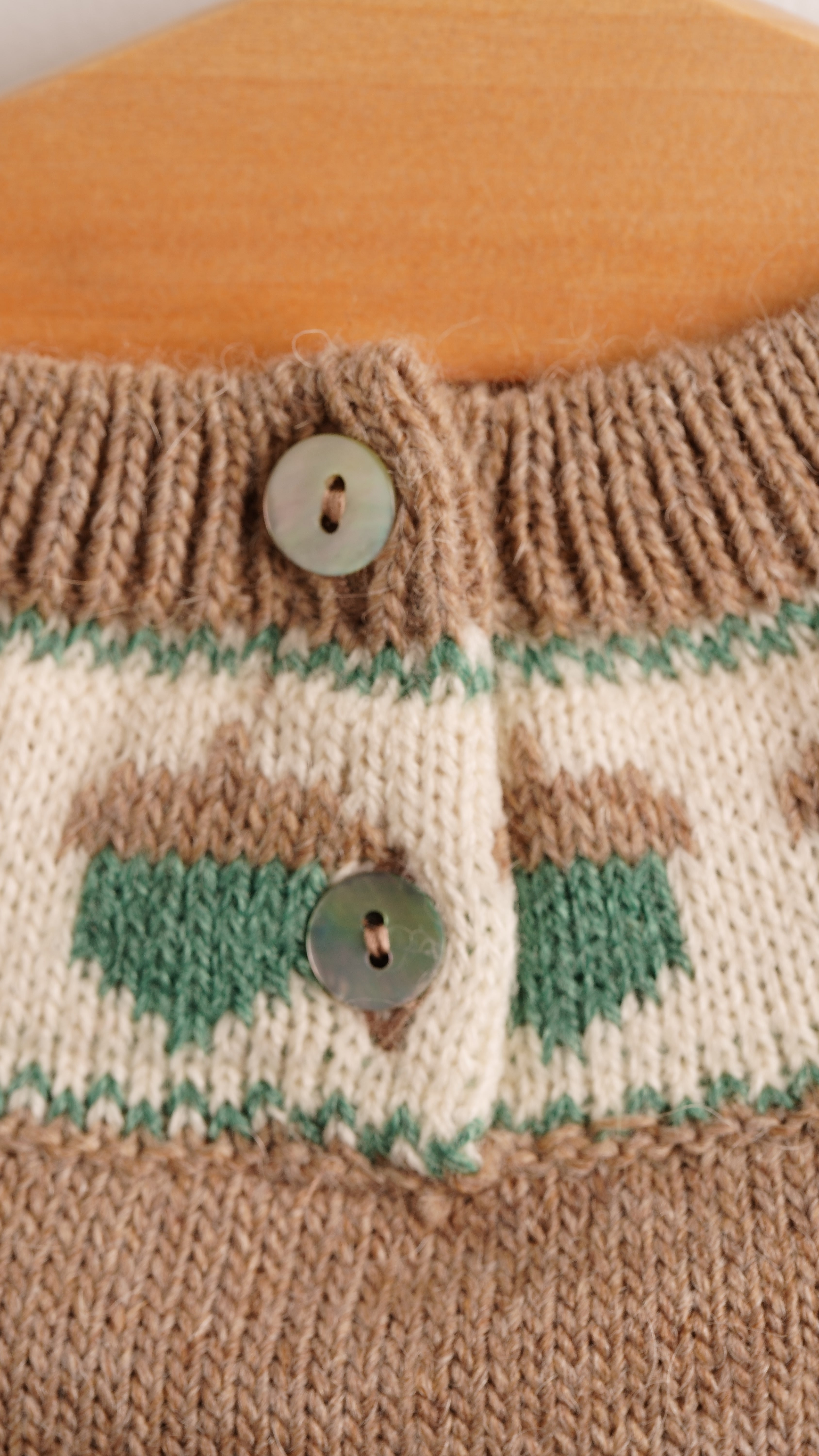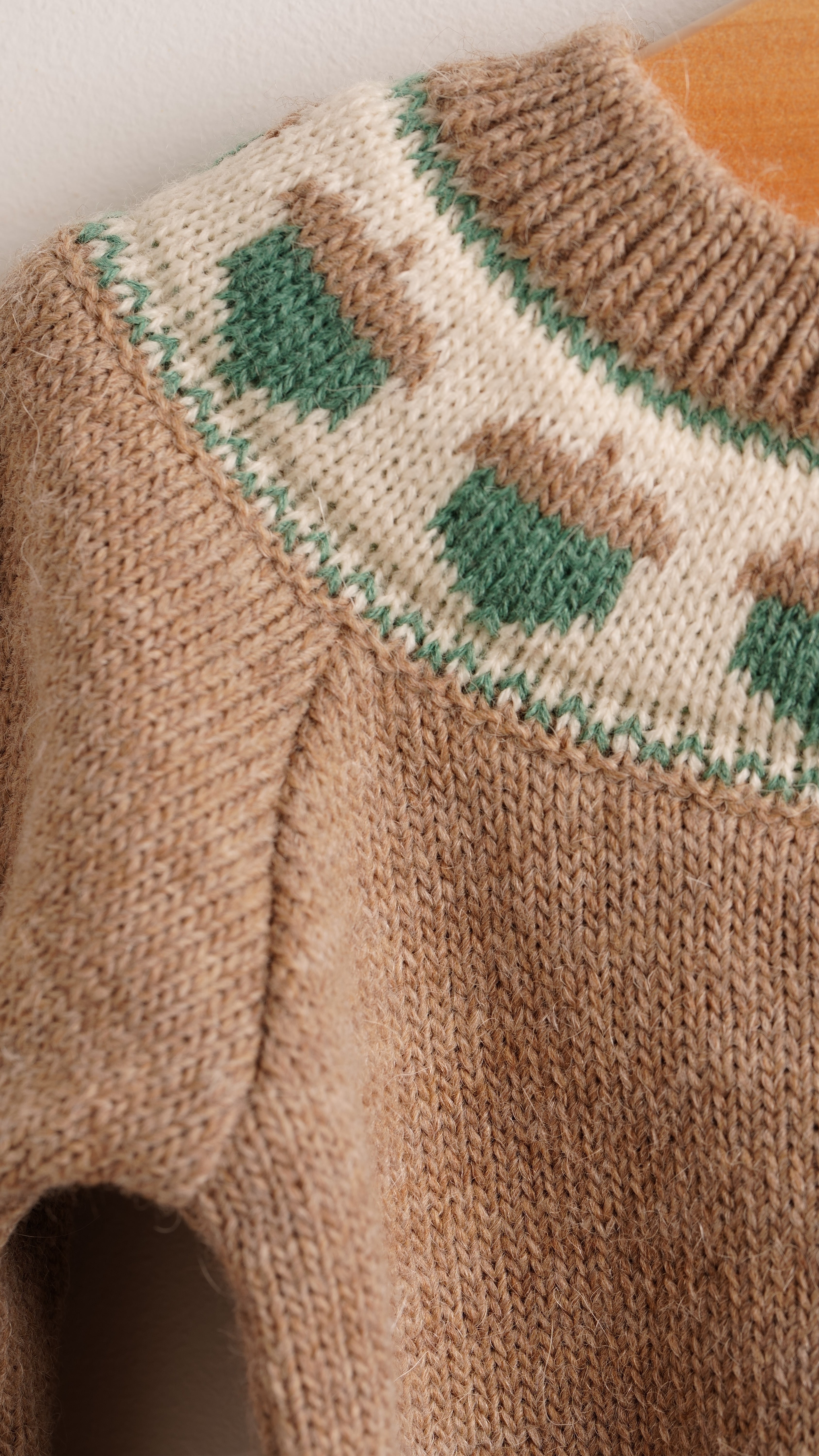 Jersey color marrón con greca de bellota. Muy original, calentito y cómodo.