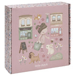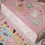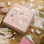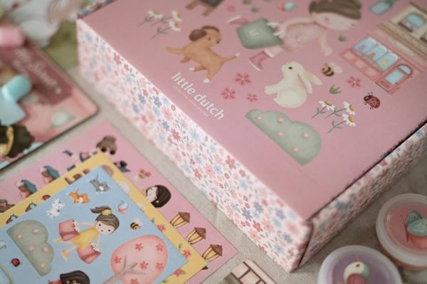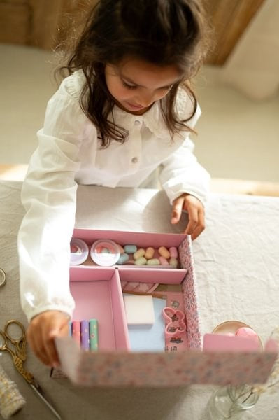 Caja de creatividad inspirada en la muñeca Rosa con todo lo que necesitas para empezar a ser creativo inmediatamente, por ejemplo: pegatinas, papel de dibujo, ceras, pintura, arcilla expandida, sellos, pegatinas, etc.