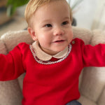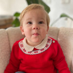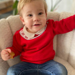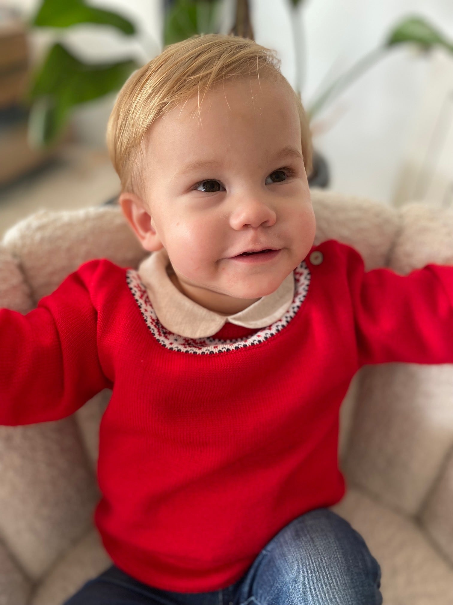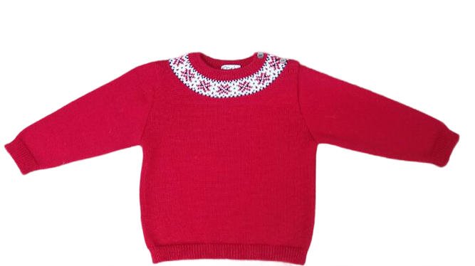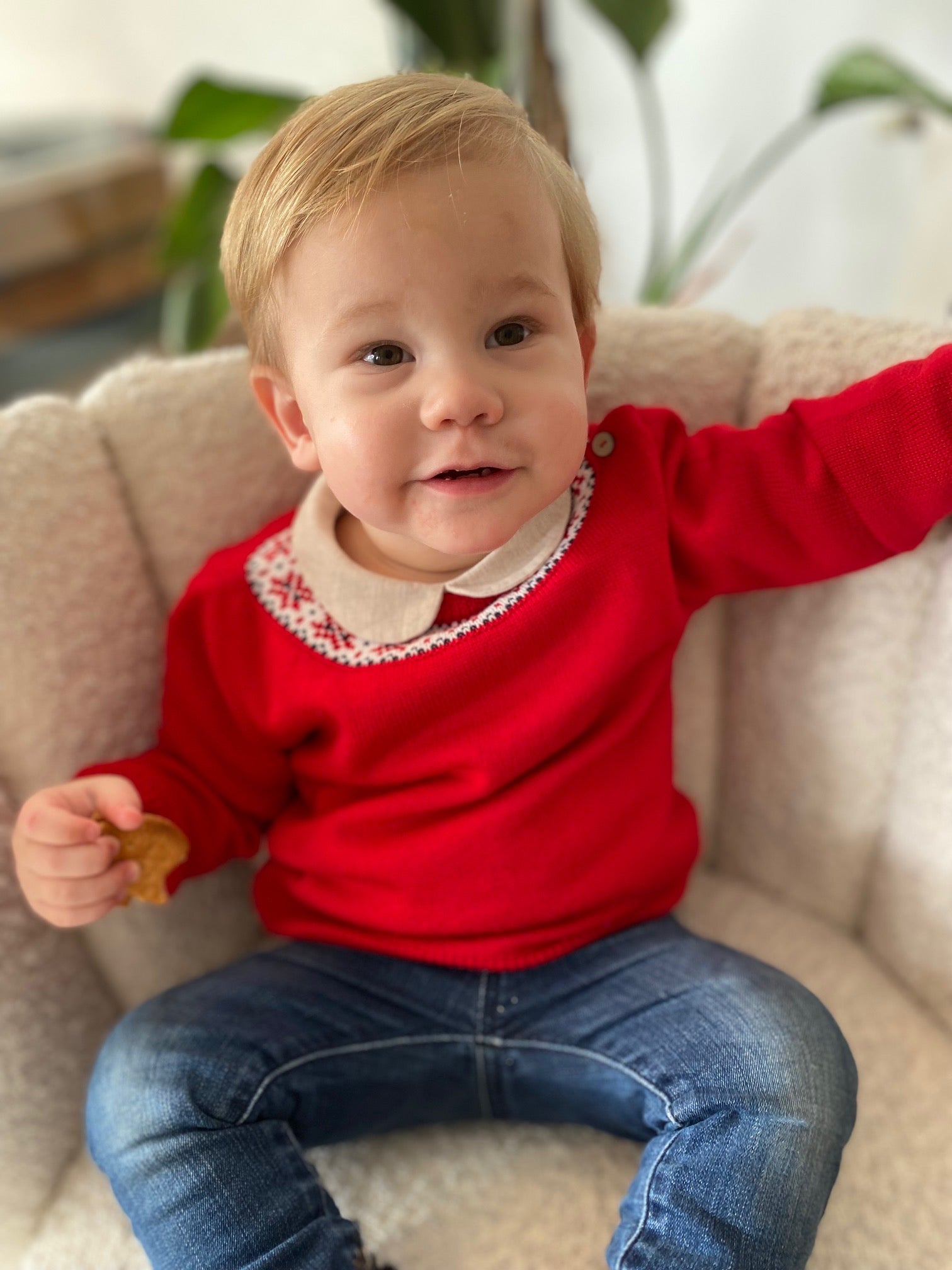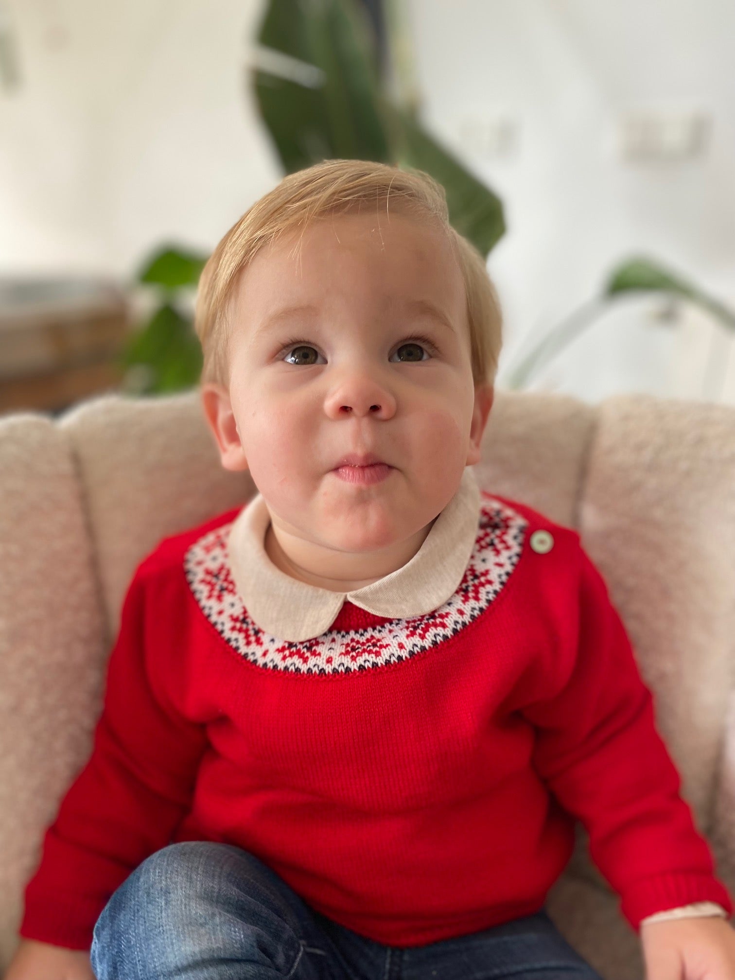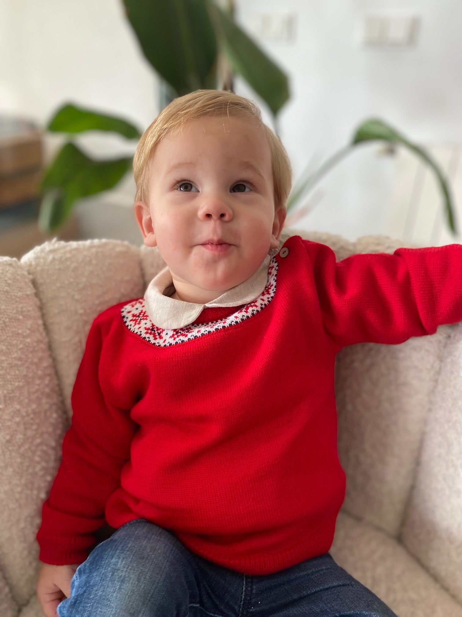 Precioso jersey de niño de lana de merino de color rojo. Ideal para las fiestas. Conjunta a tus peques, porque las tallas llegan de 6 meses a 6 años.