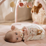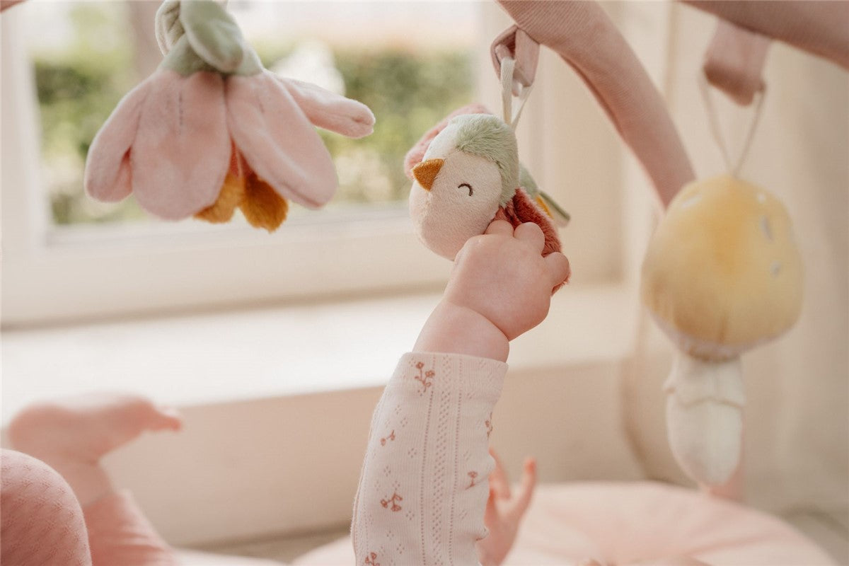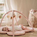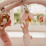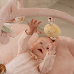 ¡Hay tanto para ver, tocar y oír! Cada día es una aventura con esta alfombra de juego con forma de flor. Presentada en un suave tono rosa, tiene dos arcos de pana con cinco peluches colgantes diferentes de la colección Fairy Garden. El pequeño ciervo, el pájaro, la flor, el hongo y la fresa ayudarán a desarrollar las habilidades sensoriales y la coordinación mano-ojo.