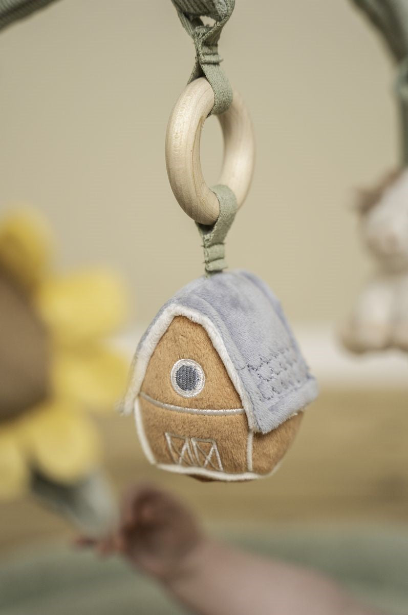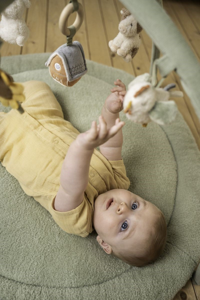 Fomenta la exploración. Desafiará a tu pequeño a moverse, alcanzar y agarrar con esta alfombra de actividades cautivadora. La alfombra es super suave, tiene forma redondeada en la base con un grosor de 2 cm, lo que la hace muy confortable y está inspirada en la estética de la granja de la colección Little Farm, con 5 diferentes suaves juguetes colgantes que mantendrán a su bebé entretenido y desarrollará la coordinación ojo-mano.