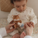 ¡Agarra, gira y sacude! El adorable zorro con su suave pelaje y su pequeña cola te invita a jugar y a poner en movimiento este sonajero. También ha elegido un pequeño hongo para que lo acaricies. El anillo transparente contiene 3 pequeñas cuentas de colores que empiezan a sonar cuando tu bebé juega con este divertido juguete. El sonajero no solo despierta la curiosidad y los sentidos de tu bebé, sino que también mejora la coordinación mano-ojo.