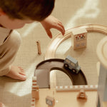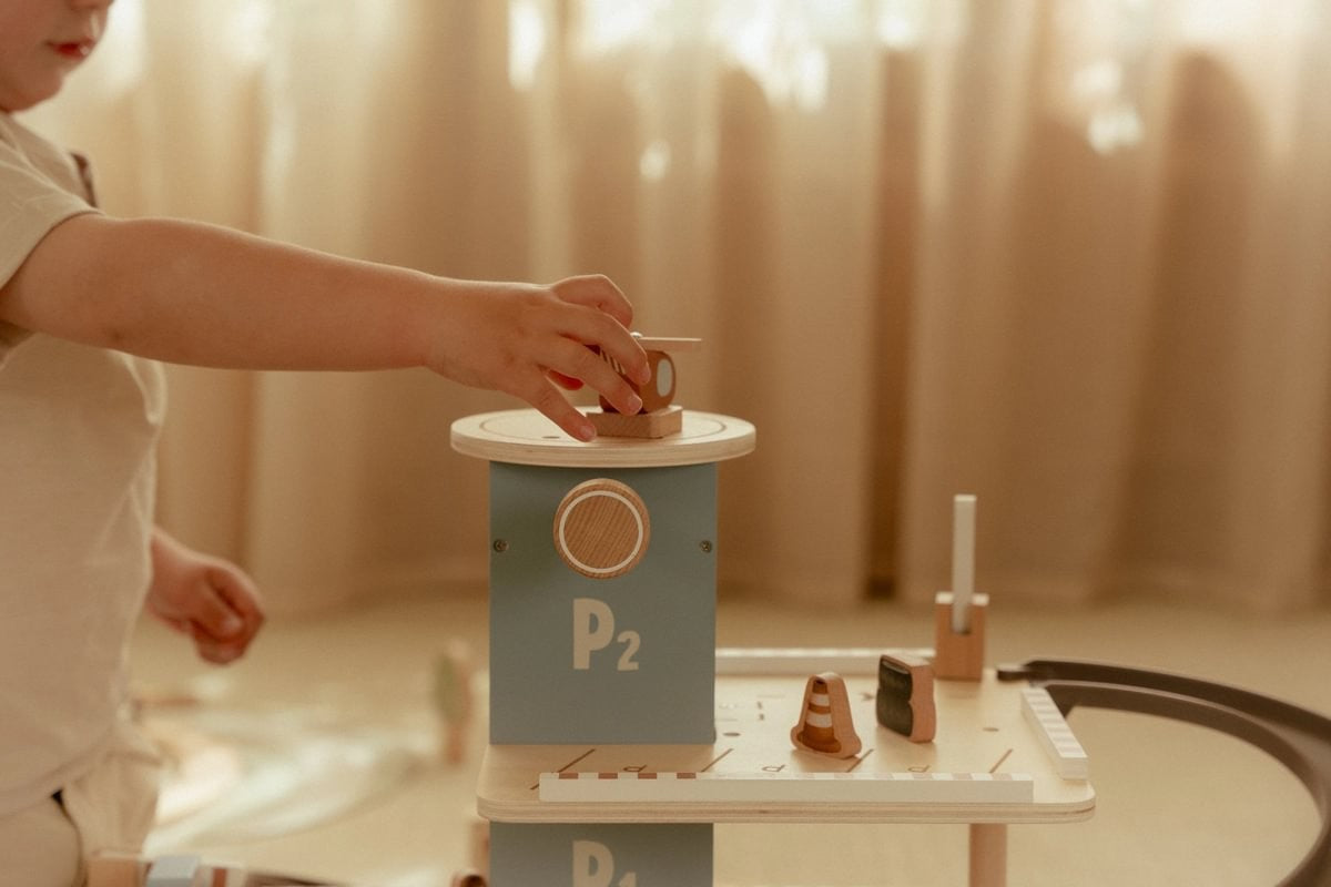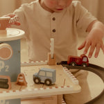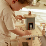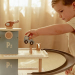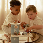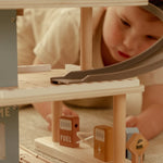 ¡Aparca, recarga combustible y corre! Este garaje de juguete de madera es el complemento perfecto para el Set de Tren Little Dutch XL. El garaje cuenta con una planta baja con lavadero de autos, dos plataformas de estacionamiento y una estación de carga eléctrica, además de una plataforma para helicópteros en la parte superior. Incluye accesorios de madera como señales de tráfico, neumáticos apilados y un cubo. También incluye tres vehículos y un helicóptero. Conduce, aparca tu auto o vuela a tu destino. ¡Diversión sin límites garantizada!