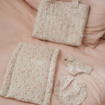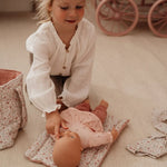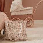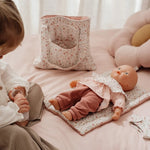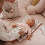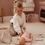 Con esta elegante bolsa de cuidado, ¡siempre estarás preparada para cualquier aventura con tu muñeca! La bolsa de pañales contiene todo lo que necesitas para cuidar a tu muñeca: un pañal suave, un cómodo cambiador y un lindo babero, todo diseñado con el encantador estampado de flores suaves. La bolsa es ligera y fácil de llevar, para que siempre estés bien preparada. Perfecta para juegos de rol y recrear momentos de cuidado reales.