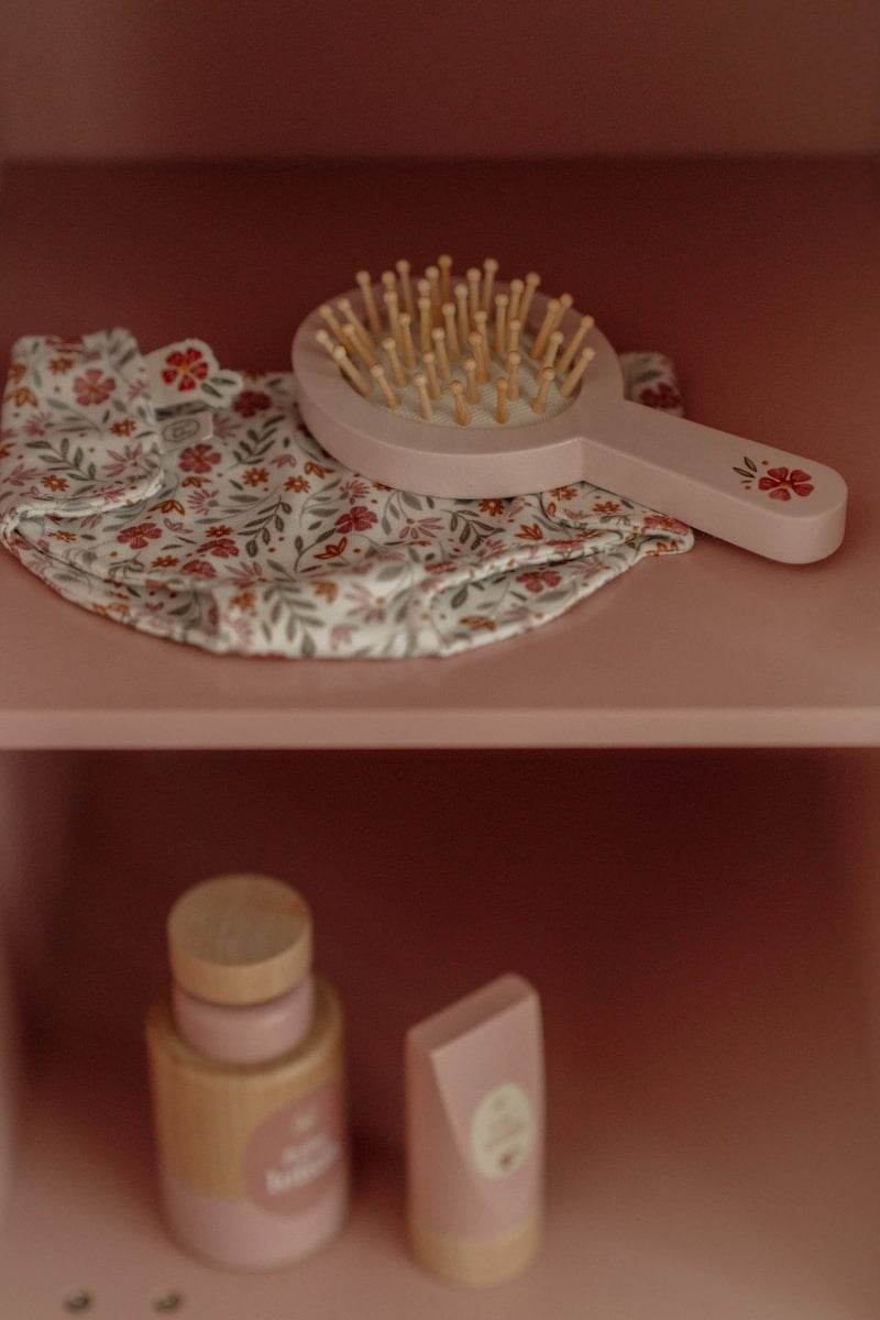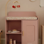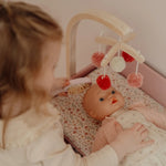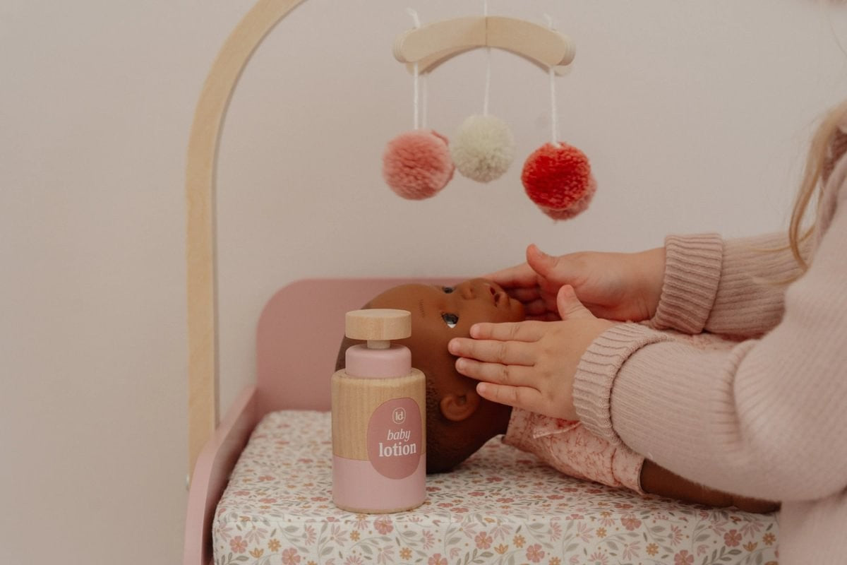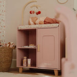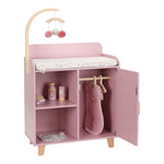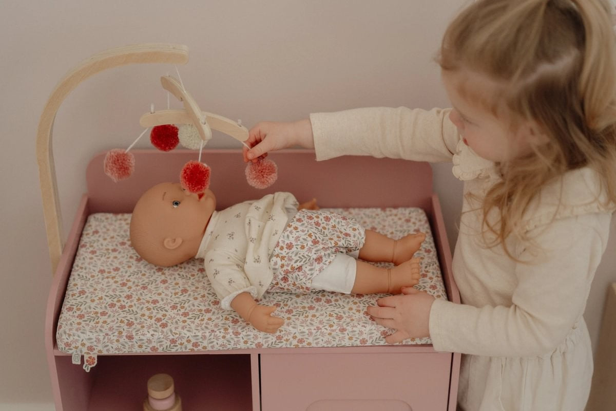 Este precioso cambiador para muñecas ofrece todo lo necesario para cuidar a tu muñeca con cariño. El set incluye un móvil, un cambiador suave con un diseño encantador y varios accesorios de madera para el cuidado. Además, el cambiador incluye una cortina, un saco de dormir y bonitas perchas para guardar prácticamente toda la ropa de tu muñeca. El armario ofrece espacio adicional para guardar todo lo esencial, asegurando que tu muñeca esté siempre bien cuidada.