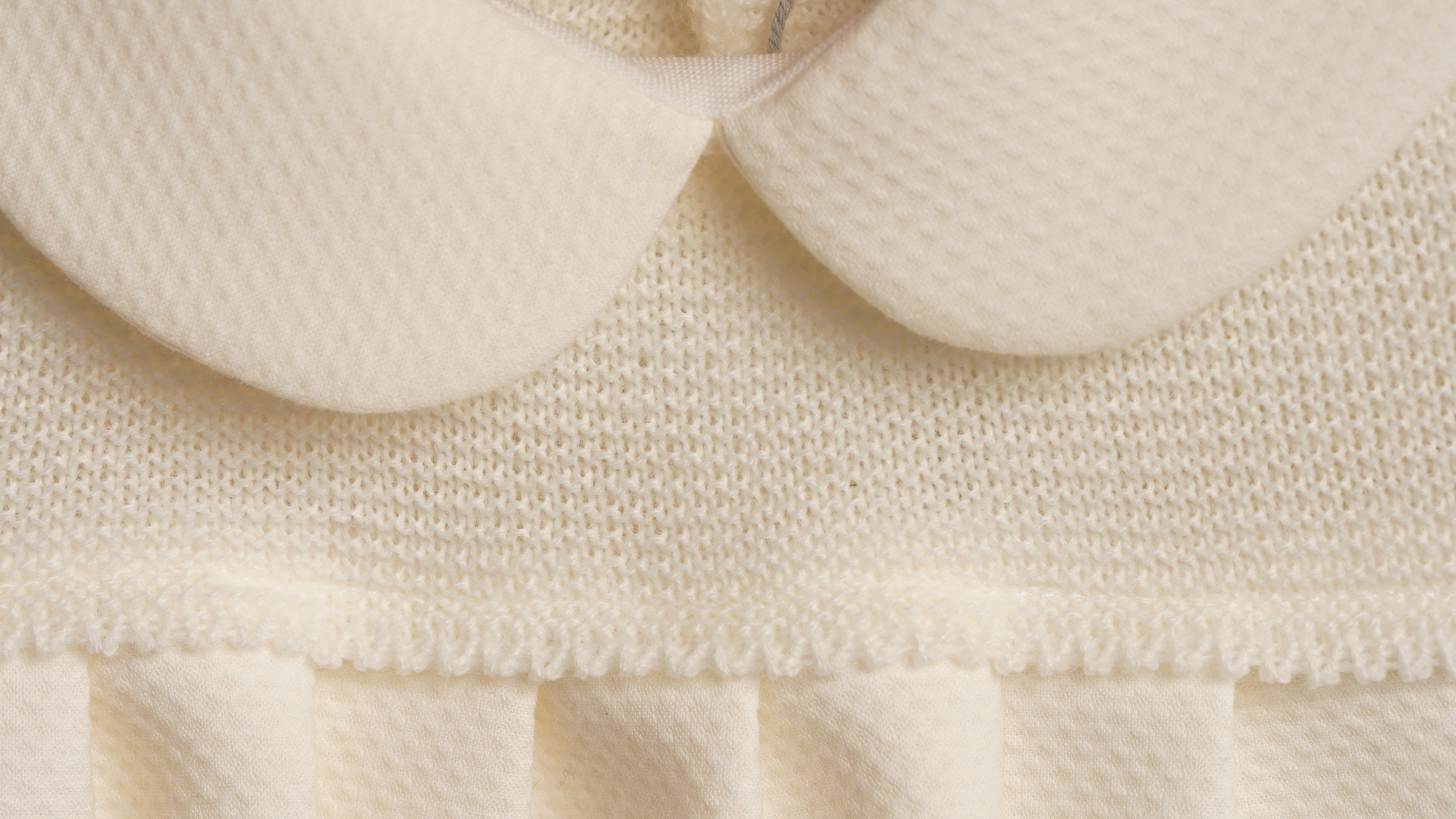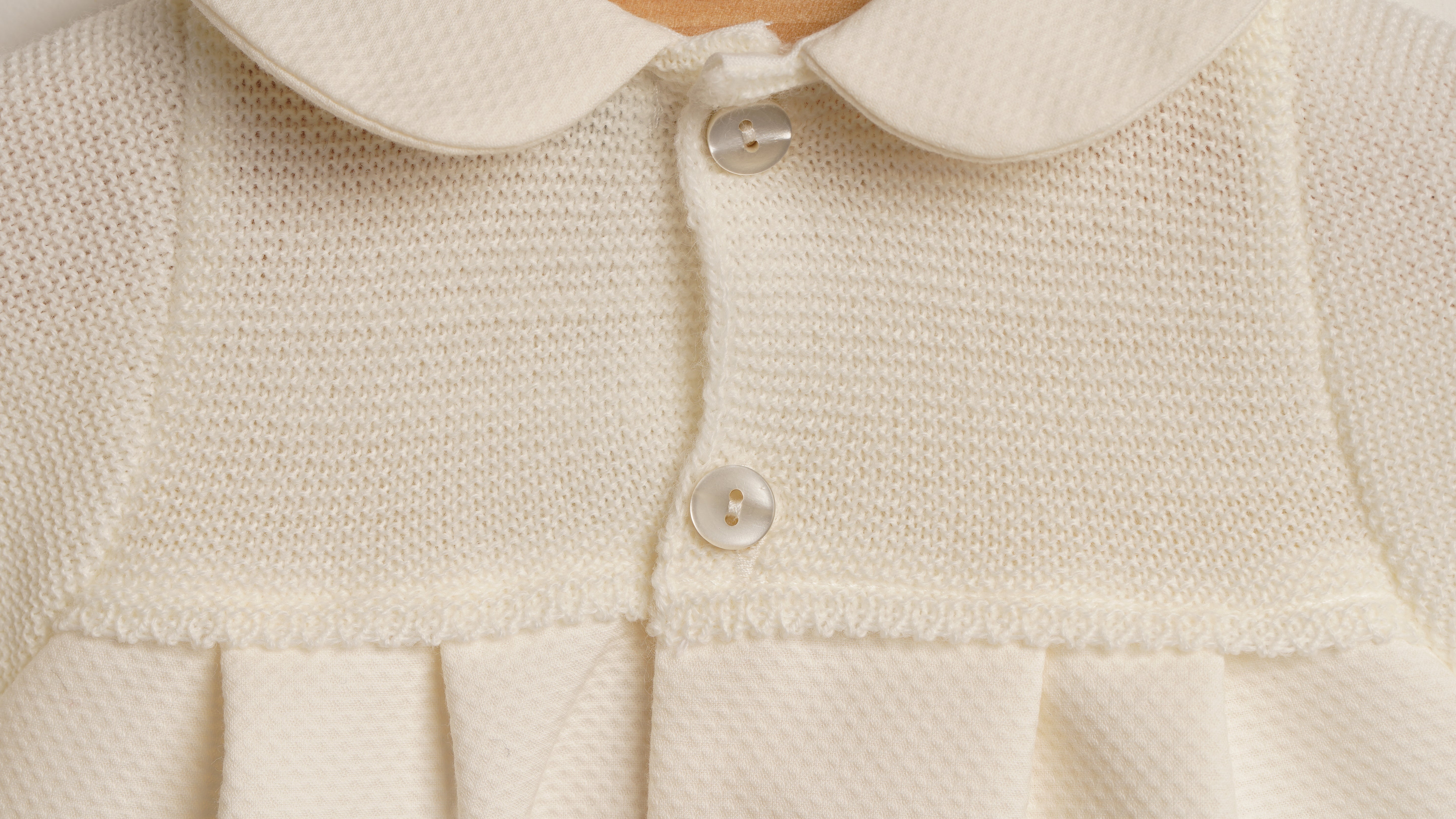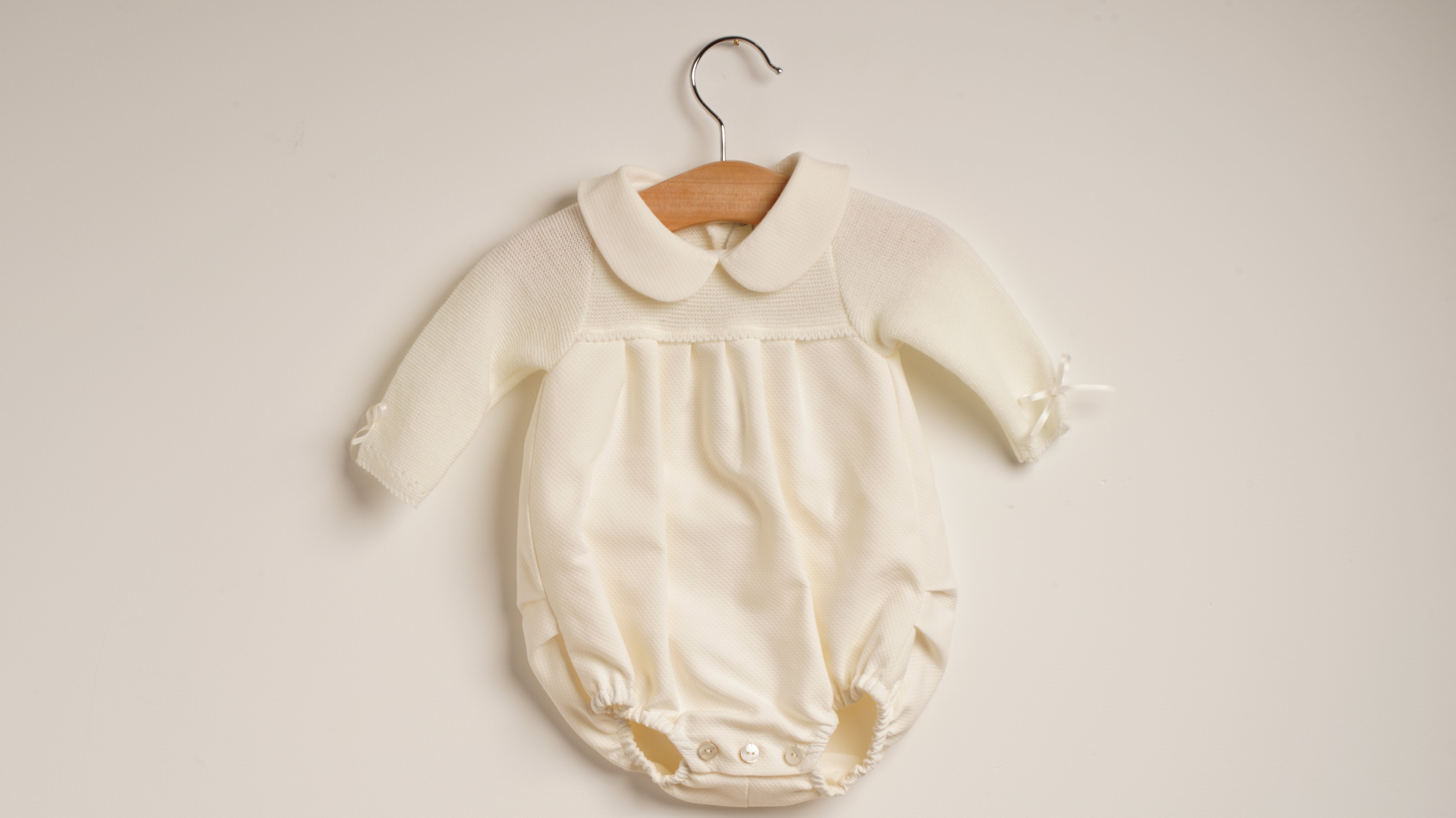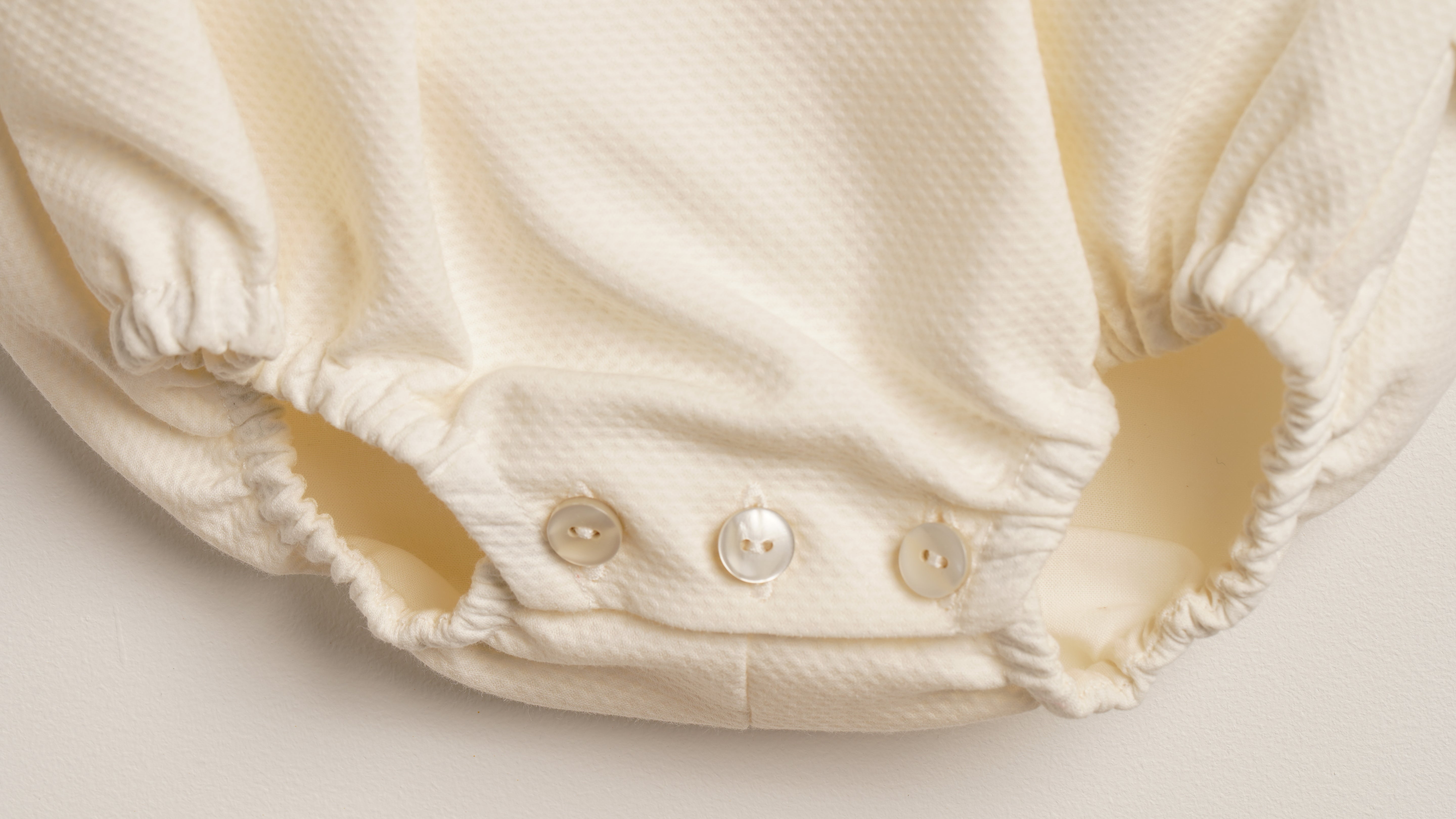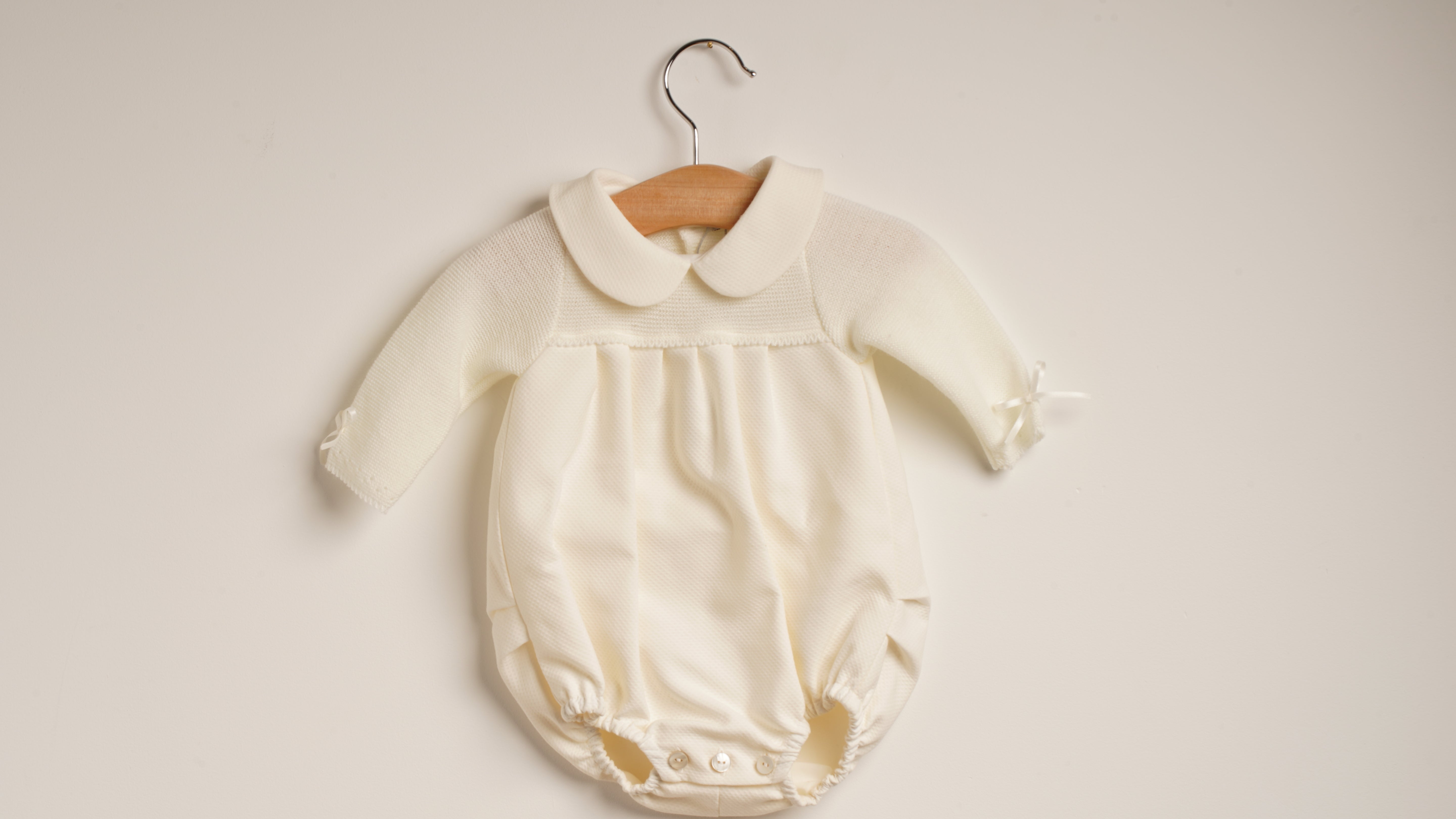 Pelele color hueso que combina tela piqué y punto. Lleva botones nácar en la parte de atrás y en la parte de abajo para facilitar el cambio.