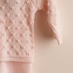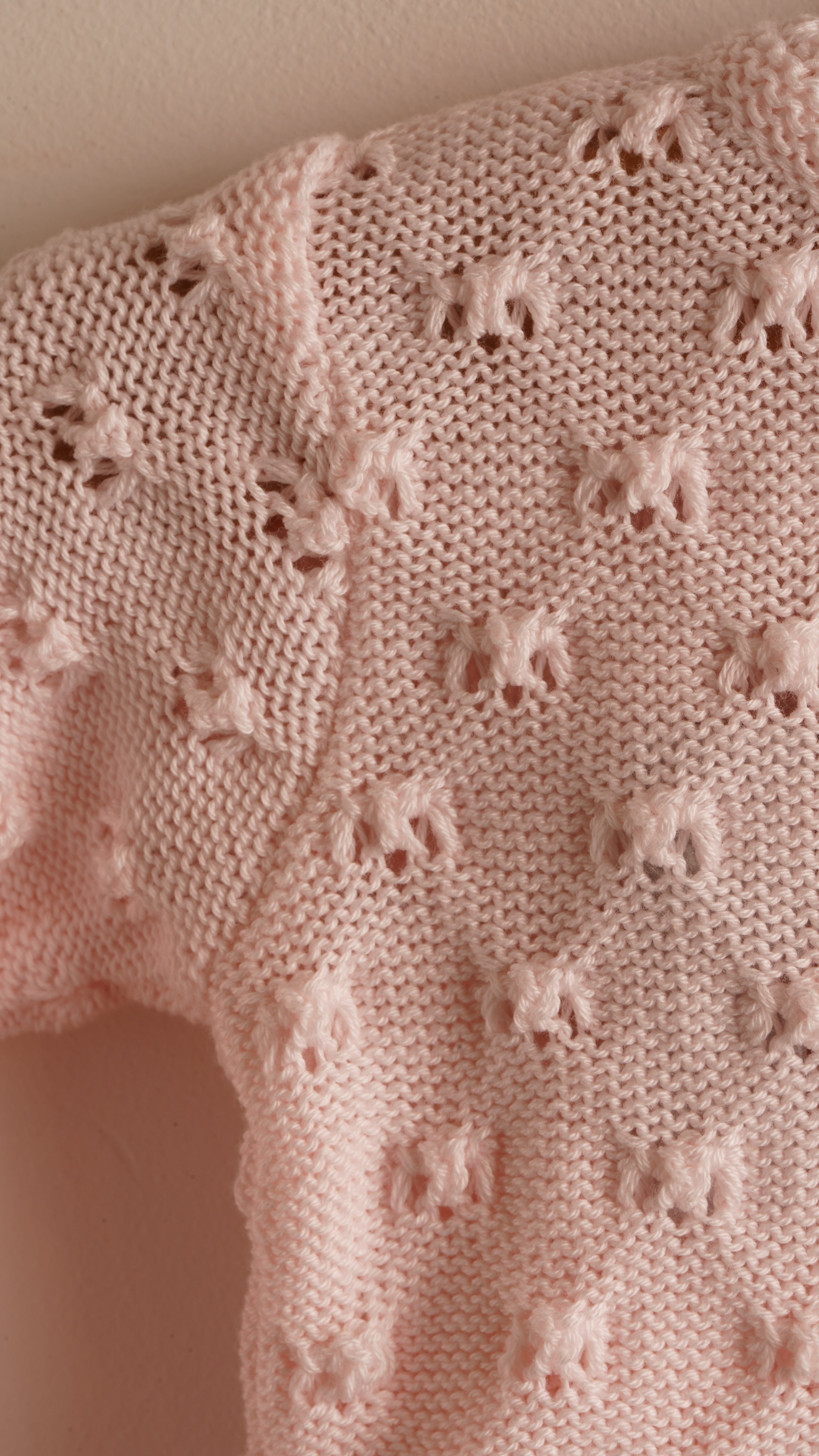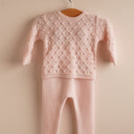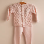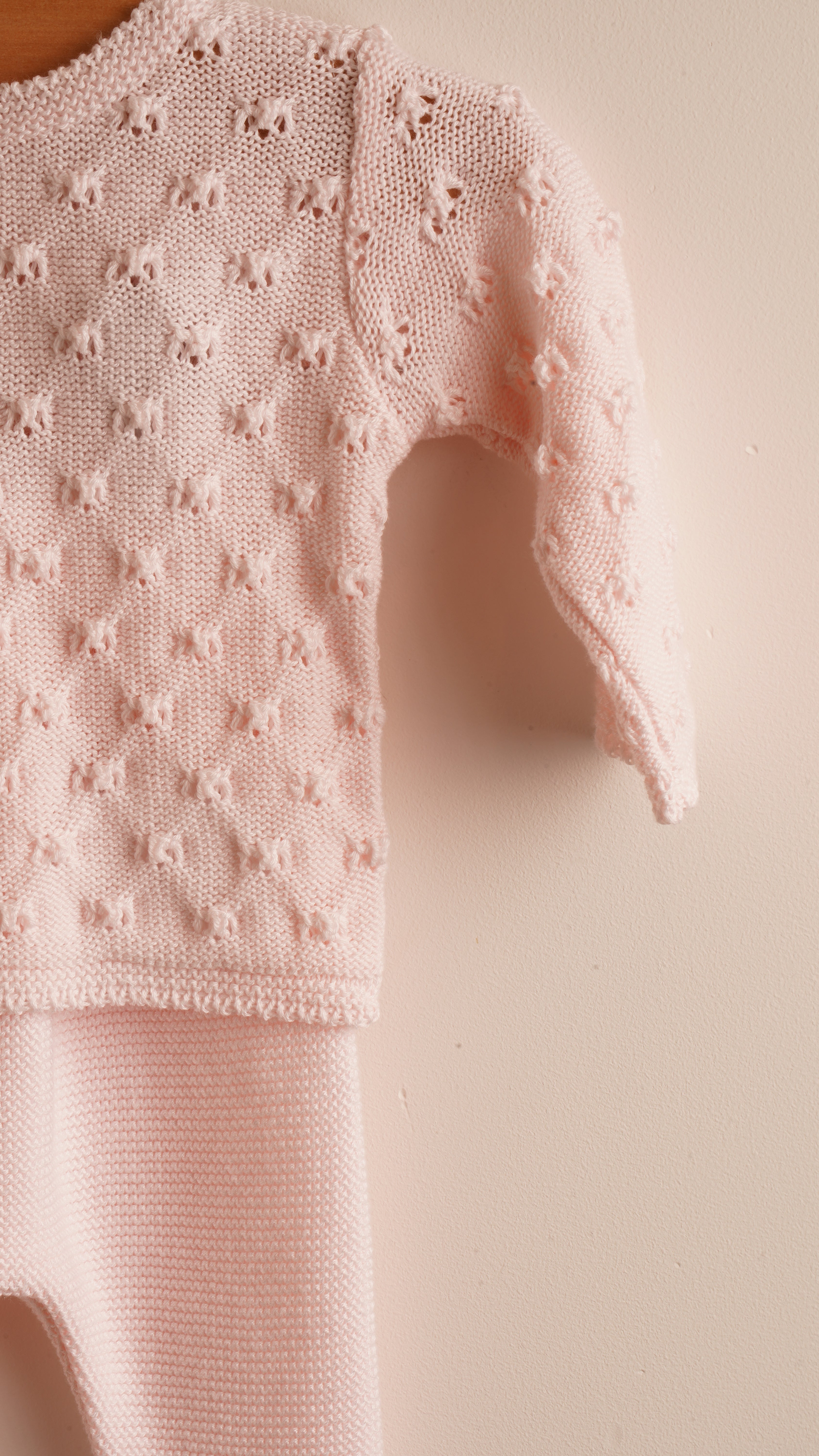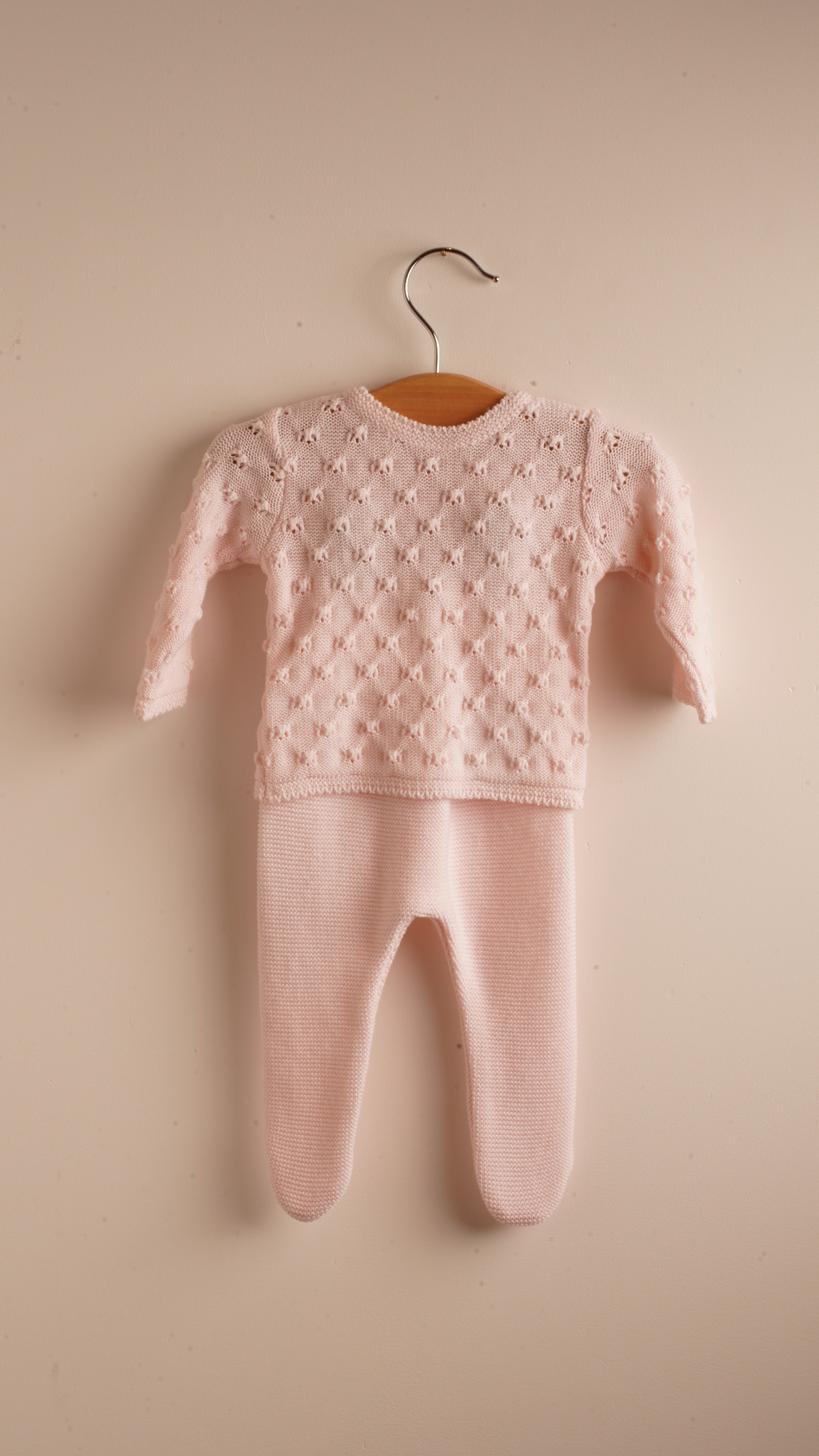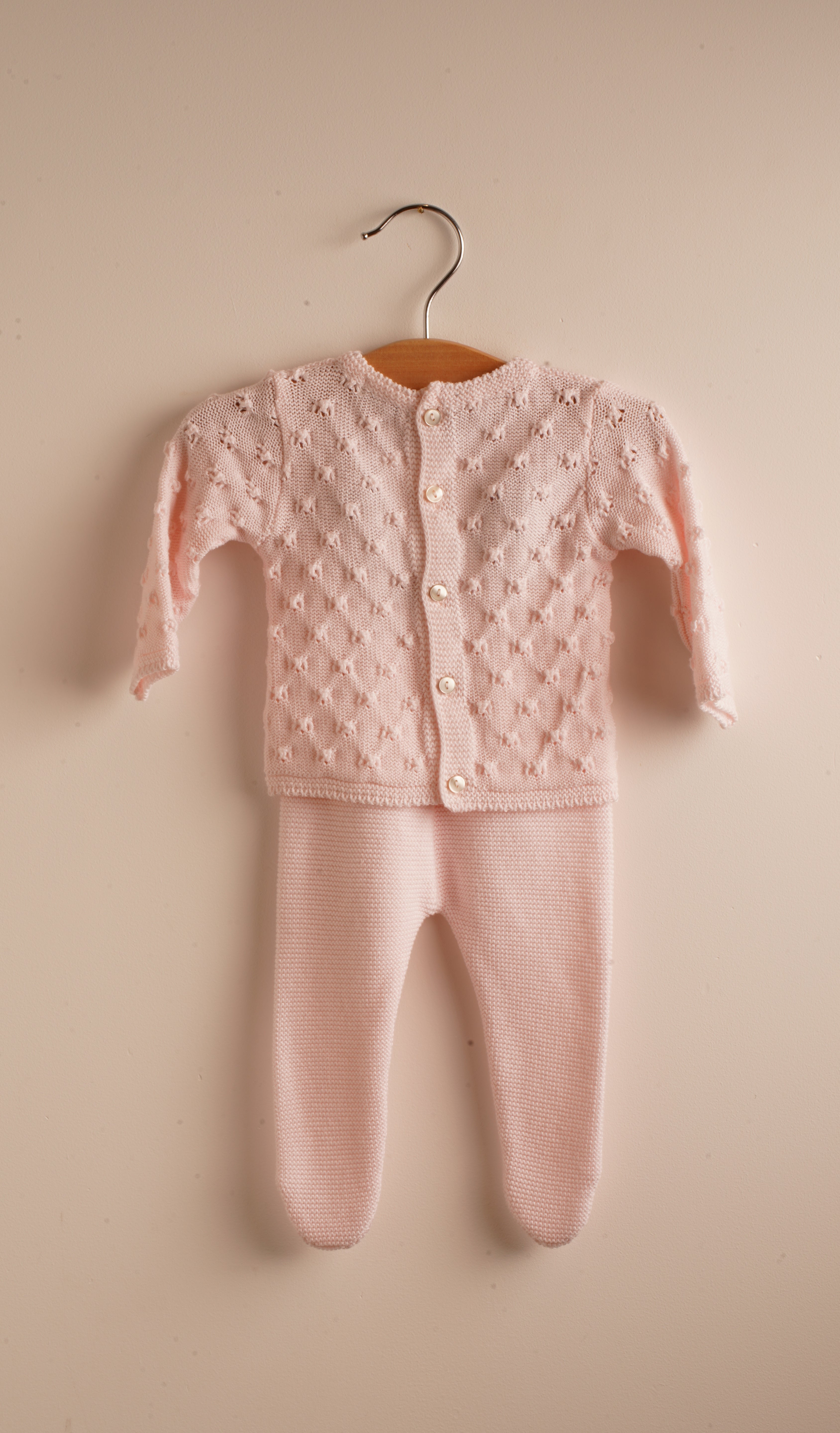 Este conjunto de punto rosa es ideal para salir del hospital o para vestir a tu bebé hasta que cumpla un añito. Está compuesto de un jersey con botones nácar en la parte atrás y una polaina a juego. Hecho de hilo algodón, por lo cual es perfecto para primavera verano. Combínalo con la capota y la mantita a juego.