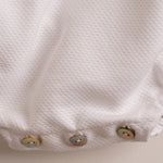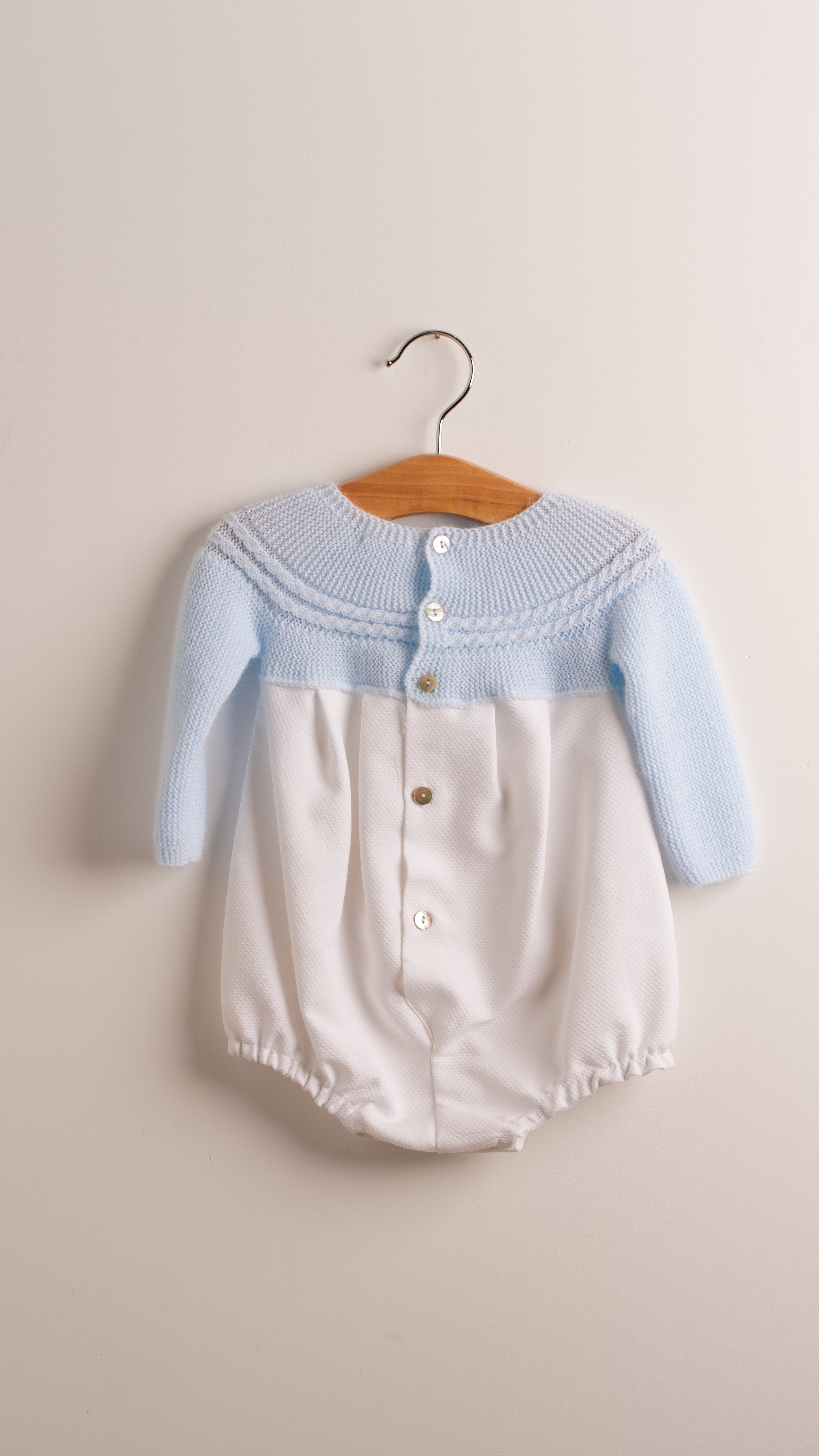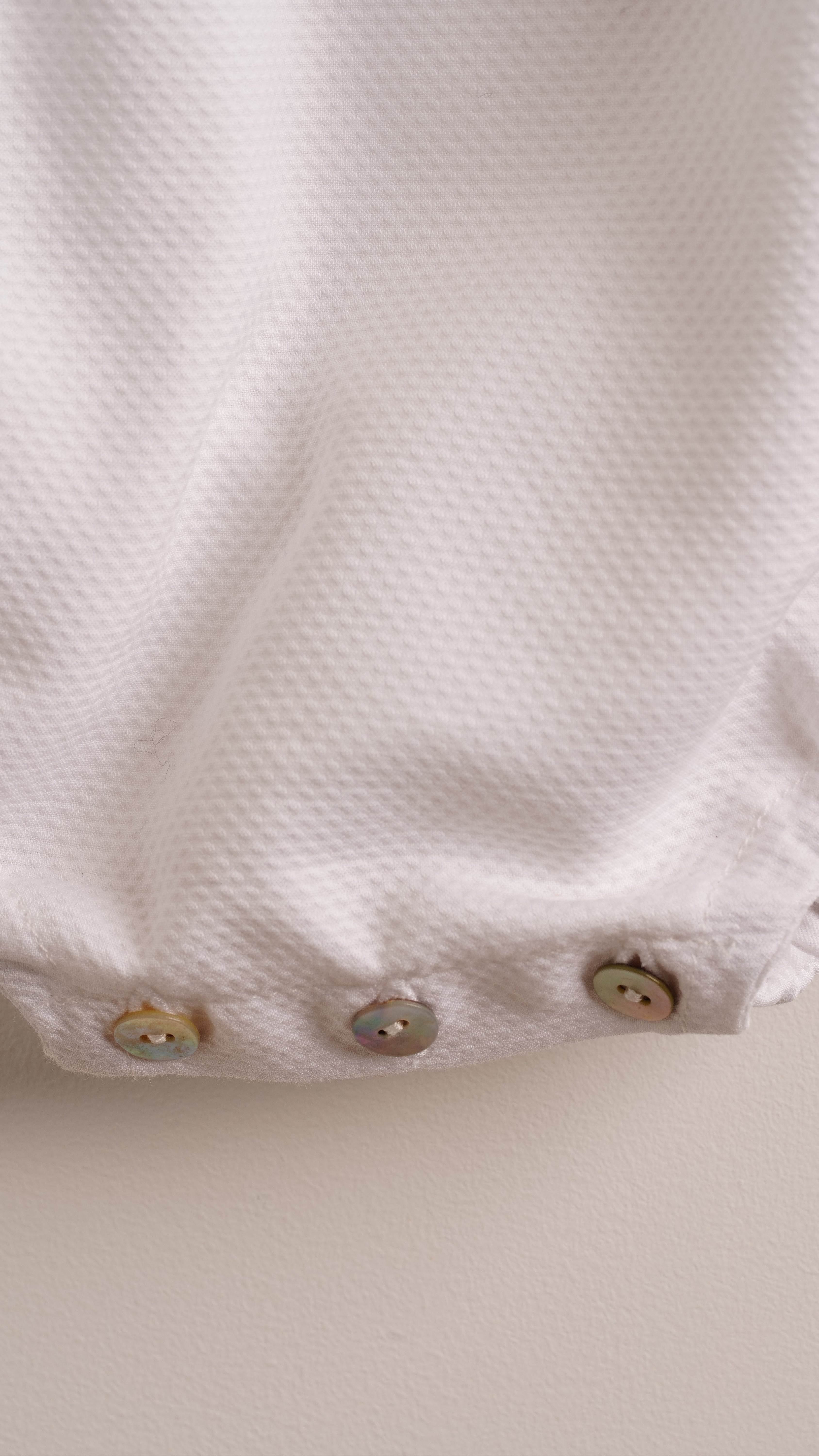 Fabricado de la tela piqué color blanco con punto celeste en la parte arriba. Lleva botones en la parte atrás y abajo para facilitar el cambio.