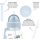 Esta botella tiene una pajita de silicona abatible que sale automáticamente cuando se abre la tapa y es ideal para llevar al cole.
