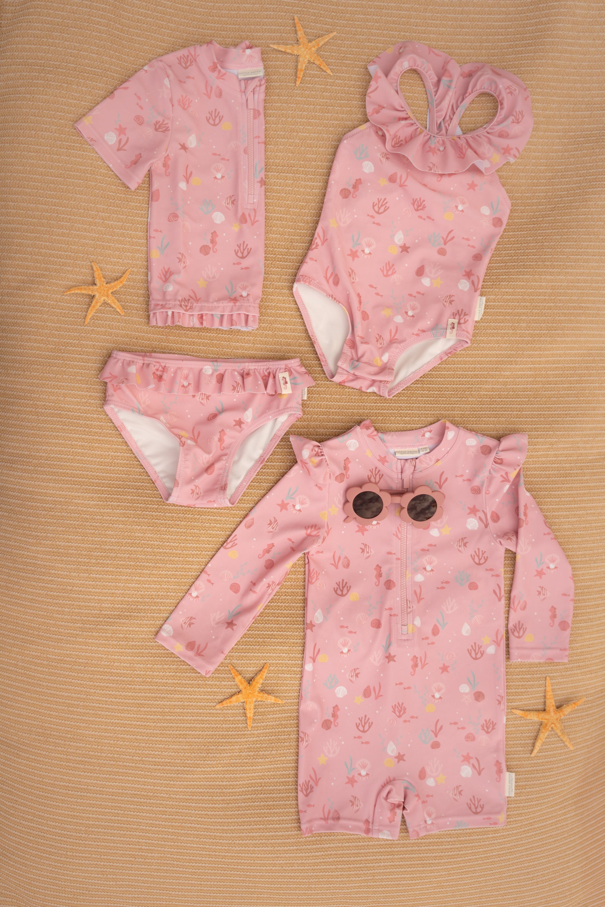 Sumérgete en el verano con este adorable traje de baño, con el encantador diseño Ocean Treasures. Presenta una preciosa mezcla de rosa claro con caballitos de mar, corales y conchas marinas, creando un tema submarino maravilloso.