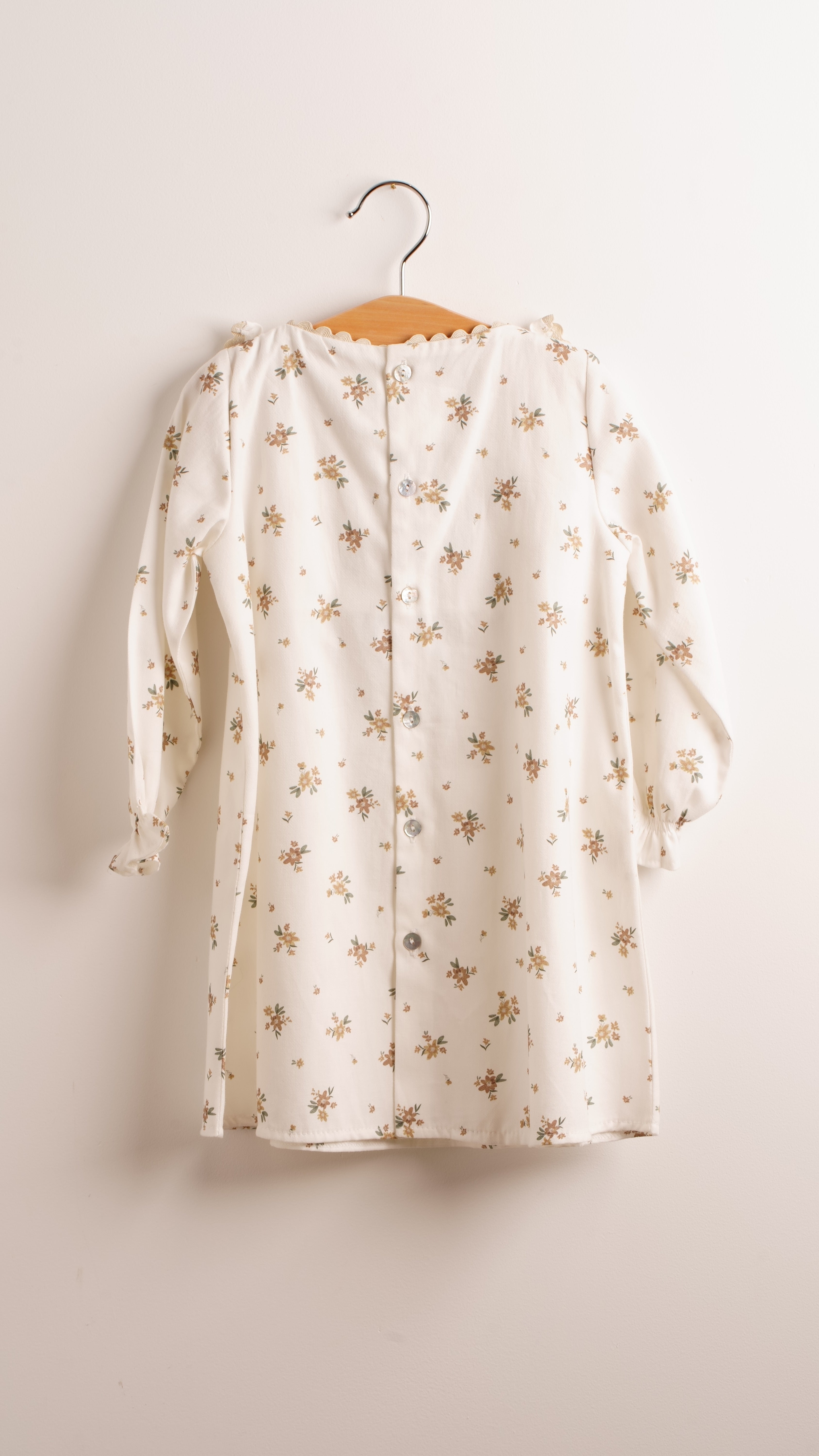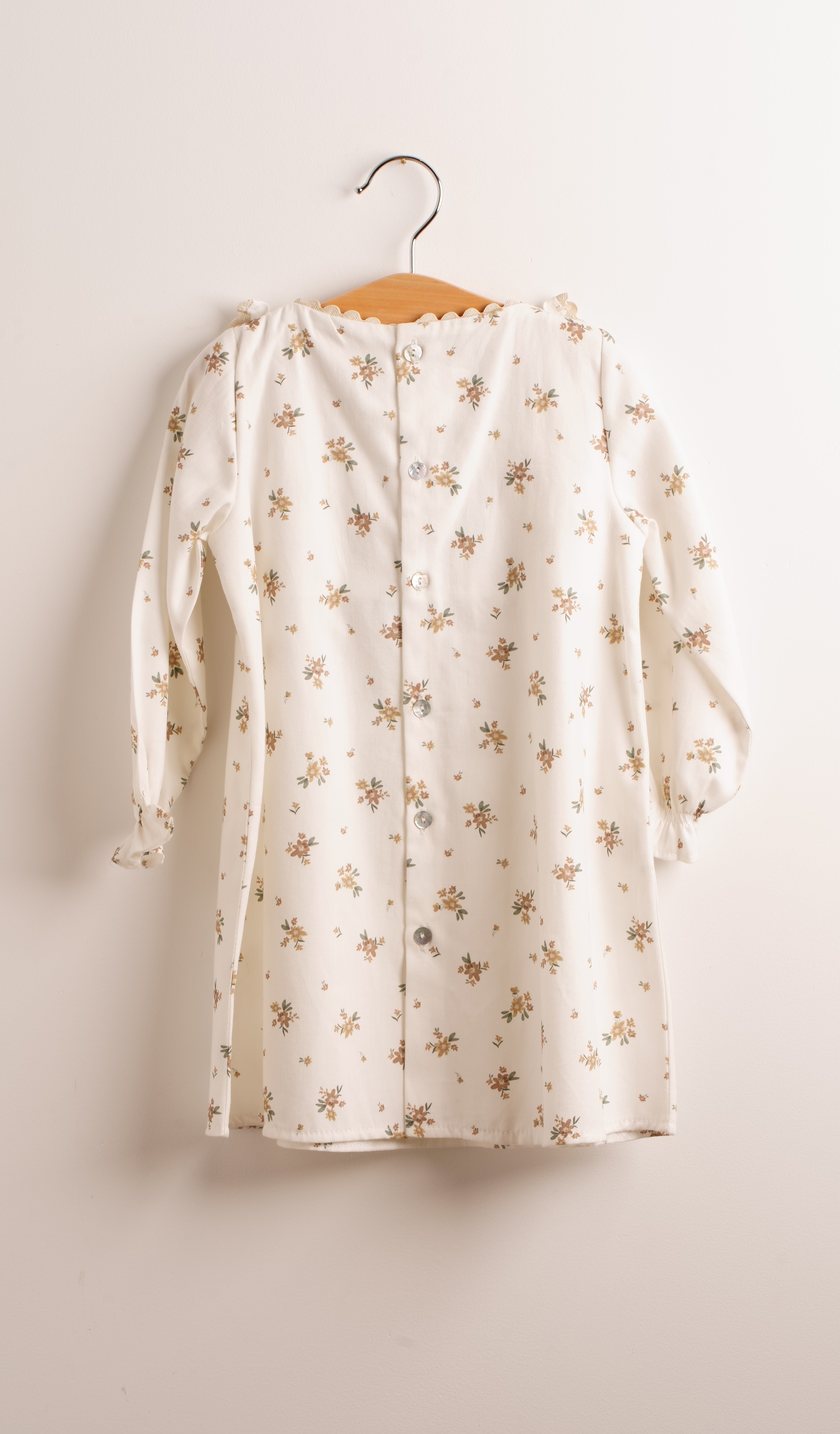 Precioso vestido de color blanco con flores y detalles en tonos beige. Lleva botones en la parte atrás.