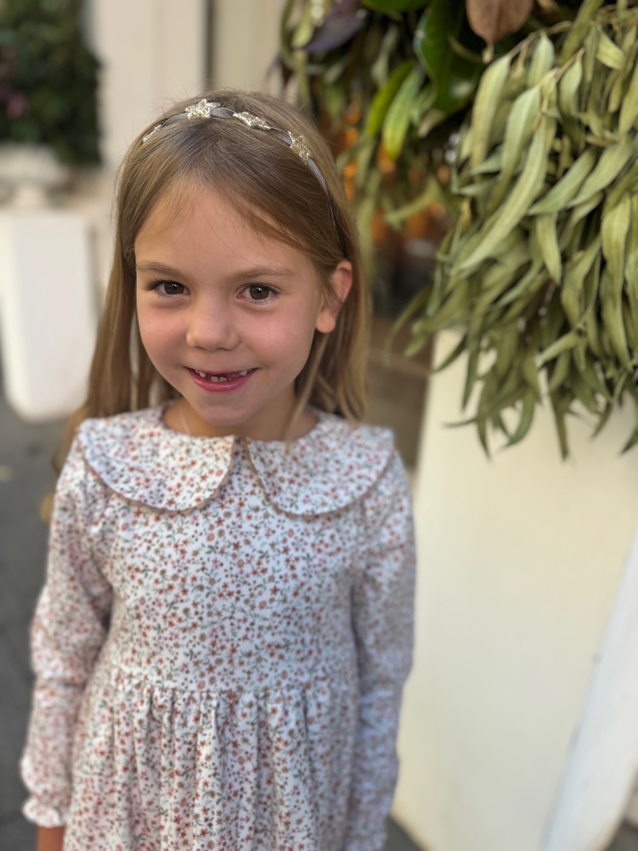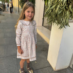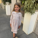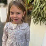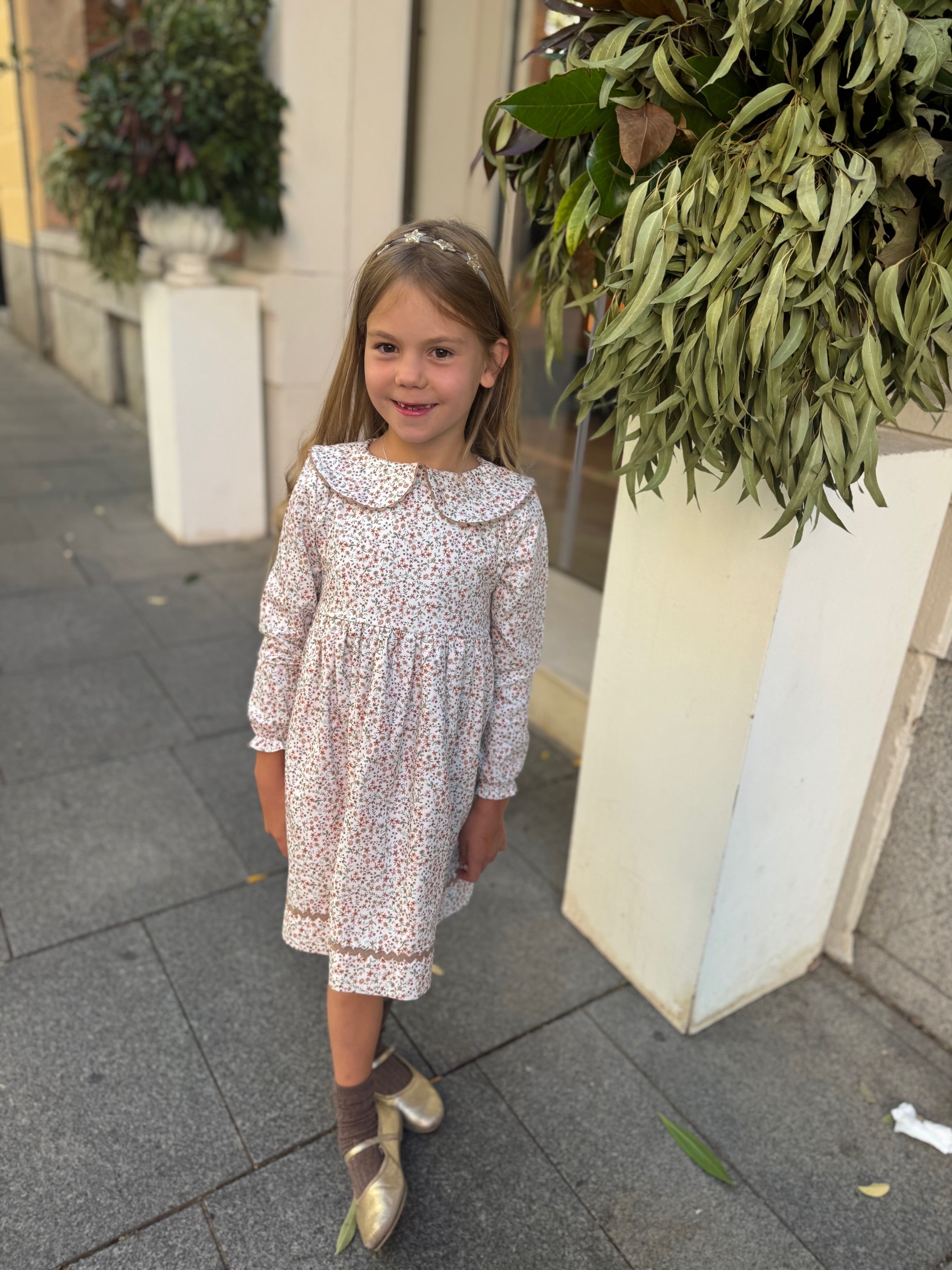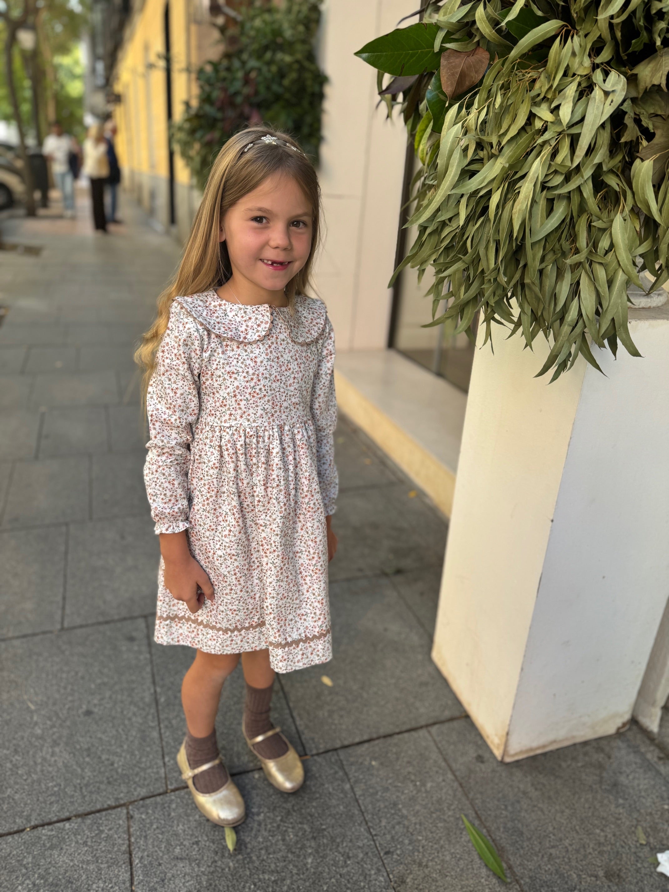 Vestido con estampado de flores, cuello grande y detalles en tonos beige. Ideal para cada día o para una ocasión especial.