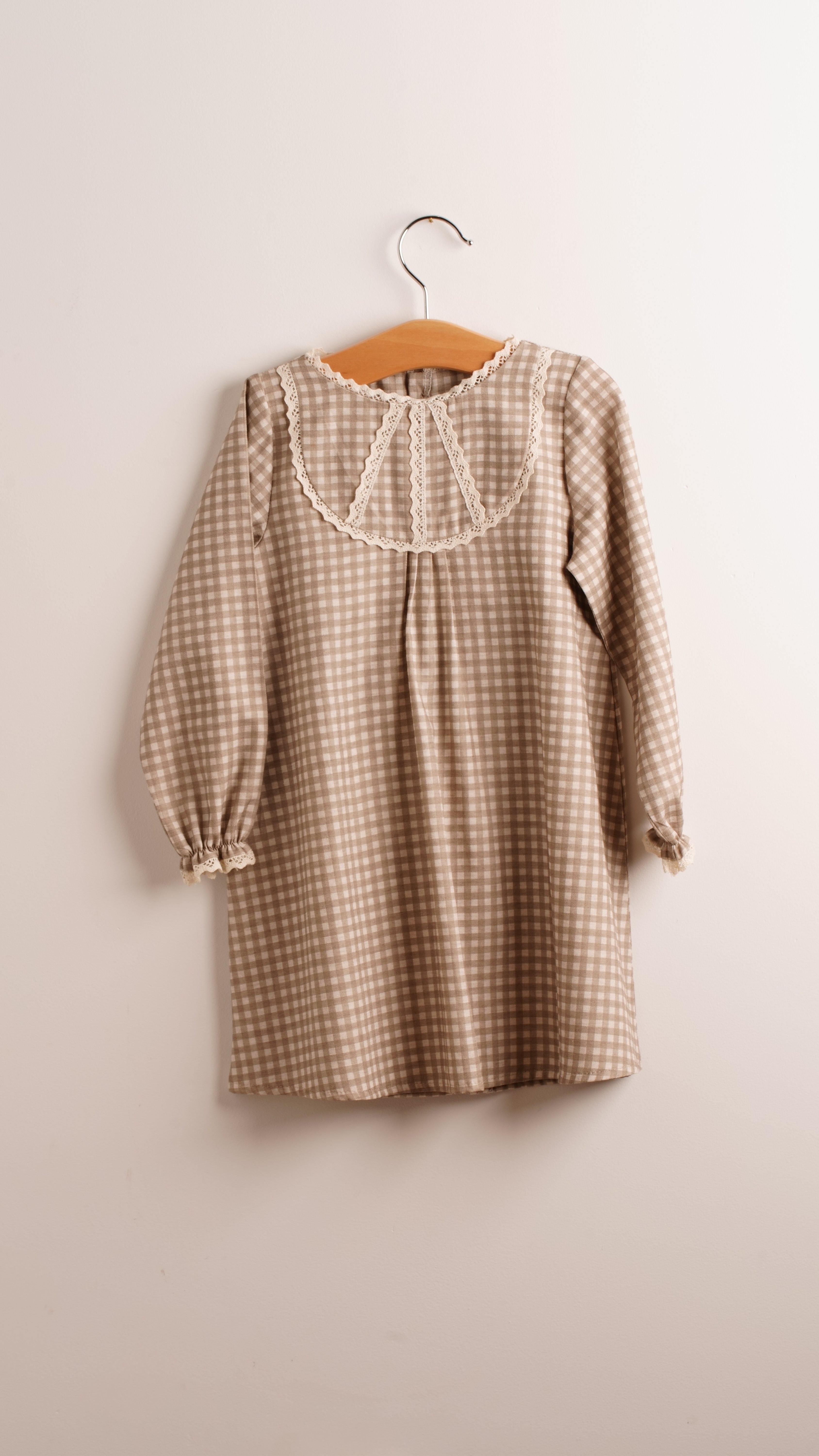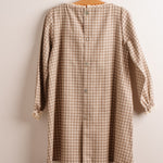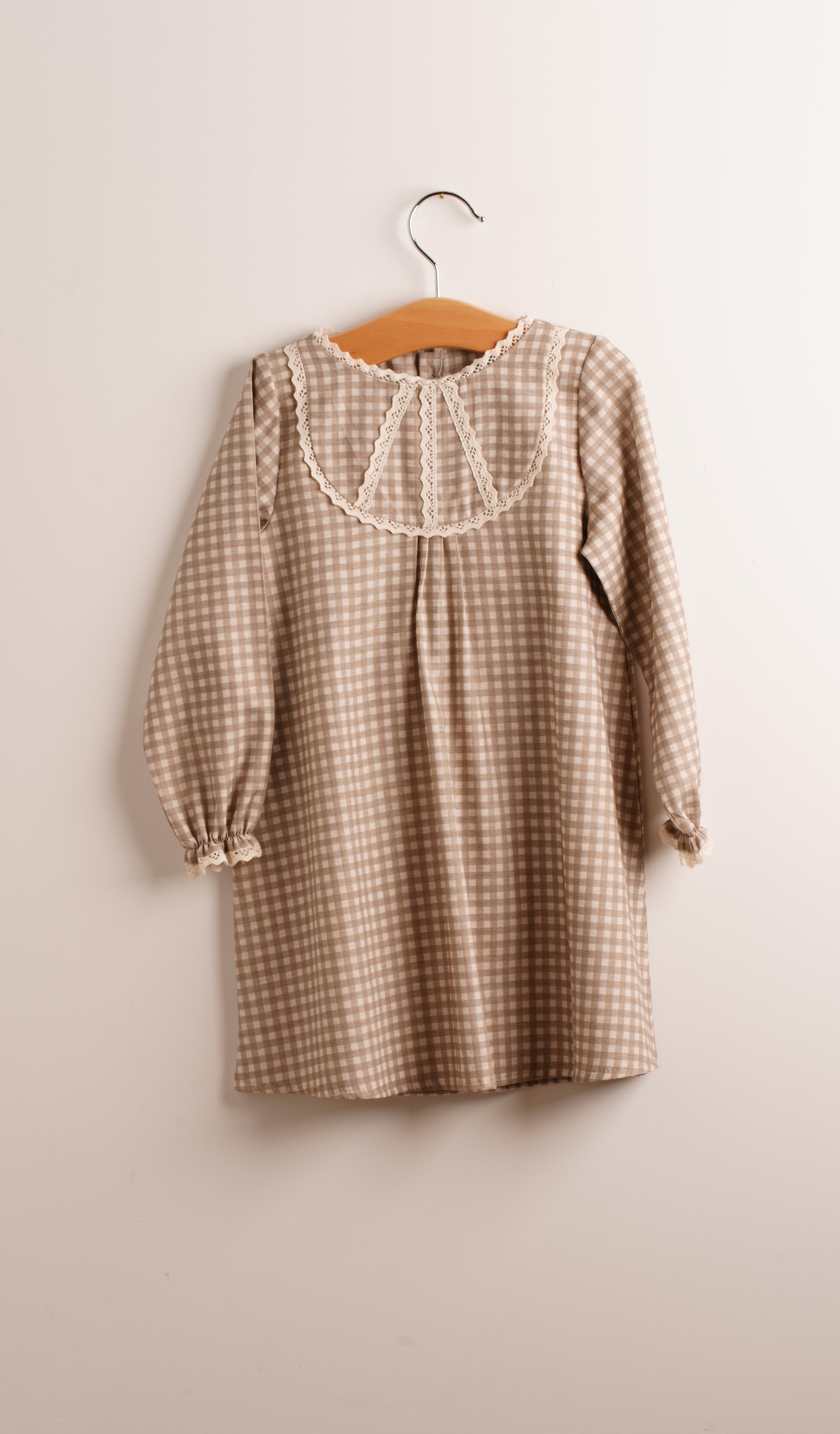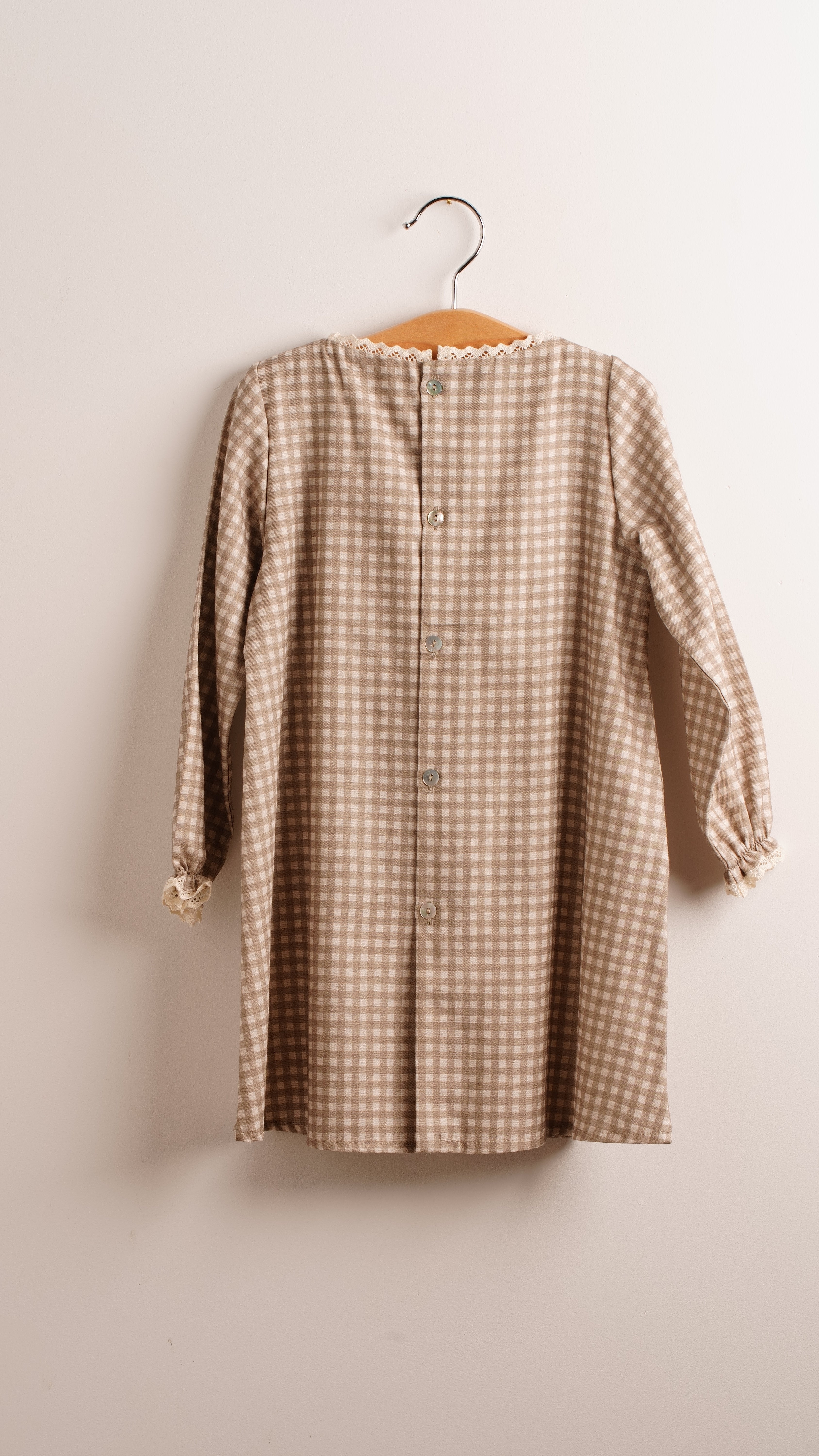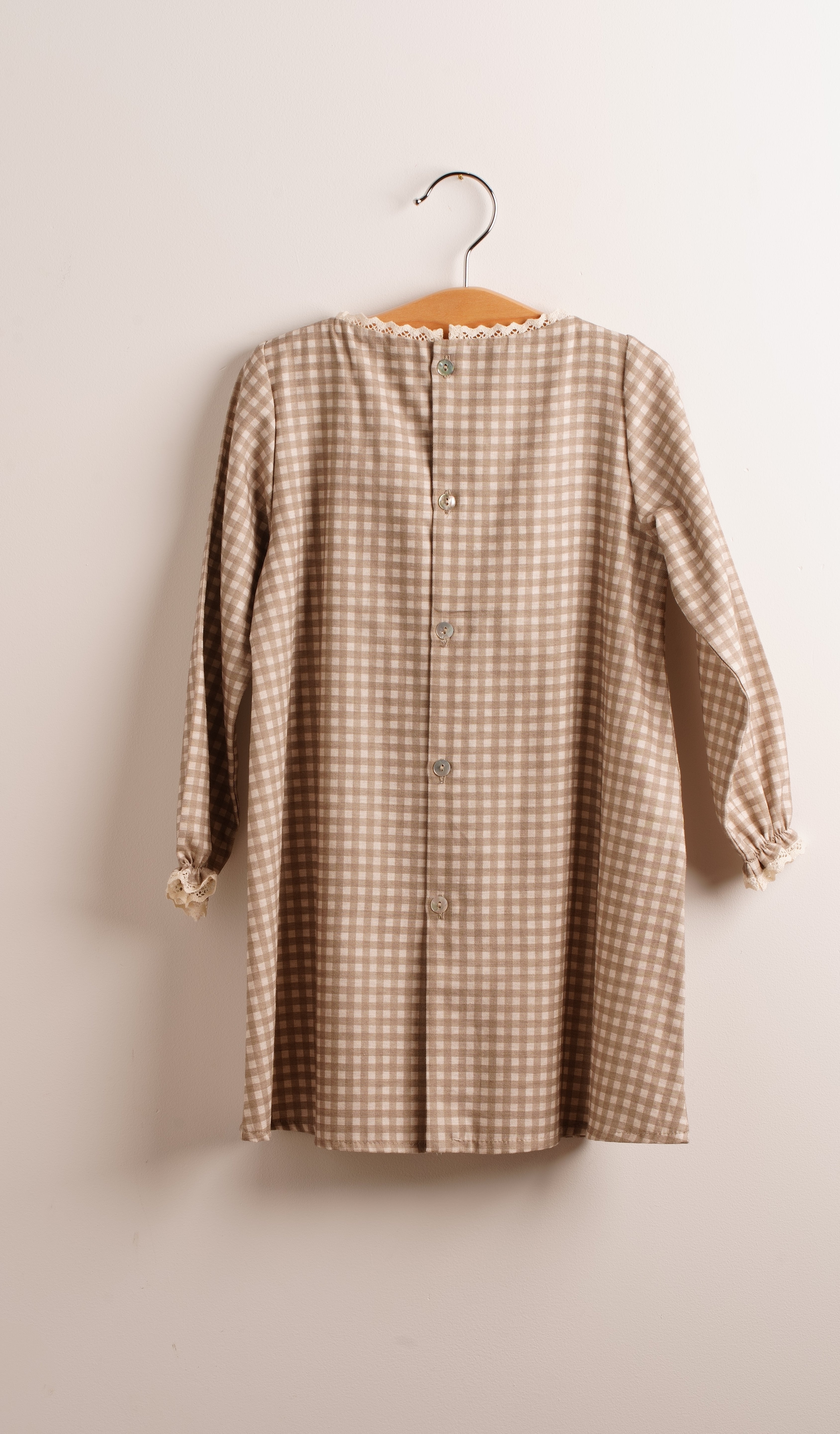 Precioso vestido de cuadritos beige y blanco hueso con detalles en color hueso. Lleva botones en la parte atrás.