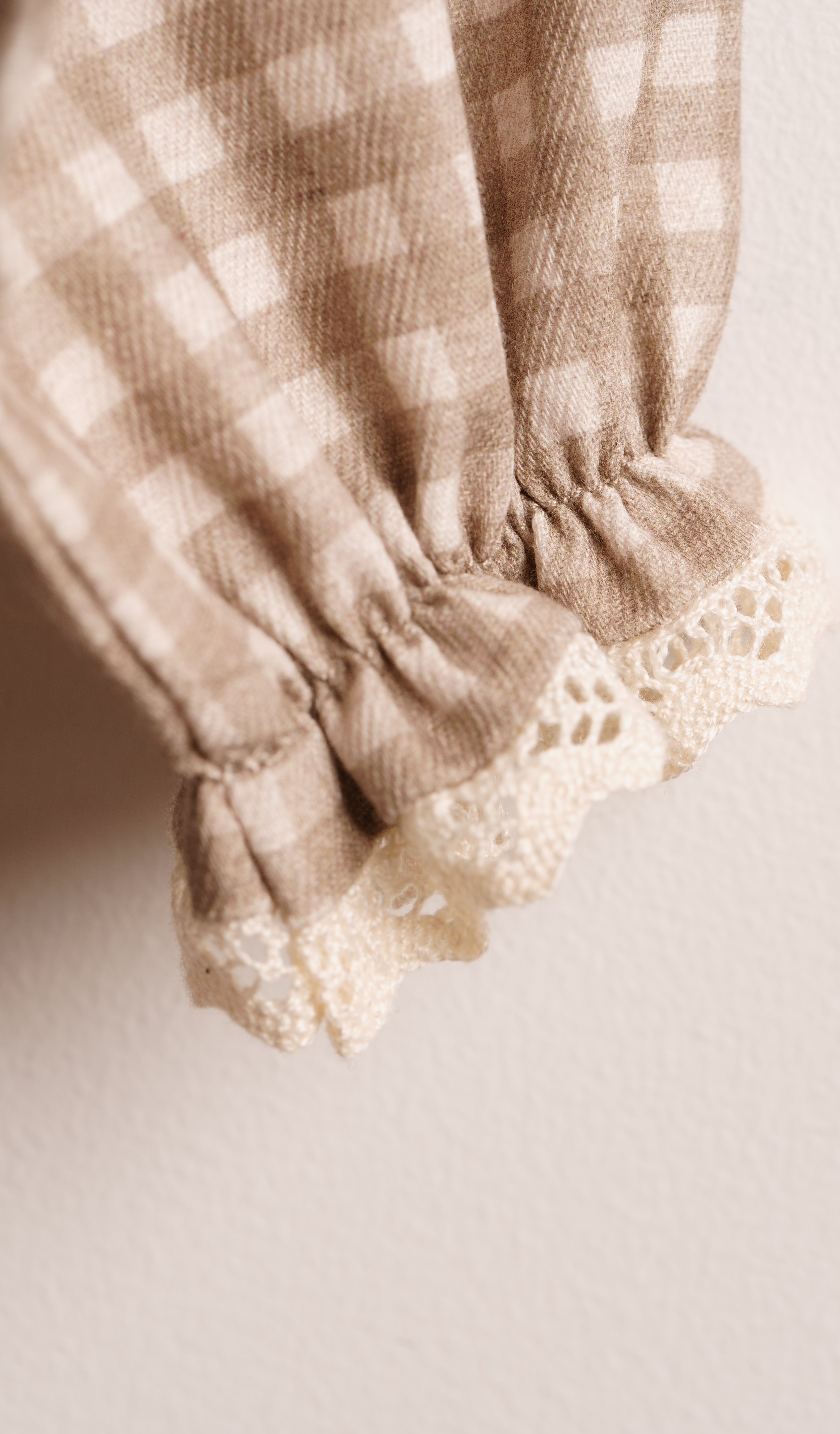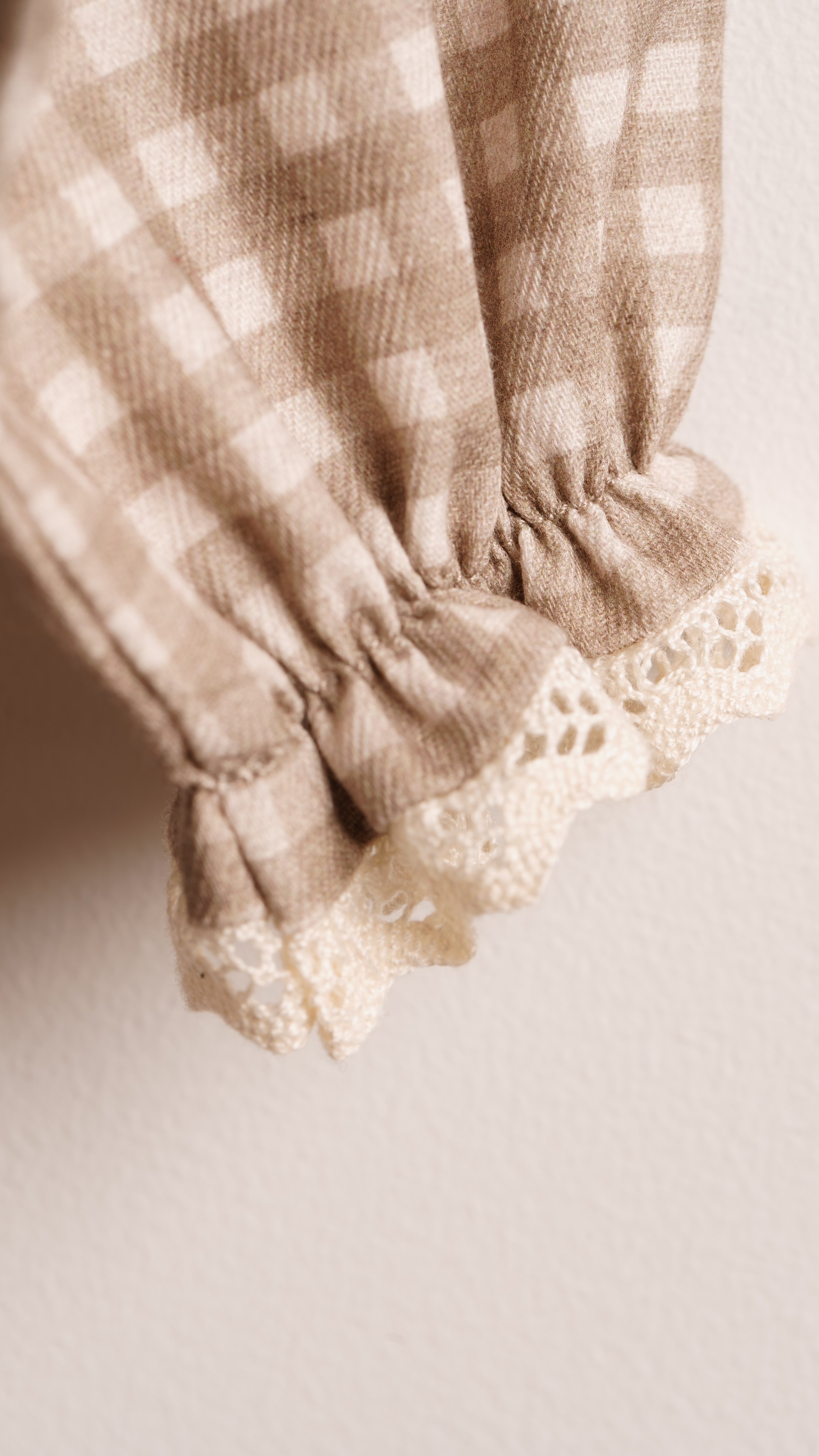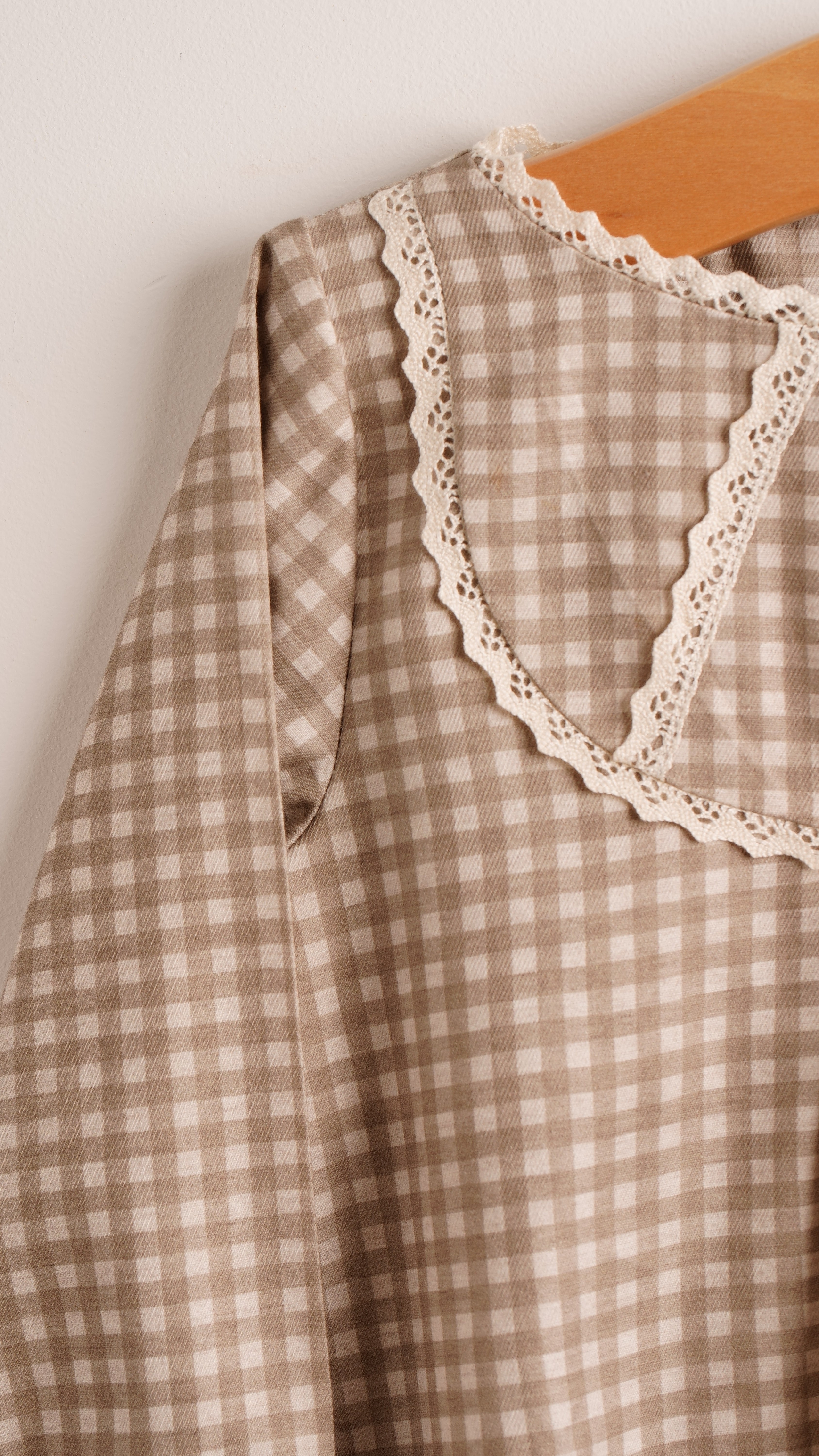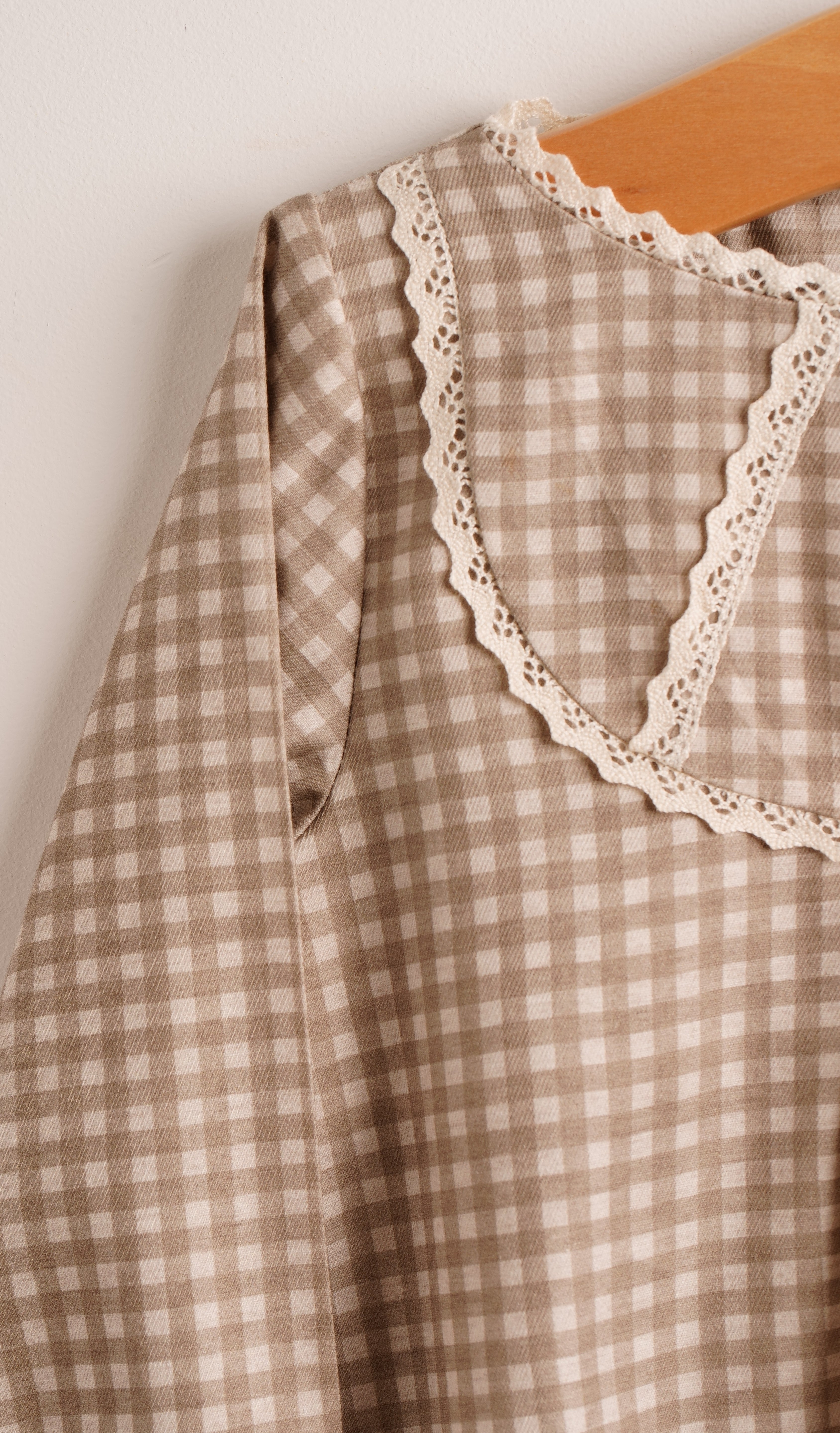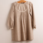 Precioso vestido de cuadritos beige y blanco hueso con detalles en color hueso. Lleva botones en la parte atrás.