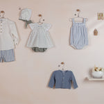 Confeccionada en 100% algodón y fabricada en España, cada prenda ha sido diseñada cuidando los detalles, los tejidos y la comodidad de los más pequeños. Las rayas en tonos azules aportan ese aire marinero elegante que nunca pasa de moda, ideal para verano, celebraciones y ocasiones especiales.