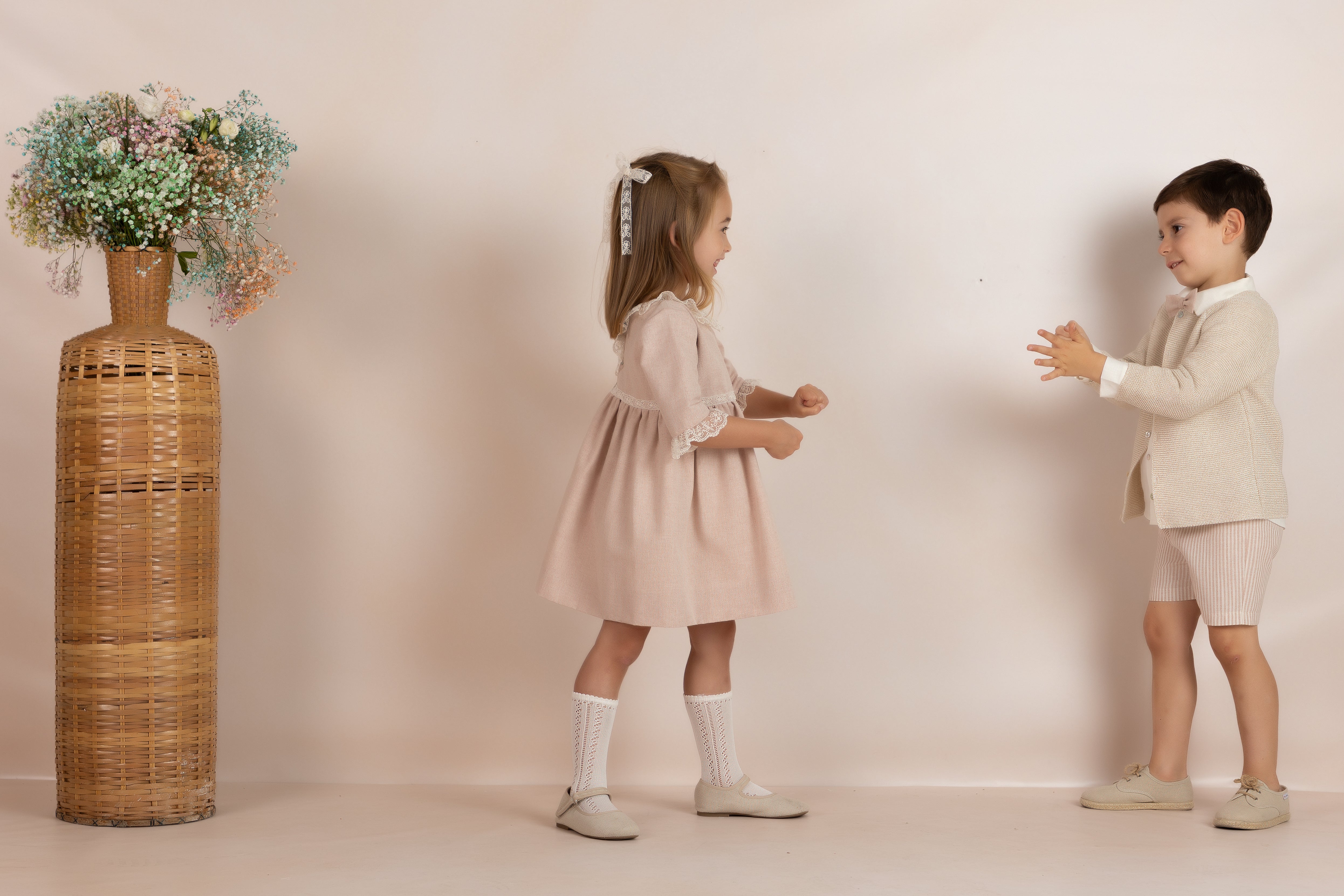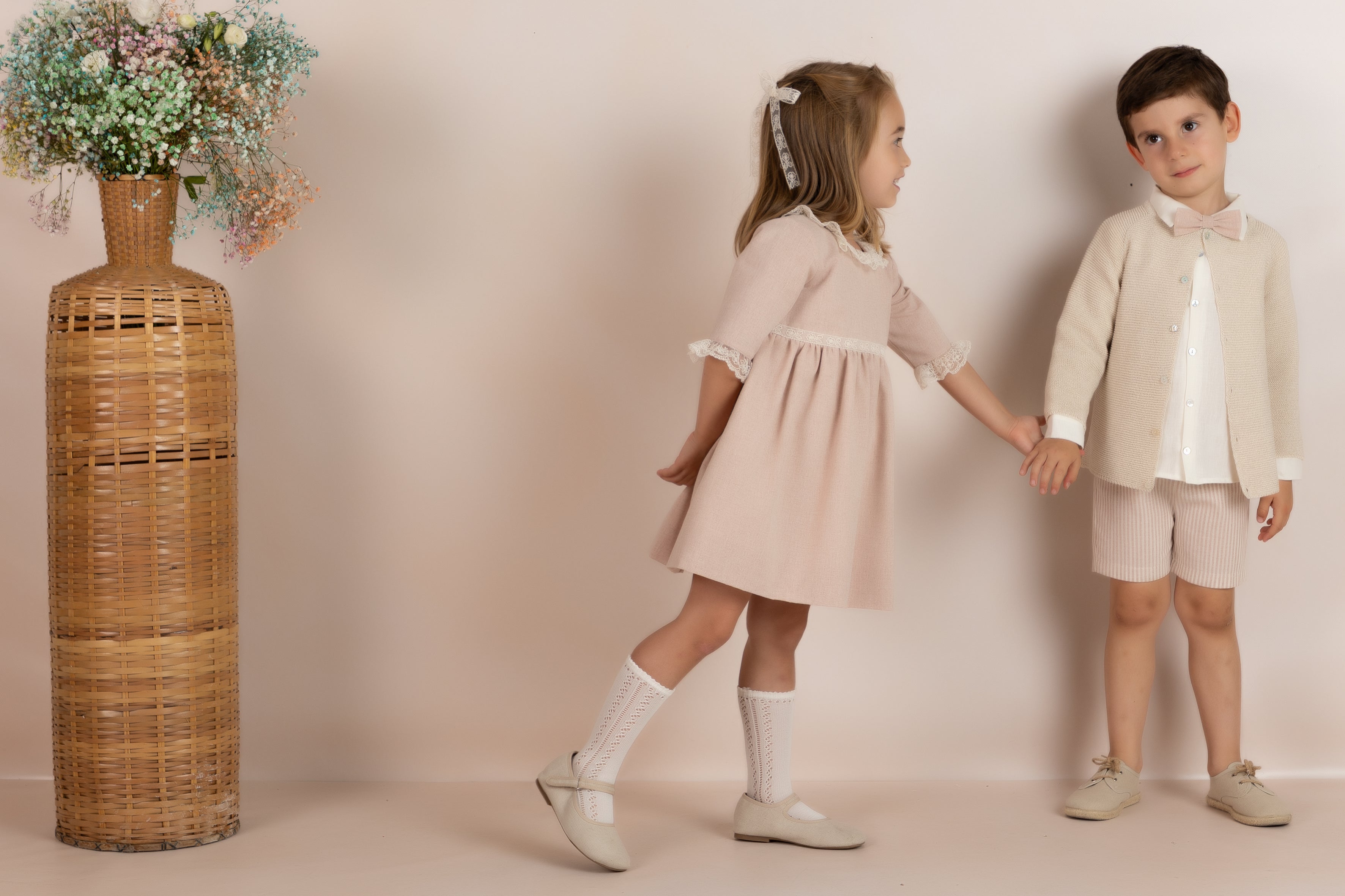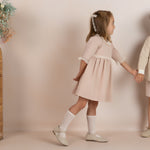 Elegante vestido de ceremonia para niña en un delicado tono rosa nude, ideal para ocasiones especiales como bodas, bautizos, comuniones o celebraciones familiares.